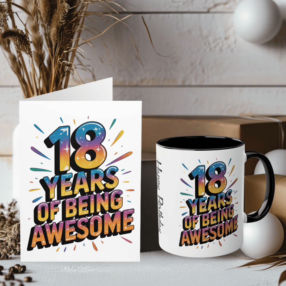18th Birthday Card, Celebrate your 18th birthday with this card and mug set, because let's face it, you're pretty awesome. Featuring the phrase "18 years of being awesome," this set is perfect for anyone who doesn't take themselves too seriously. Cheers to being legal (and awesome)!