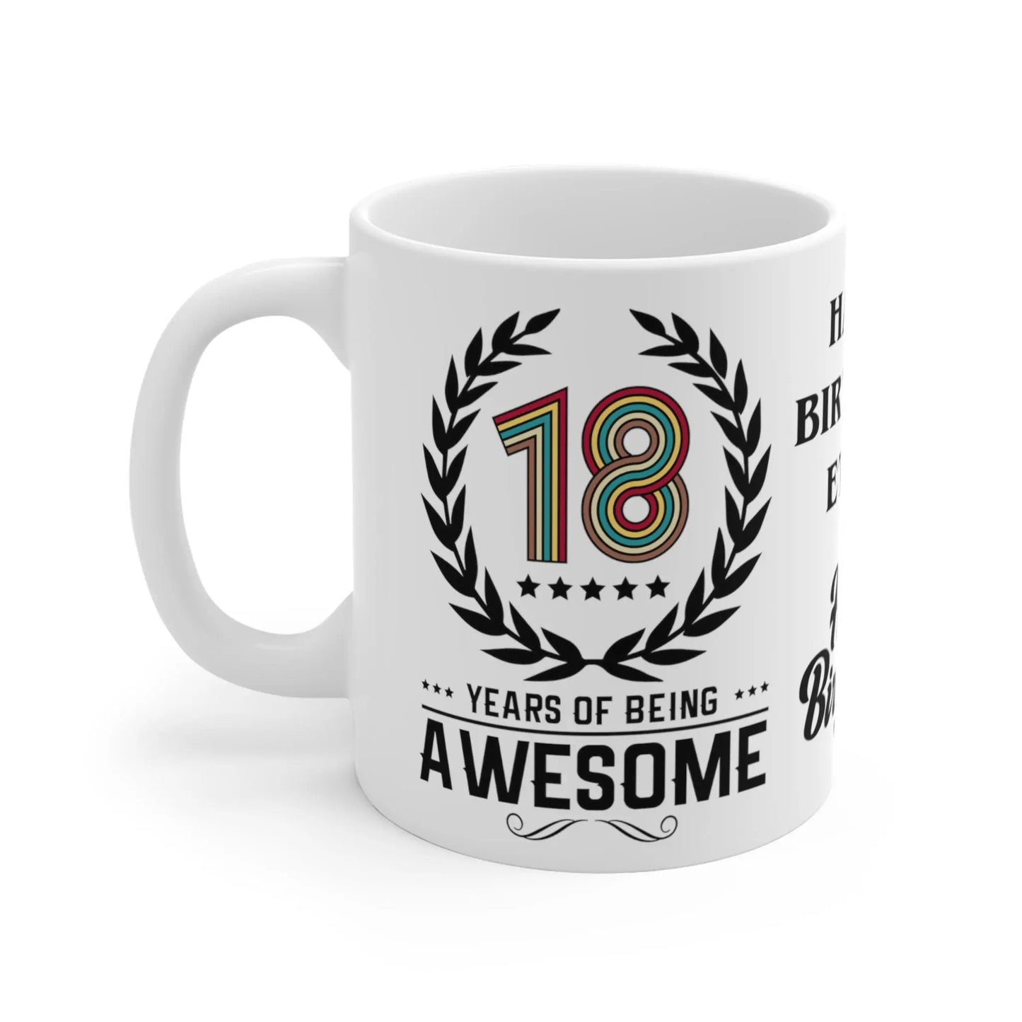18th Birthday Mug, Celebrate 18 years of awesomeness with our Personalised 18th Birthday Mug! This mug features a personalised design that highlights the recipient's journey towards greatness. Perfect for anyone who's turning 18 and ready to take on the world. (Caffeine not included!)