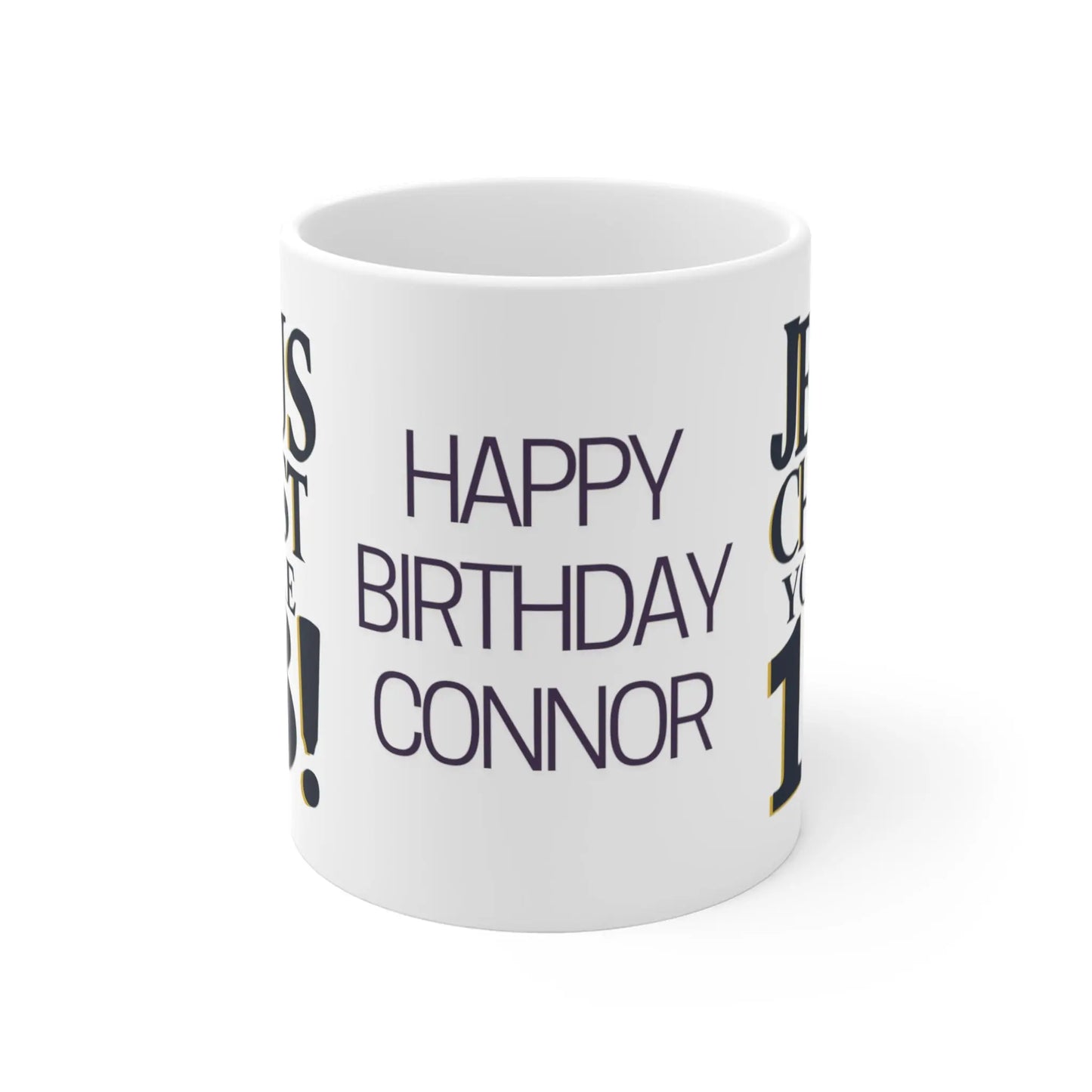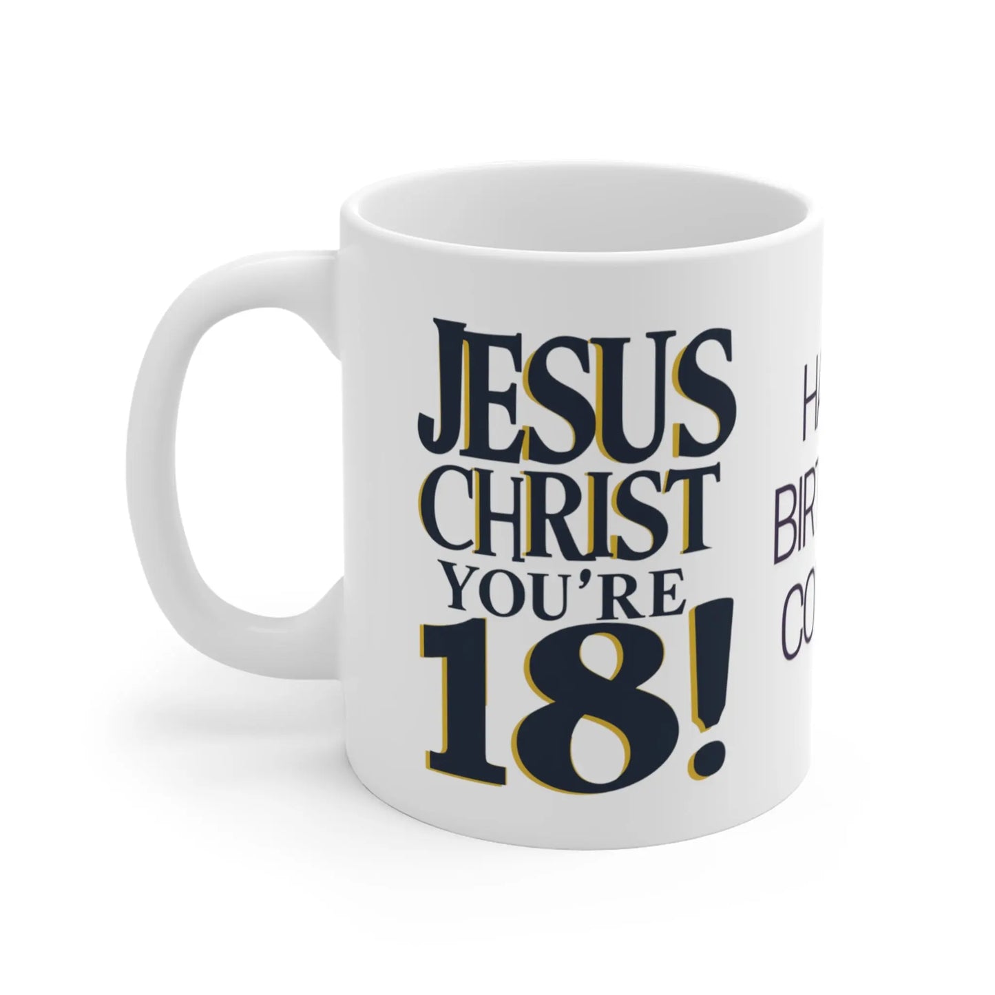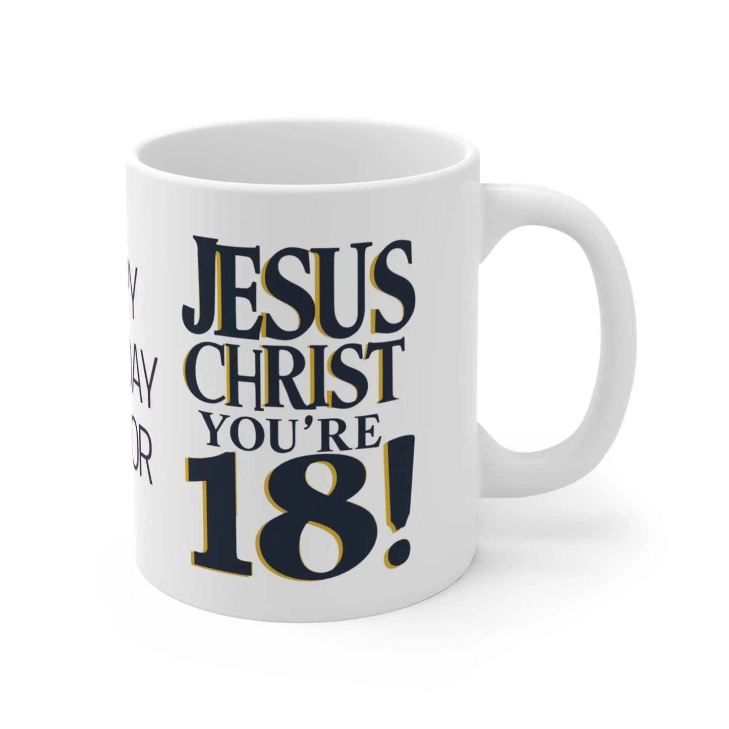 18th Birthday Mug, Get ready to celebrate turning 18 with this one-of-a-kind personalised birthday mug featuring Jesus Christ! With a humorous twist on the classic "Jesus Christ, you're" phrase, this mug will bring a smile to anyone's face. No matter if it's a birthday or just another day, this mug is sure to be a playful addition to your morning routine. Cheers to being officially an adult!