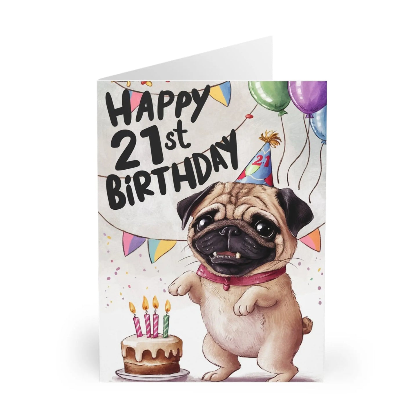 21st Birthday Card, Celebrate their special day with this adorable Happy 21st Birthday Pug Dog & Cake card. The cute pug with a party hat and cake will bring a smile to their face. Perfect for dog and cake lovers alike. Woof woof, cheers to 21 years!