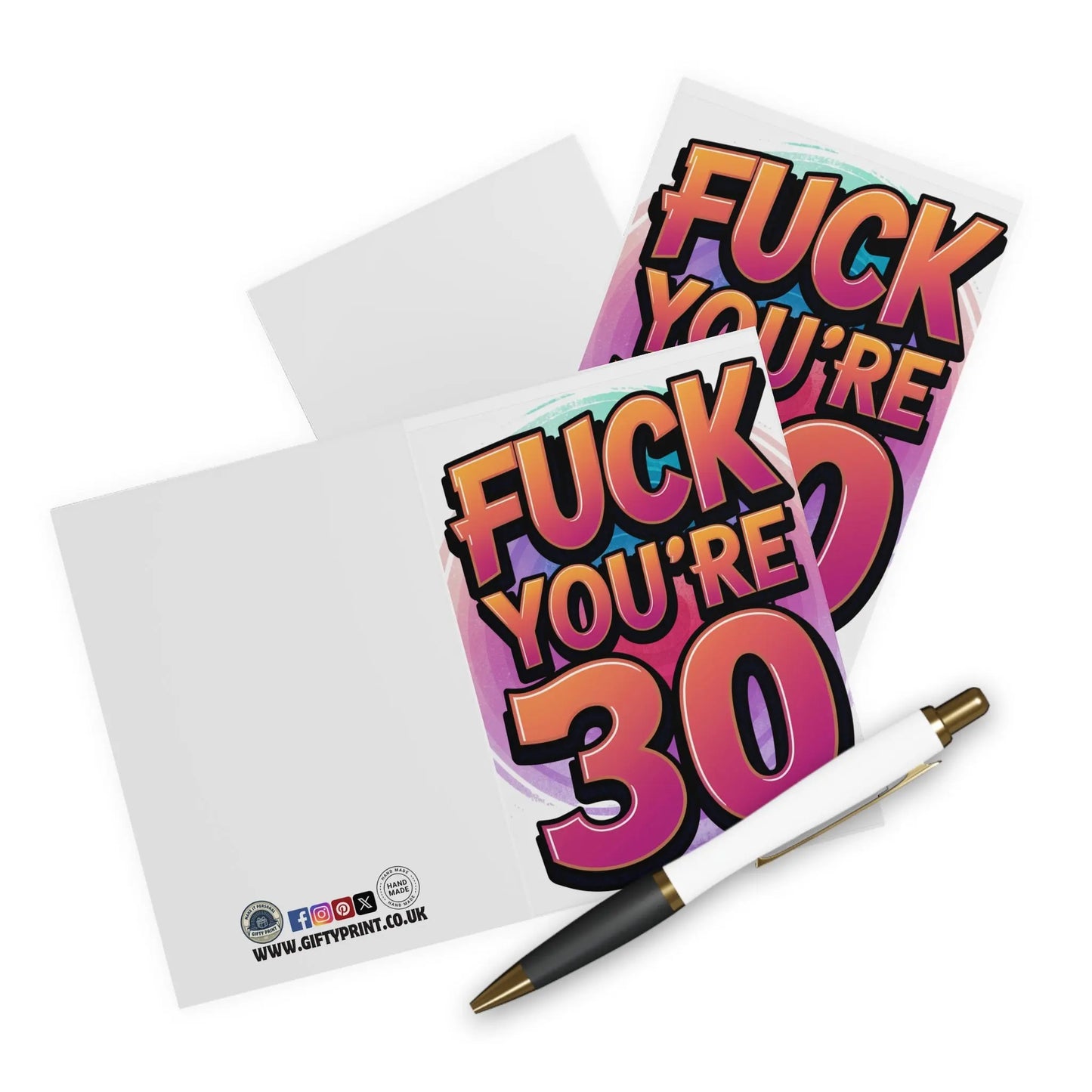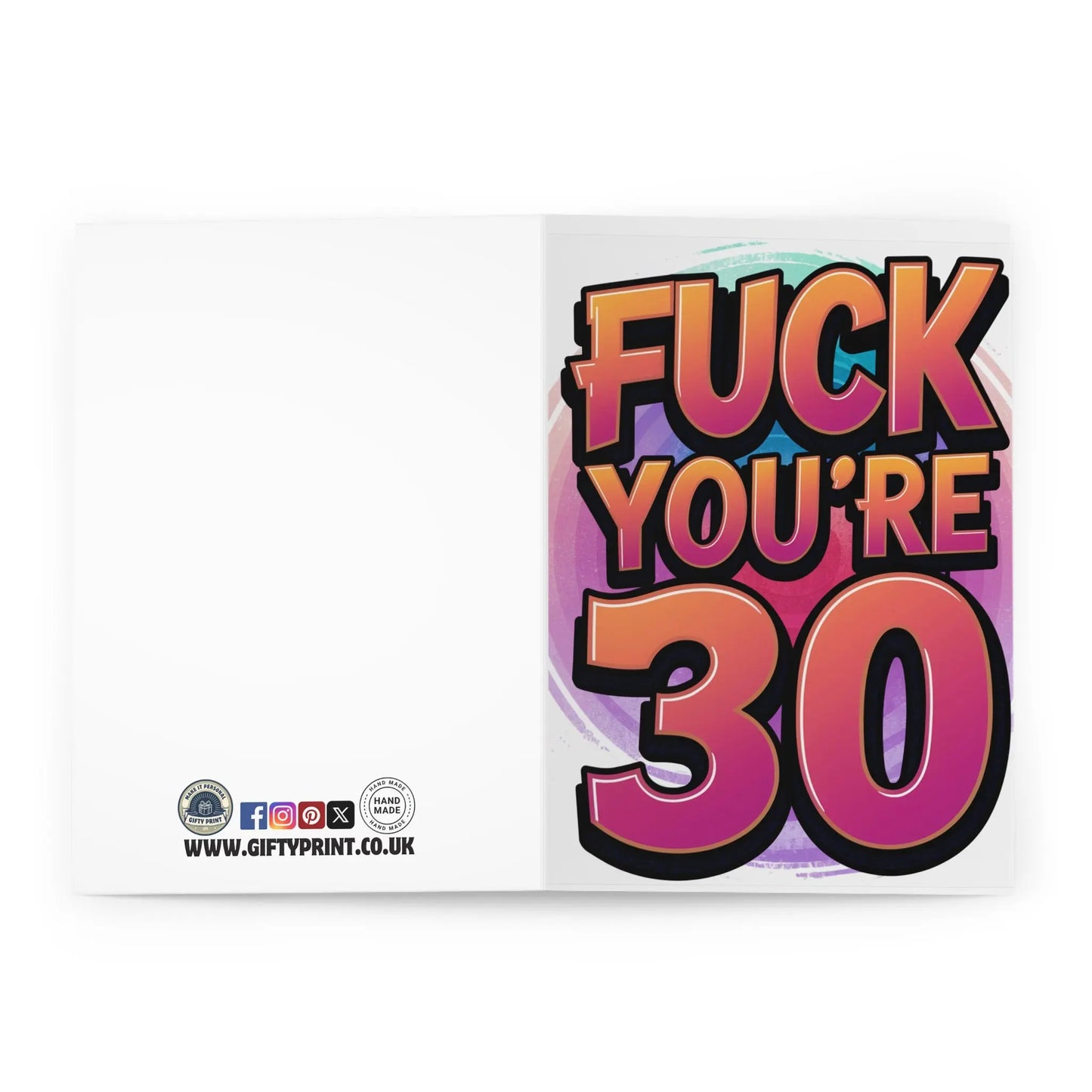 Celebrate someone's 30th birthday with this bold and humorous card! Featuring the phrase "Fuck You're 30", this card is perfect for someone with a sense of humor and a love for word play. Wish them a happy birthday in a fun and playful way with this unique card.