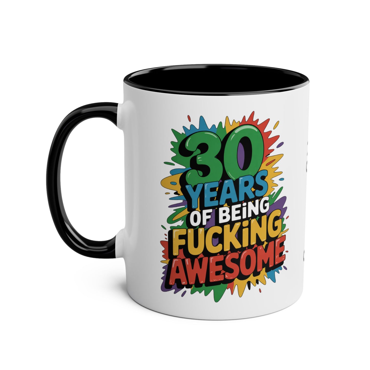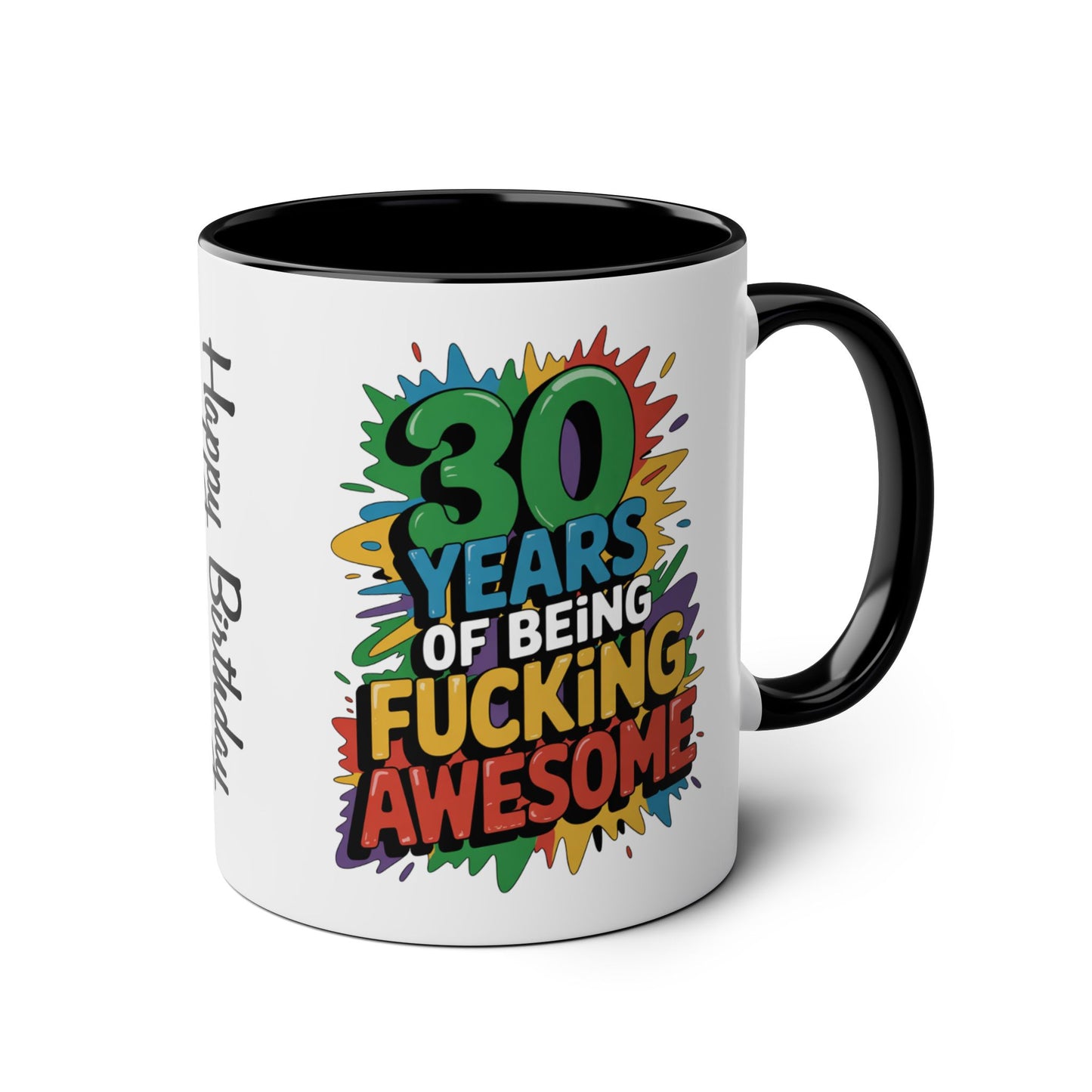 30th Birthday Mug, Celebrate your 30th birthday in style with this hilarious mug! Featuring the phrase "30 Years Of Being Fucking Awesome", this mug is perfect for anyone who doesn't take themselves too seriously. Use it to enjoy your morning coffee or as a conversation starter at parties. Cheers to 30 years of awesomeness!
