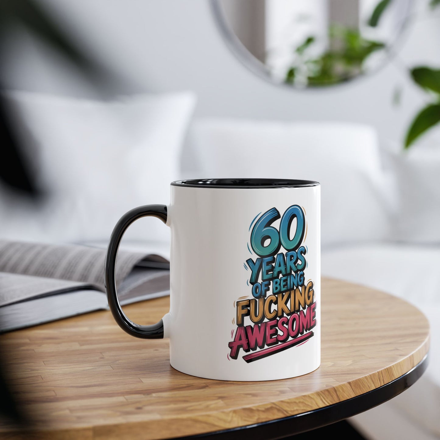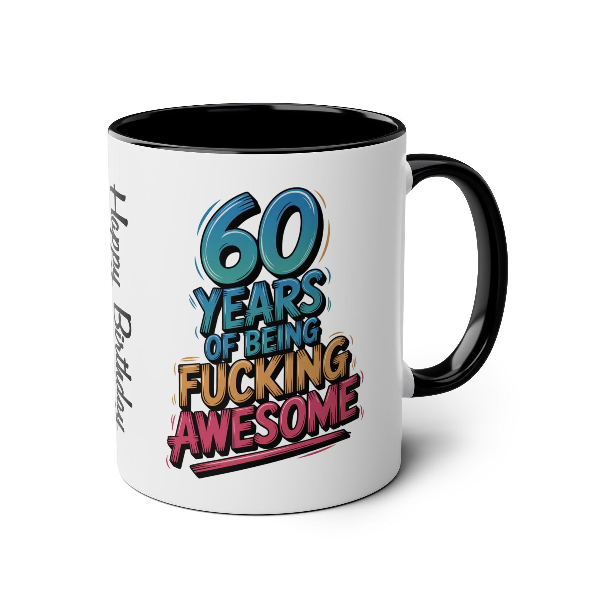 60th Birthday Mug, Celebrate 60 years of awesomeness with our 60th Birthday Mug! Featuring the phrase "60 Years of Being Fucking Awesome", this mug is the perfect gift for anyone reaching this milestone. Made from high-quality materials, it's durable and dishwasher safe. Cheers to 60 years of awesomeness!