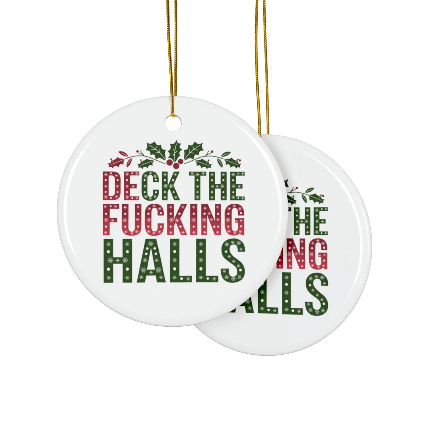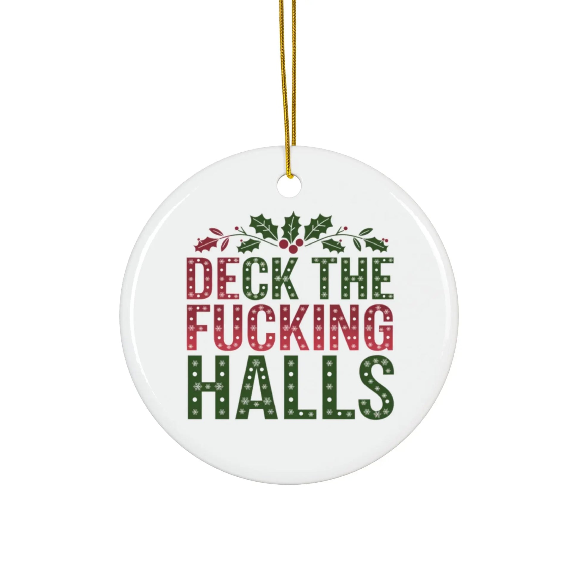 ceramic Christmas decoration, Make your holiday season a little more merry and bright with our Deck The Fucking Halls Ceramic Christmas Bauble. Hang this cheeky bauble on your tree or give it as a gift to spread some cheer (and a few laughs). Made of high-quality ceramic, it's both festive and durable. 'Tis the season to be jolly and a little bit naughty!