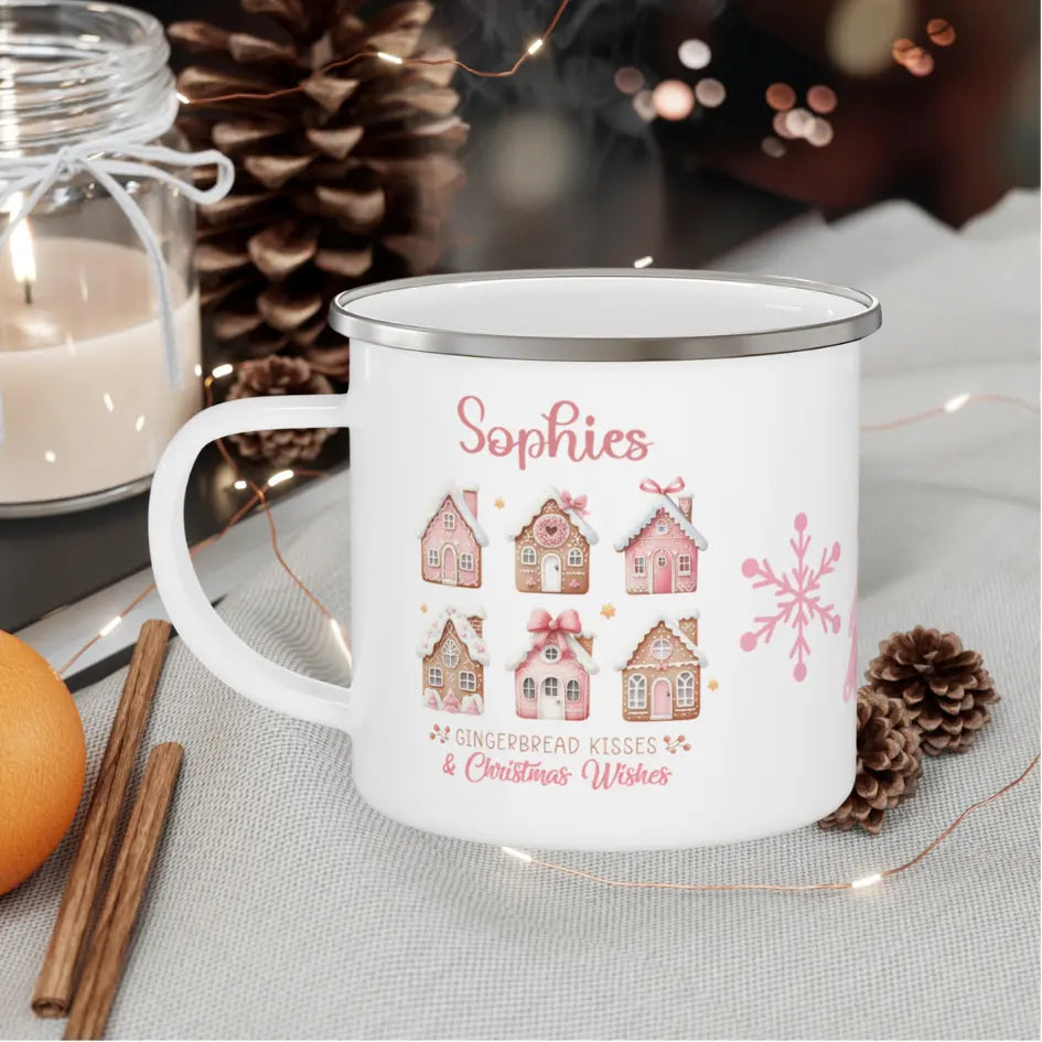 Children's Christmas Mug, Sip on sweet memories with our Personalised Children's Mug - Gingerbread Kisses Enamel Mug. Perfect for little ones, the mug features a custom name and a playful look with a gingerbread character. Enjoy every warm sip with a touch of personalisation and a sprinkle of cuteness. Cheers!