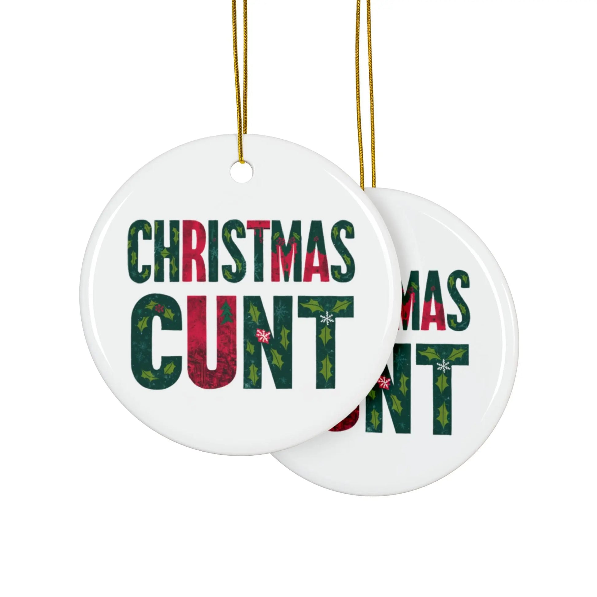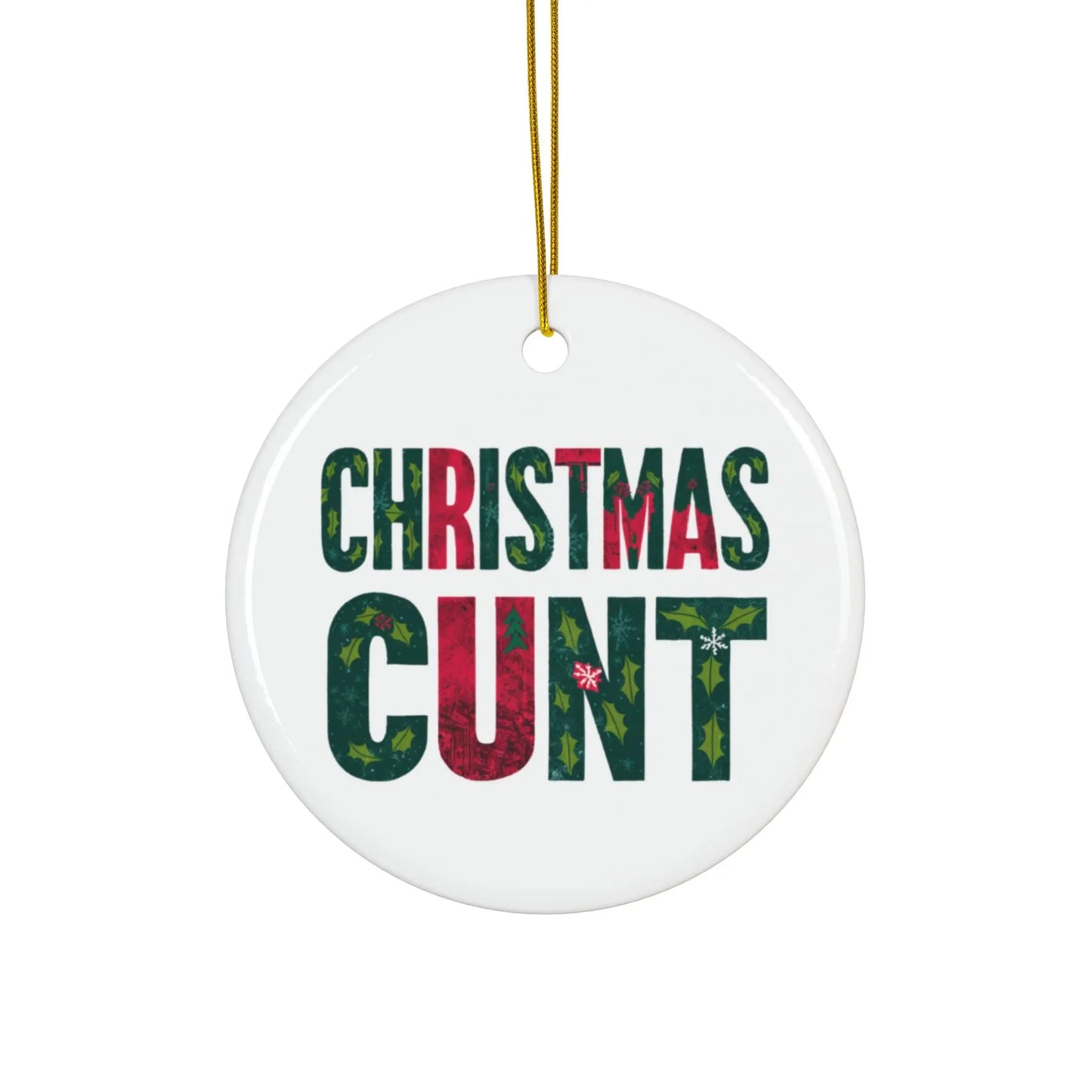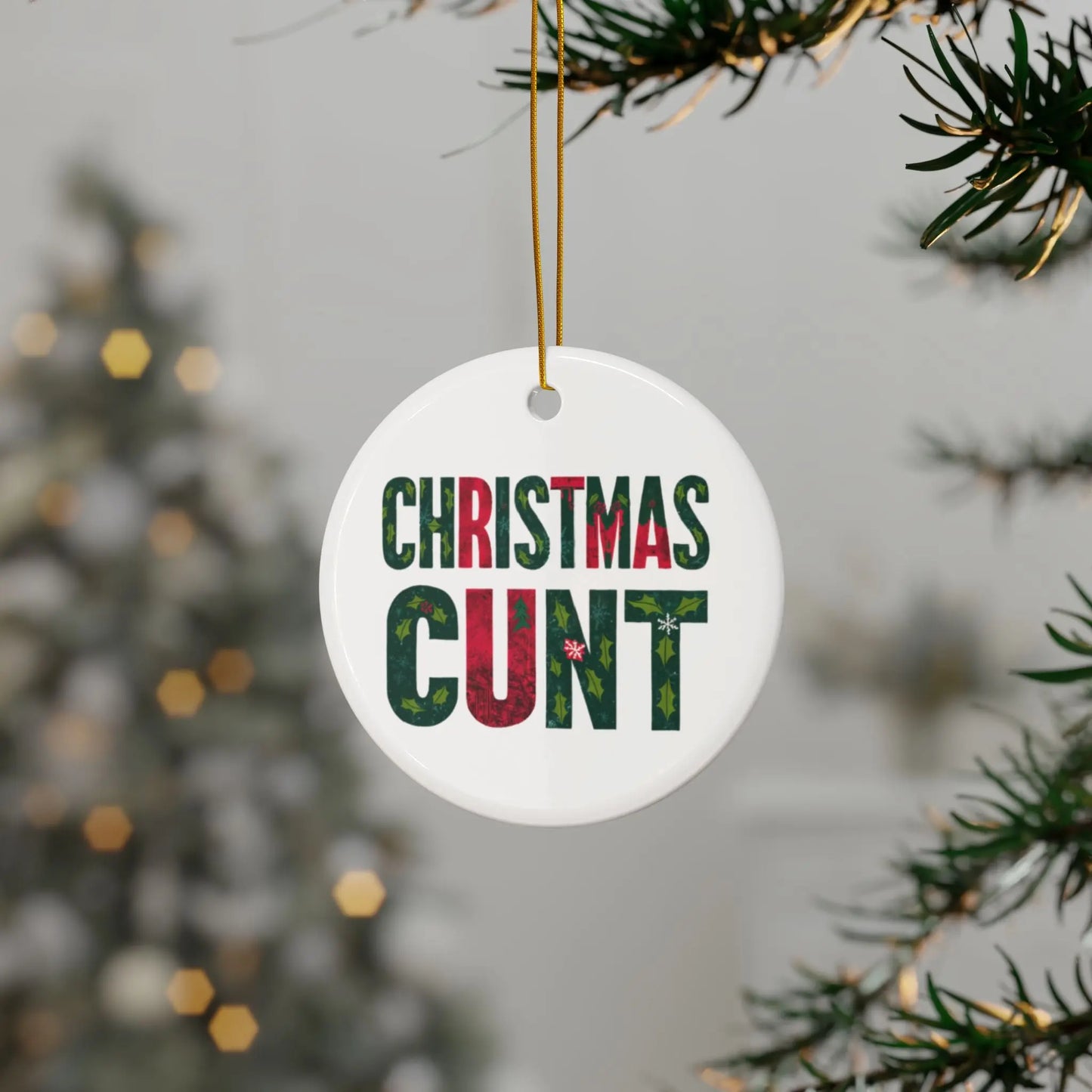 Christmas Tree Bauble Add a touch of humor to your Christmas tree with our "Christmas Cunt" bauble. This rude and quirky bauble is sure to make your guests chuckle and bring a playful vibe to your holiday decor. Perfect for those who don't take themselves too seriously.