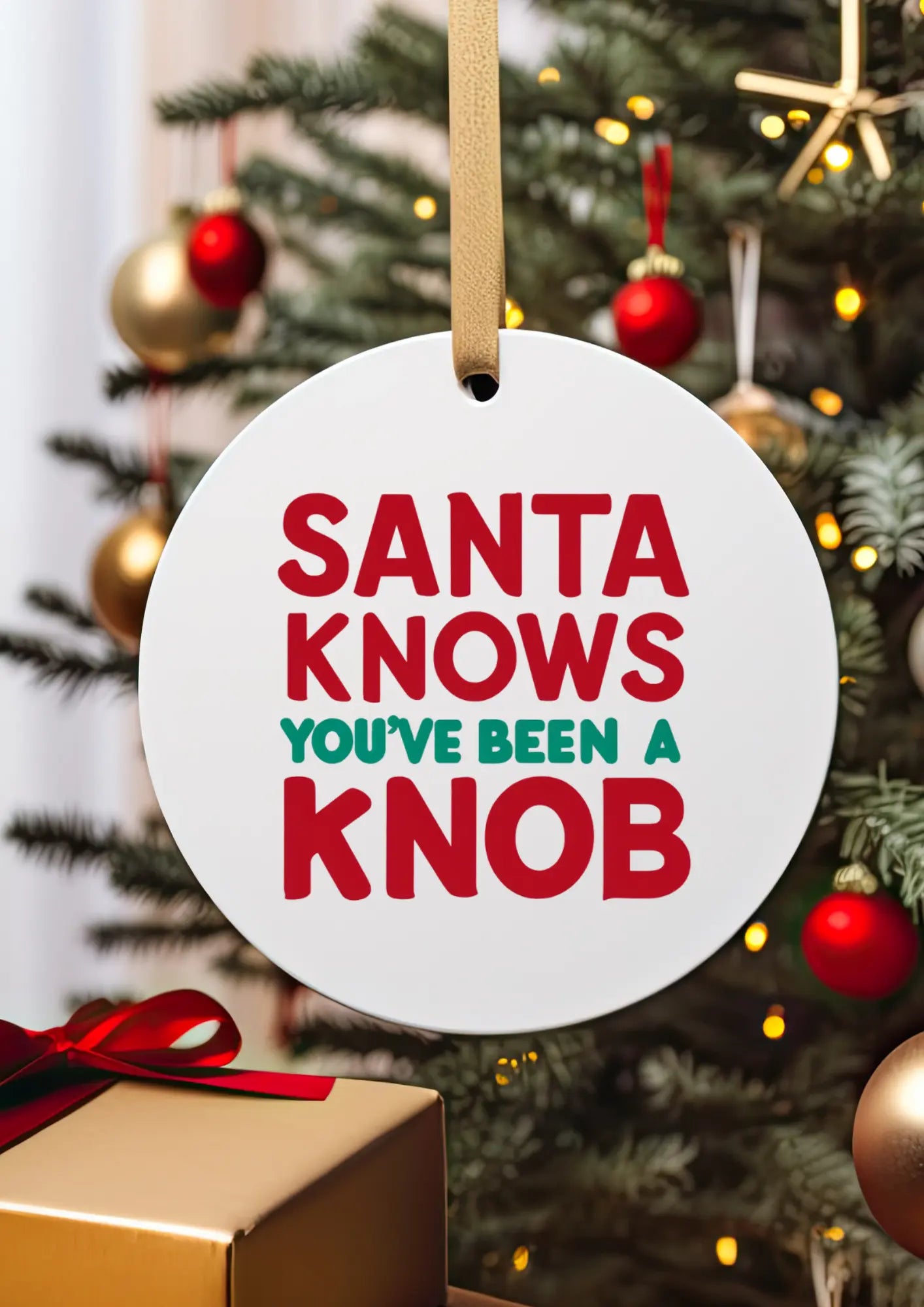 Christmas Tree Bauble, This cheeky Christmas tree bauble will definitely turn heads at your next holiday party. The Santa Knows You've Been A Knob Rude Christmas Tree Bauble adds a playful touch to any holiday decor, making it the perfect gift for someone with a good sense of humour.