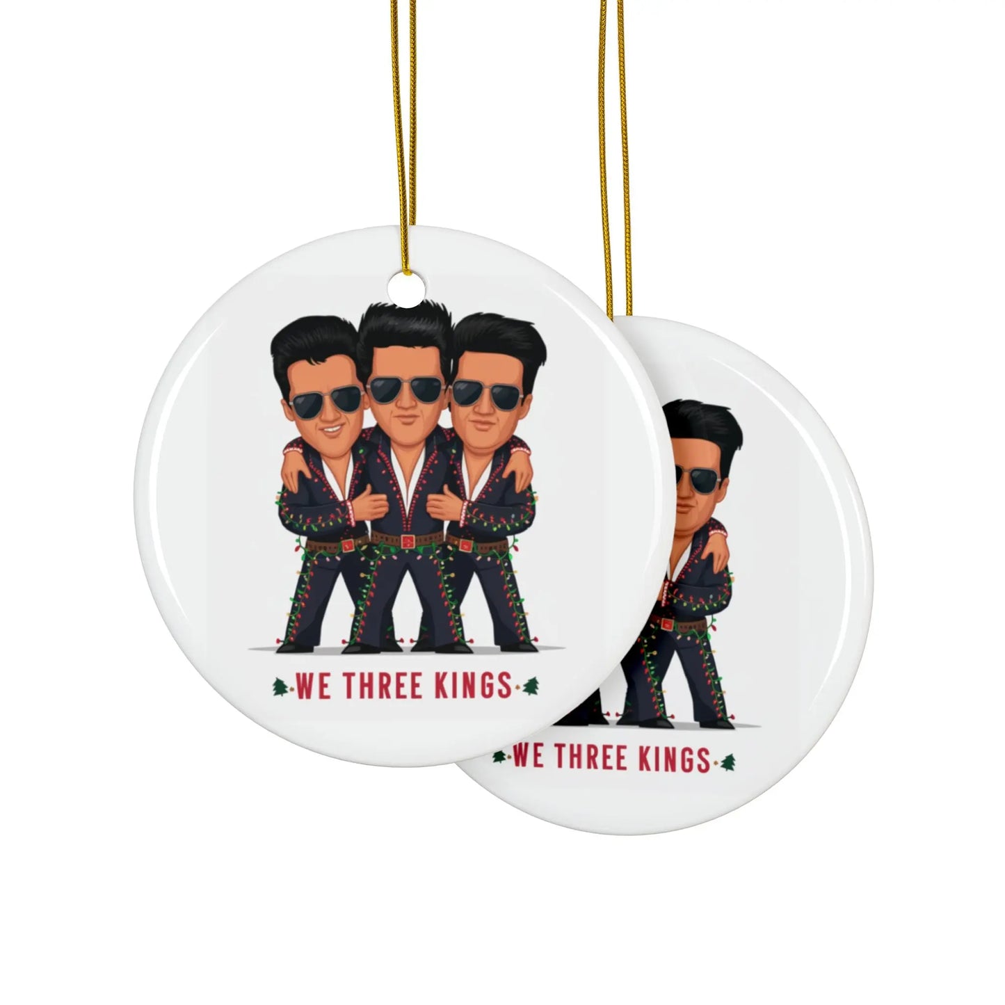 Christmas Tree Bauble, Get rockin' this holiday season with our We Three Kings Funny Elvis Ceramic Christmas Tree Bauble. This quirky and fun ornament features the king of rock and roll himself, decked out in his iconic Christmas tree suit. Add a touch of unique humour to your holiday decorations with this bauble.