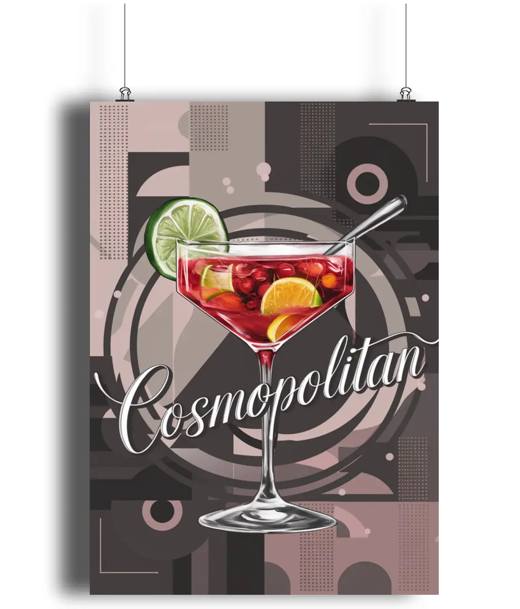 Cocktail Wall Art Print, Let the Cosmopolitan Cocktail inspire your home bar decor. This colourful wall art print will liven up any space and add a touch of playfulness to your mixology. Cheers to a unique and quirky addition to your home!