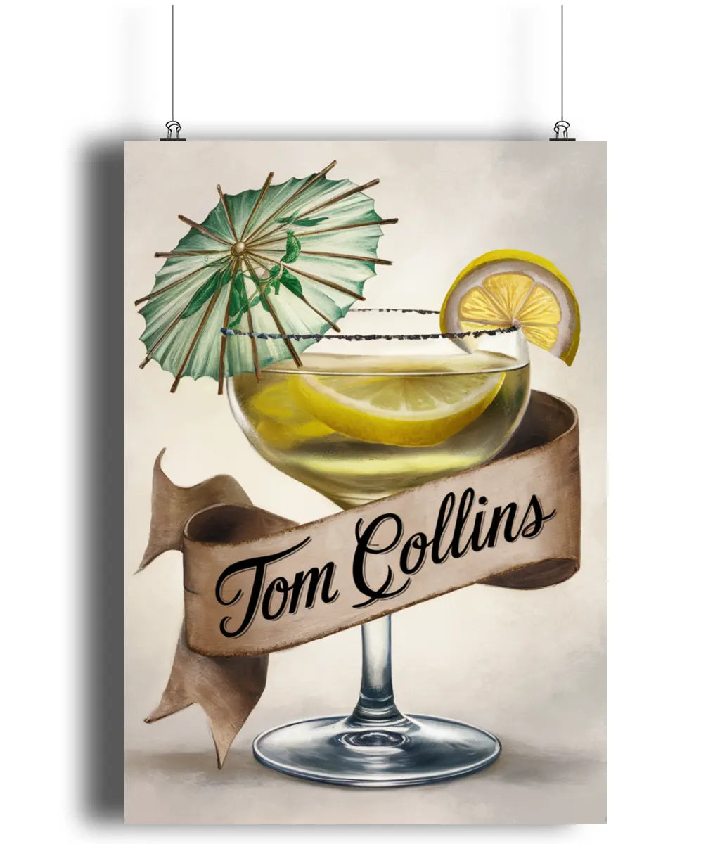 Cocktail Wall Art Print, Elevate your home bar with our exclusive Tom Collins Banner Cocktail print. Crafted with luxurious attention to detail, this wall art will add a touch of sophistication to any space. Perfect for the discerning drink enthusiast, it's a must-have addition to your cocktail decor collection.