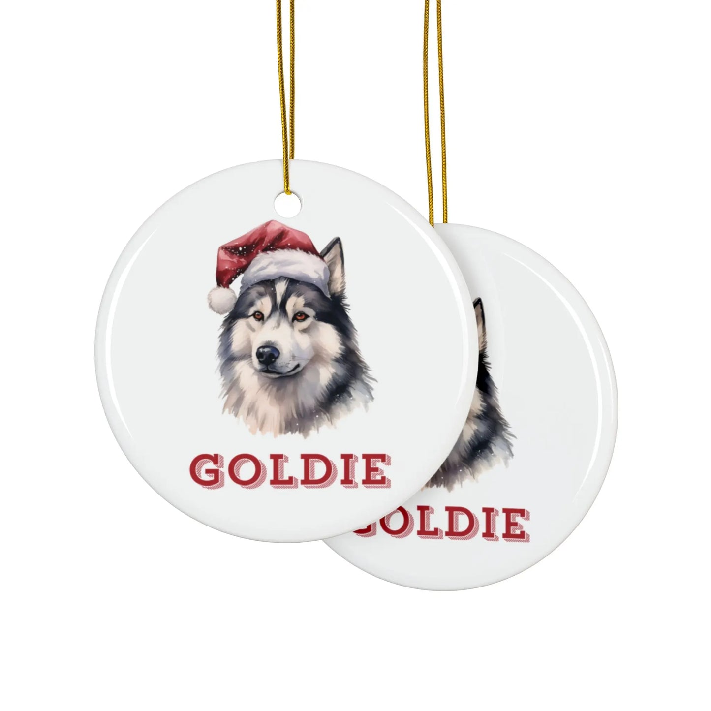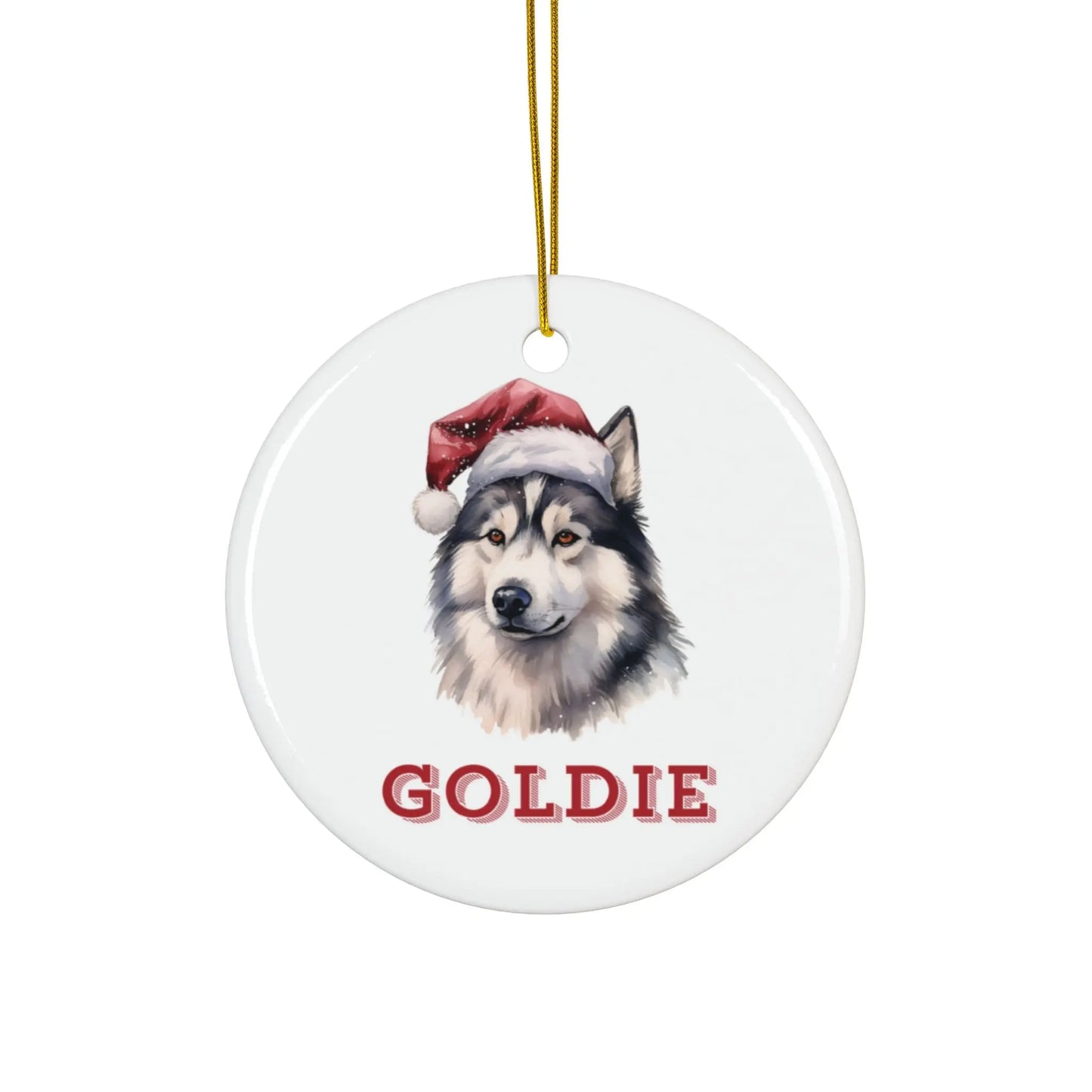 Dog Christmas Bauble, This bauble adds some personality to your holiday tree, featuring a lovable Siberian Huskey. With its customisable touch, it makes a unique gift or keepsake to cherish for years to come. Celebrate the season with this quirky, playful addition to your decor.