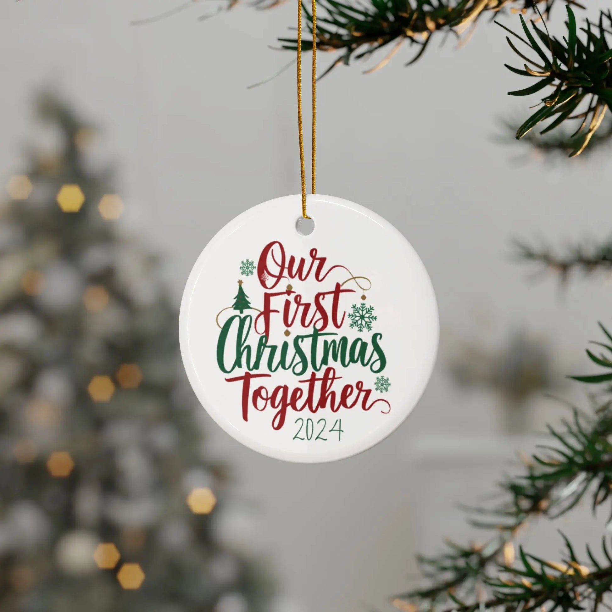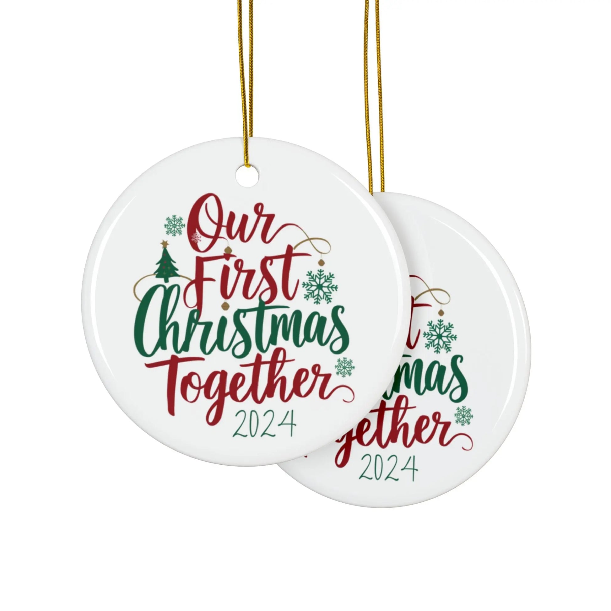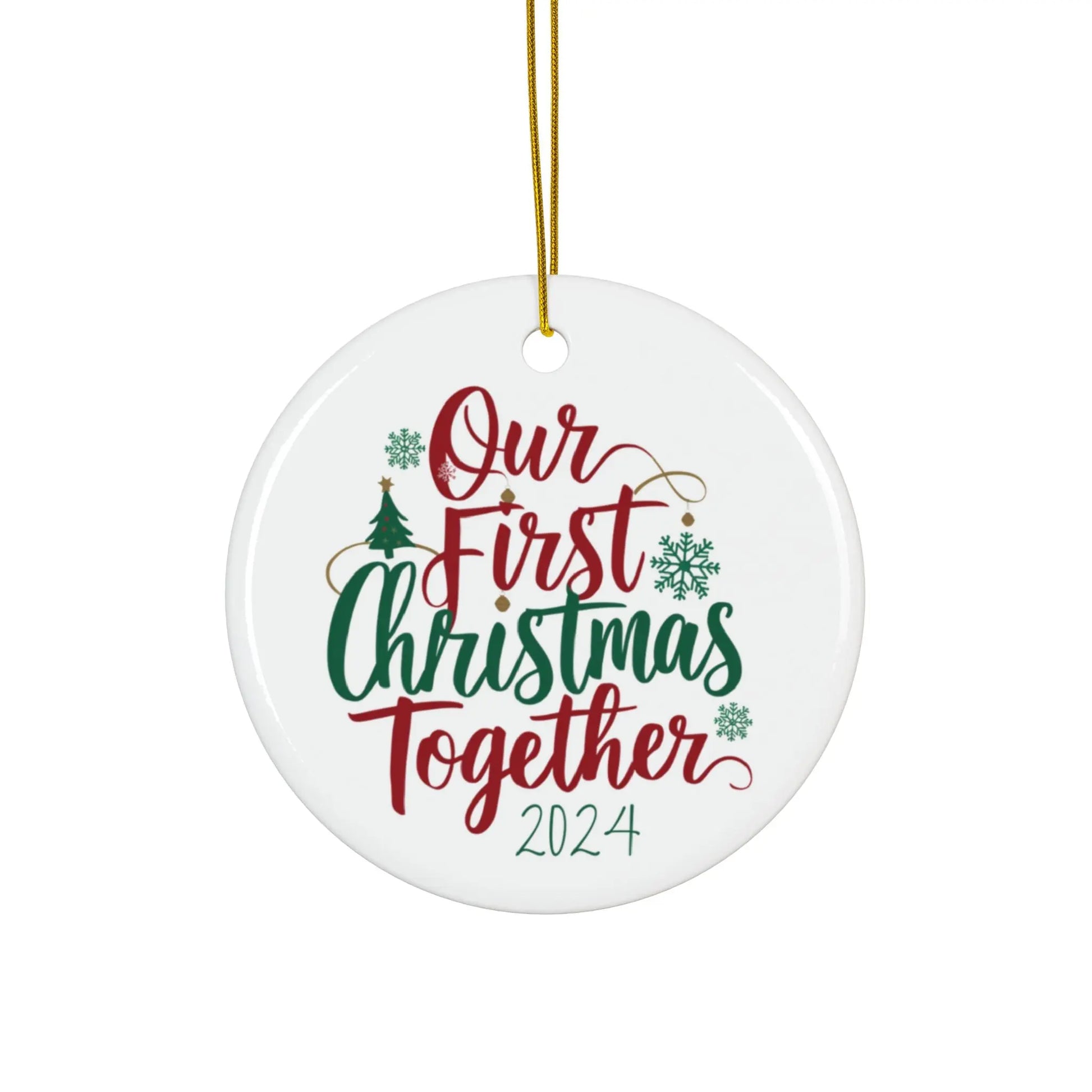 First Christmas Bauble, Get ready to celebrate your first Christmas together with this charming bauble. Featuring the message "Our First Christmas Together" it's the perfect way to commemorate this special milestone. Hang it on your tree and cherish the memories for years to come. Cheers to new traditions!