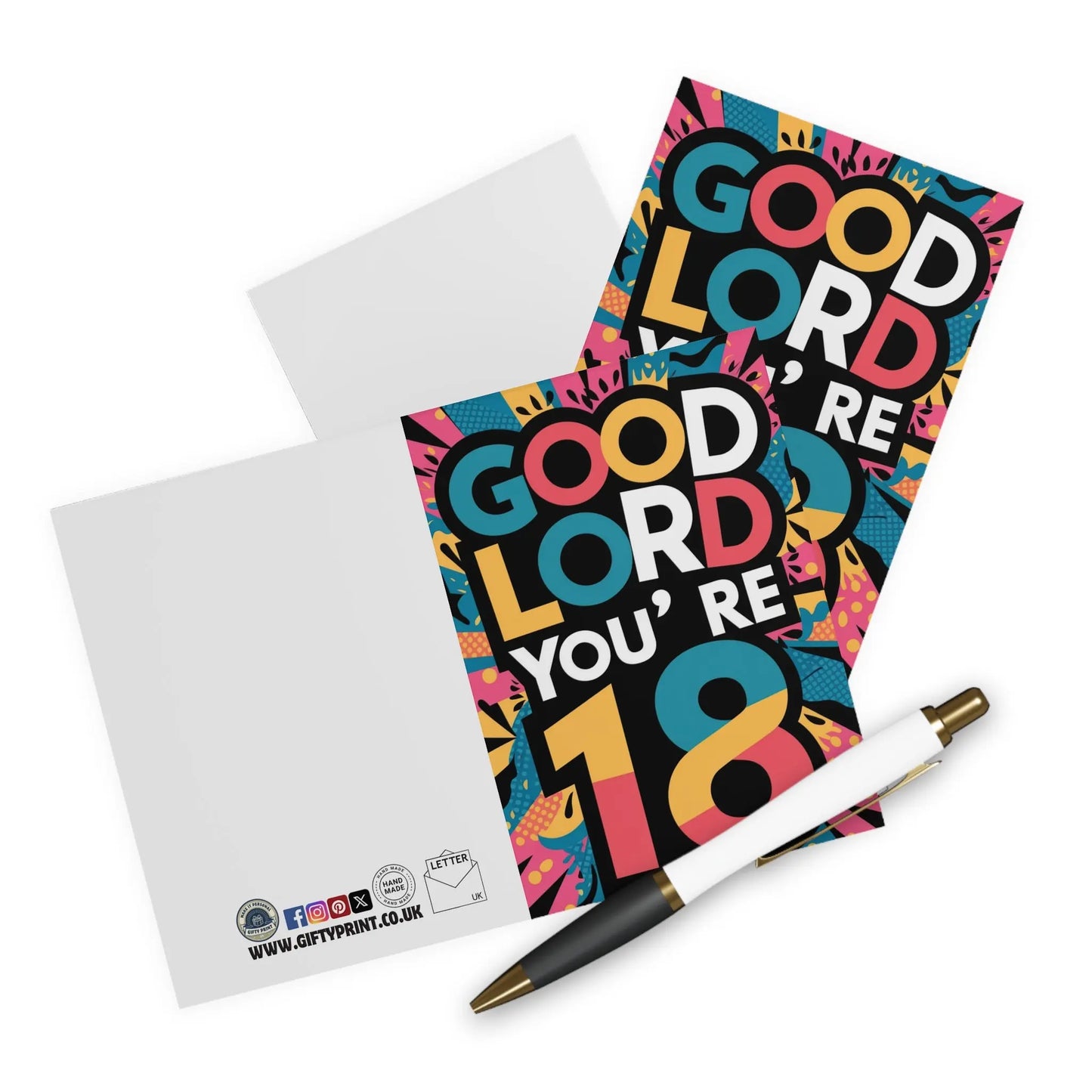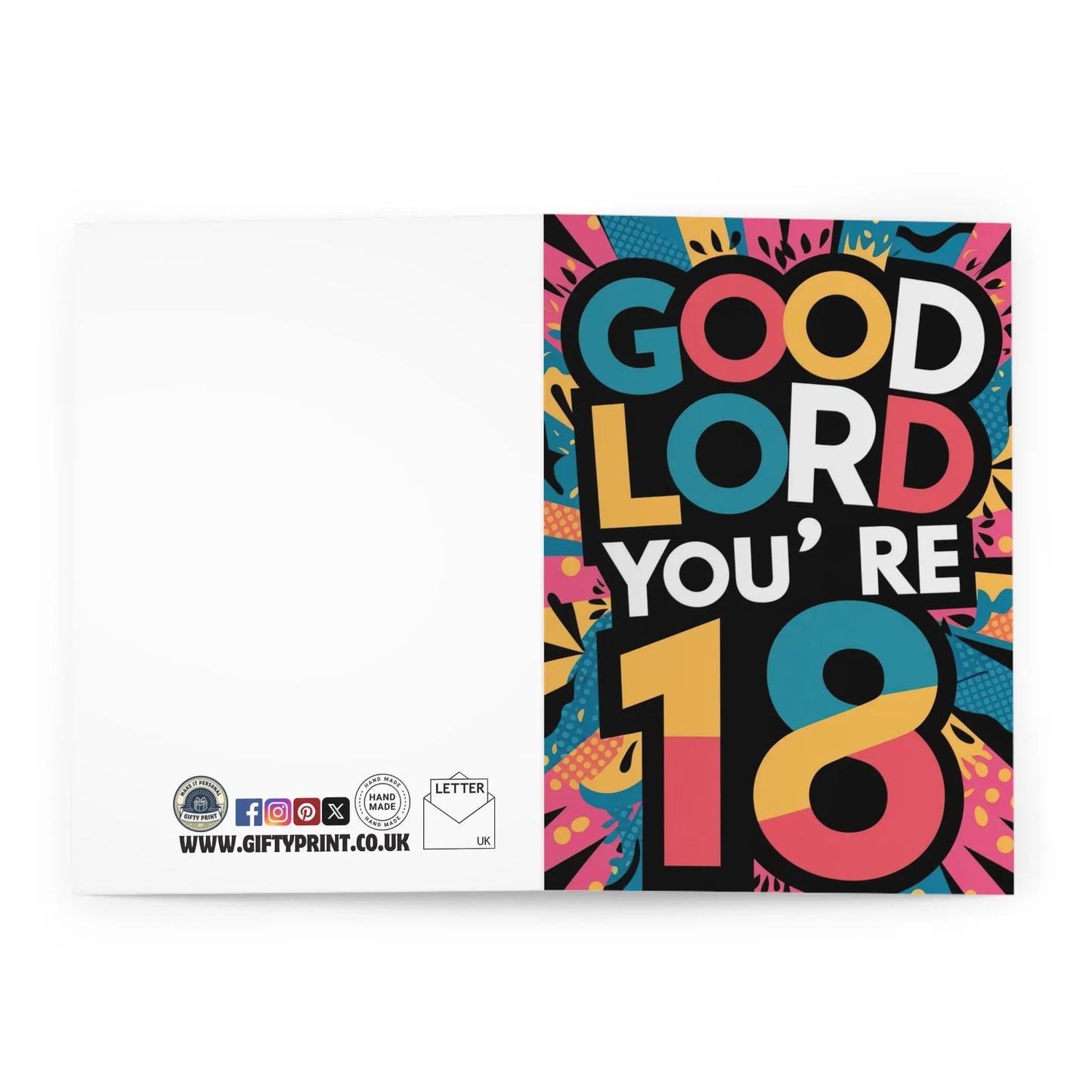 Funny 18th Birthday Card, Celebrate a milestone birthday with this playful and quirky 18th birthday card. The "Good Lord" phrase adds a fun twist and makes for a unique and humorous card. Perfect for those who don't take themselves too seriously. (Don't worry, we won't tell anyone you're actually excited to turn 18!)