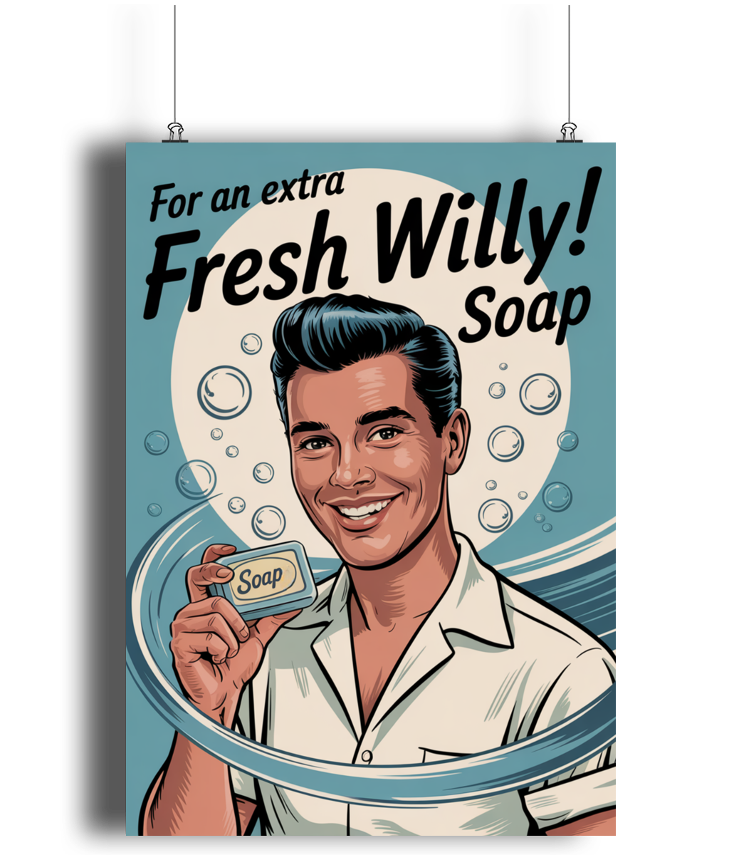 Funny Bathroom Wall Art Enhance your bathroom with a touch of humour with our Funny Bathroom Wall Art Extra Fresh Willy Soap. The perfect addition to any bathroom for a good laugh and a good wash.