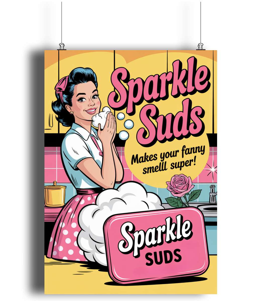 Funny Bathroom Wall Art, This humorous bathroom wall art is sure to make a statement in any bathroom. Featuring the phrase "Suds Makes Your Fanny Smell Super," this piece is both witty and functional. Made with high-quality materials, this art is sure to add a touch of light heartedness to your daily routine.