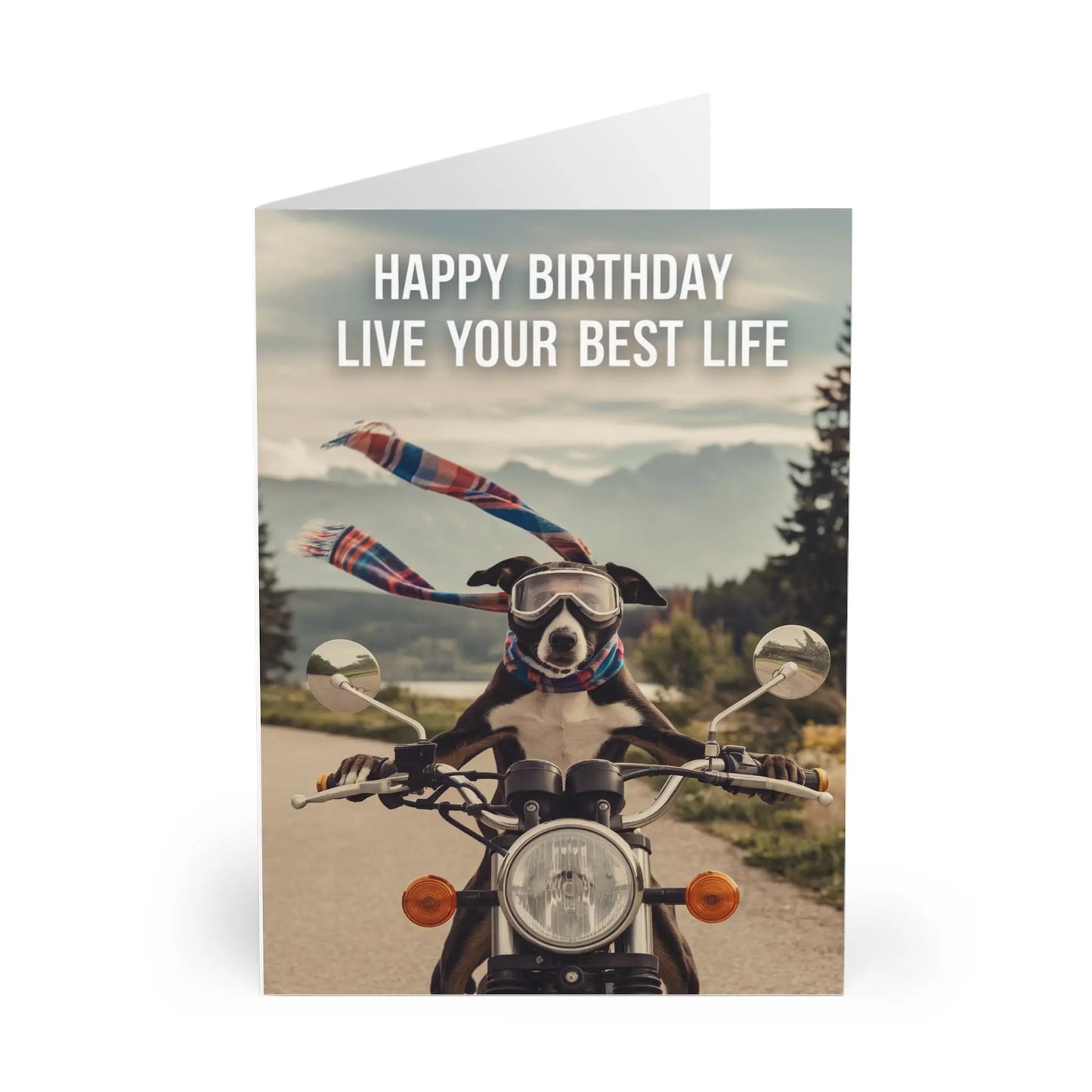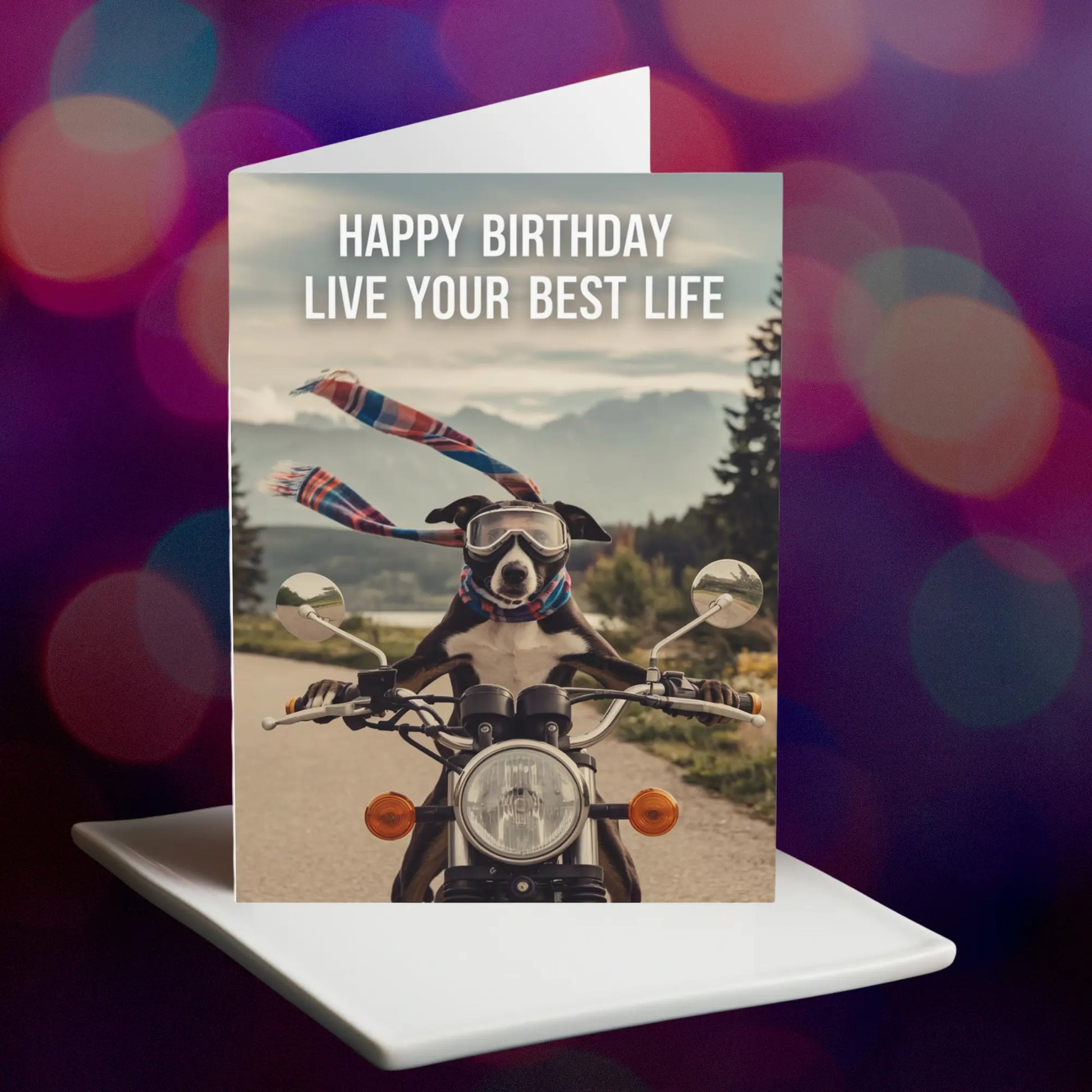 Funny birthday card, Celebrate a birthday with this hilarious card! A dog on a motorbike reminds us to live life to the fullest! Perfect for any dog lover, this card is sure to bring a smile.
