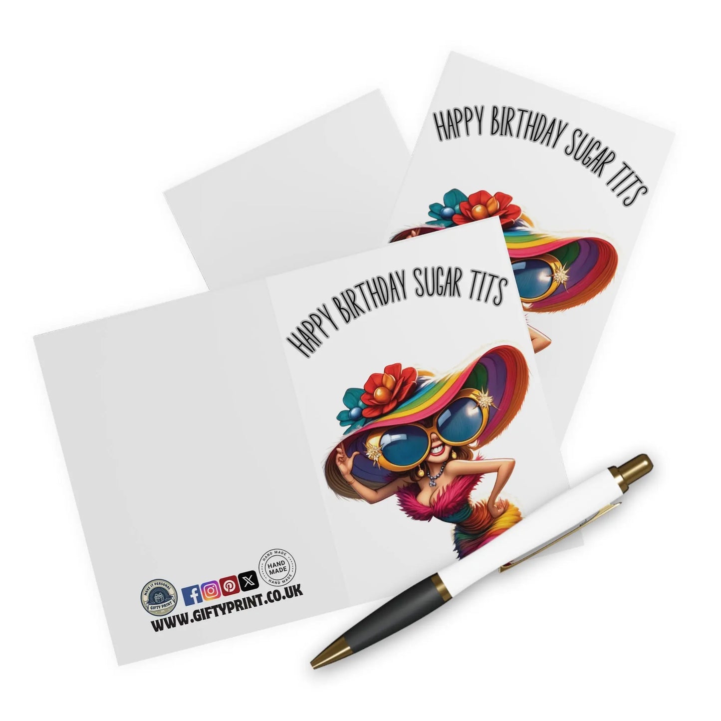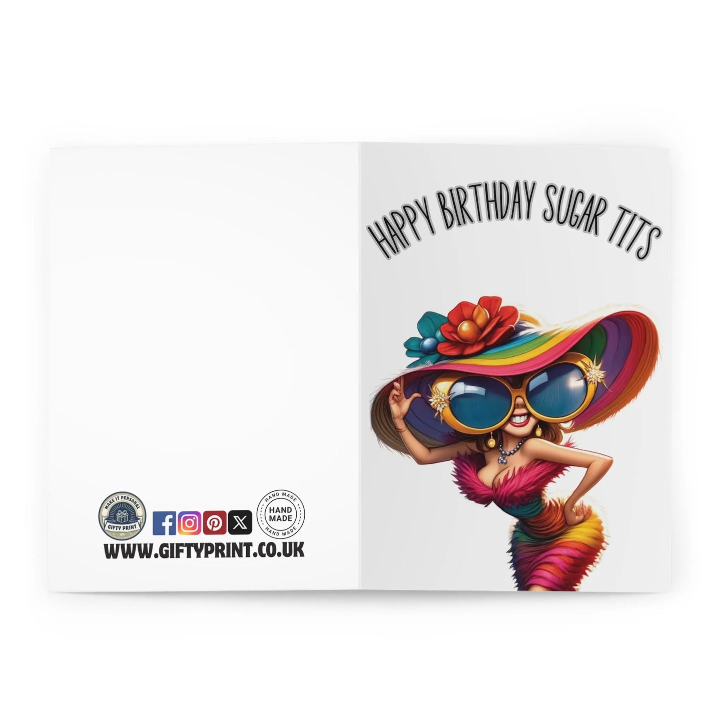 Funny Birthday Card, Celebrate their special day with a touch of humour with our Happy Birthday Sugar Tits Birthday Card! Show them you care with a card that's both cheeky and heartfelt. Perfect for the receiver with a great sense of humour.