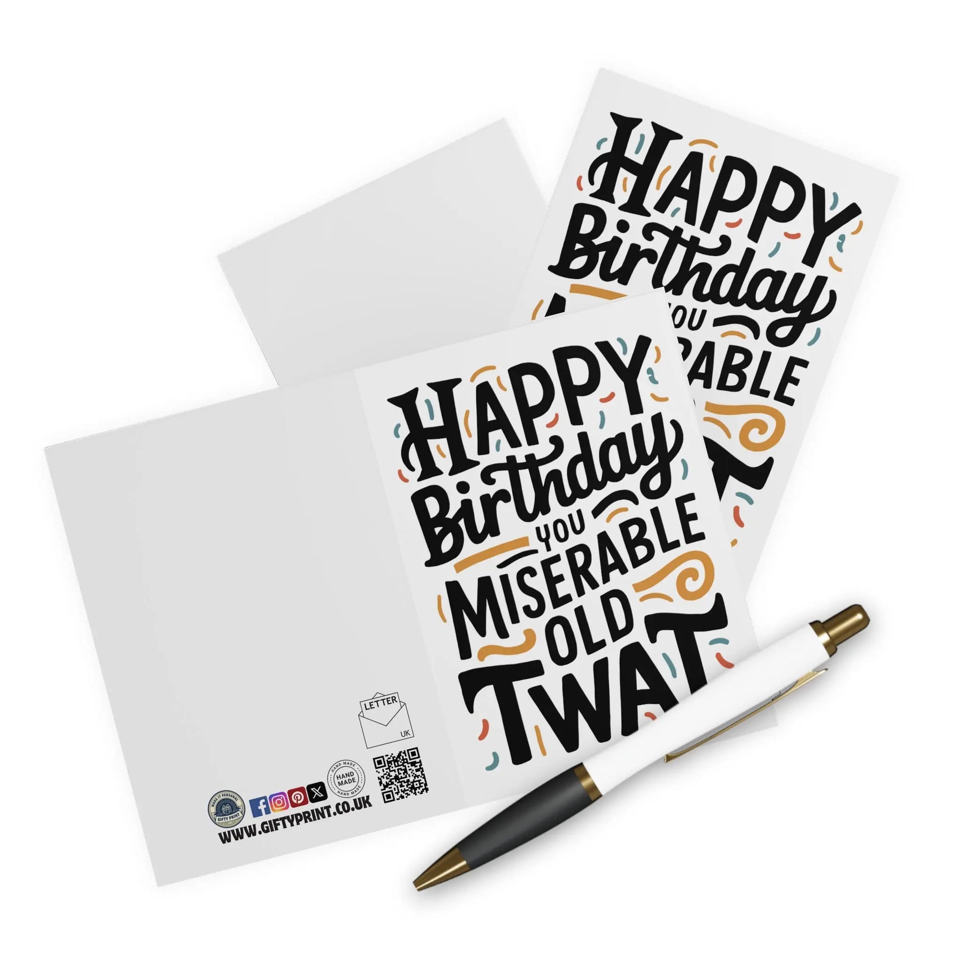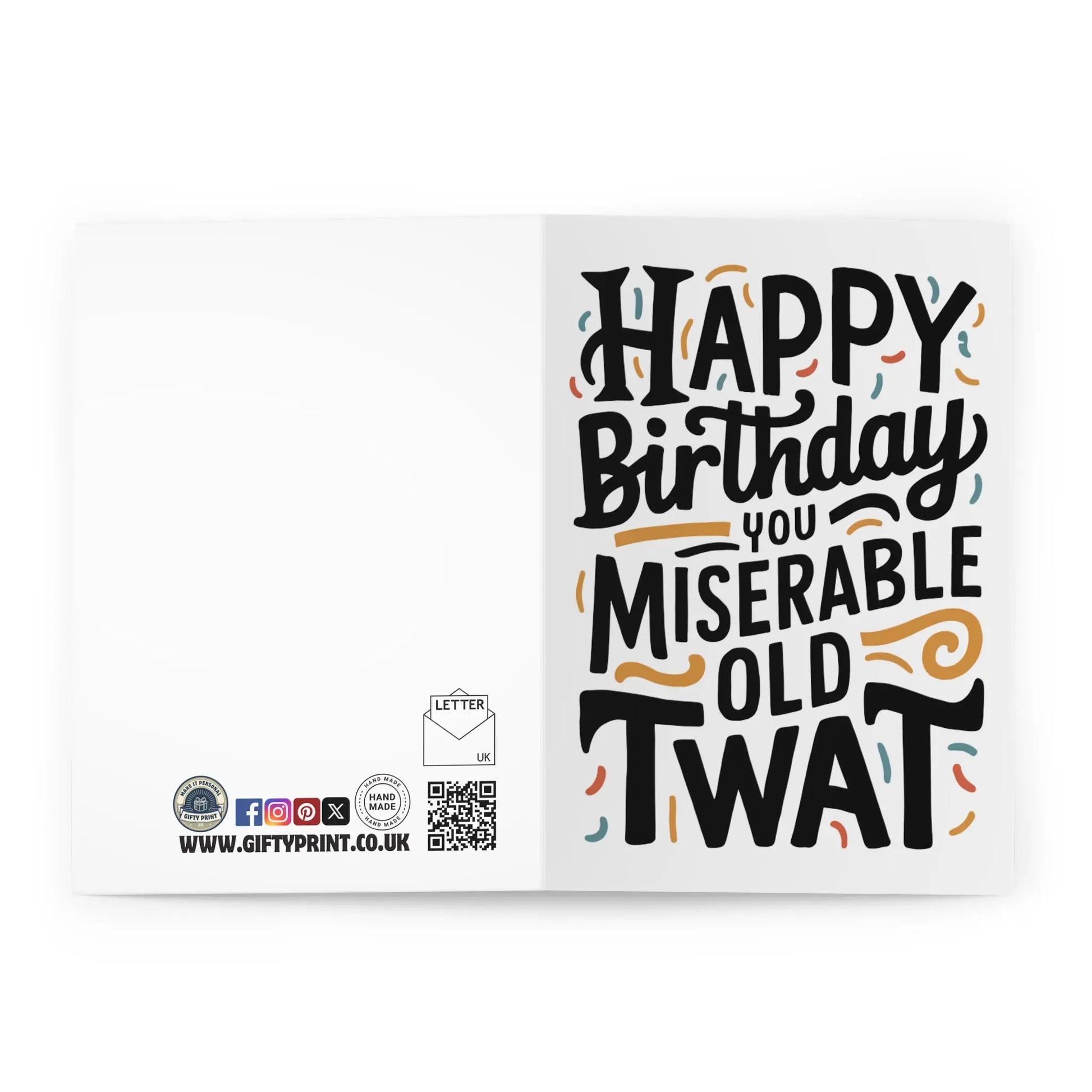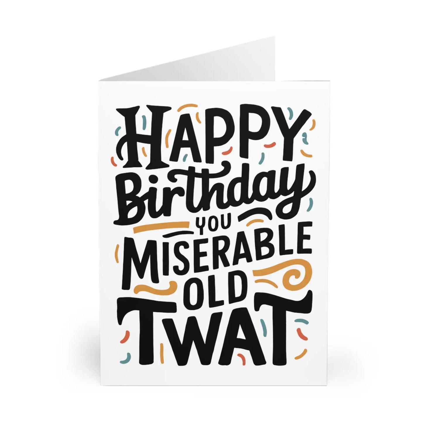 Funny Birthday Card, Say "Happy Birthday" in a uniquely sassy way with our Rude Birthday Card! Featuring the message "Happy Birthday You Miserable Old Twat", this card is perfect for those who don't take themselves too seriously. Slang, humor, and word play make this card a cheeky and memorable choice for celebrating another year of life.