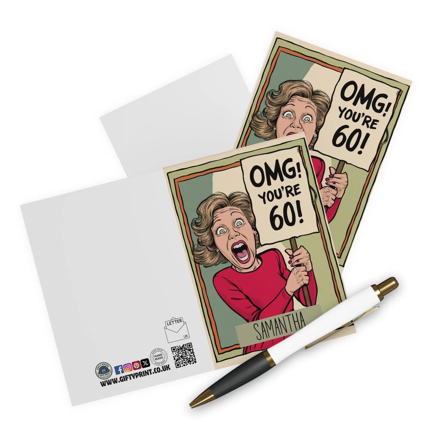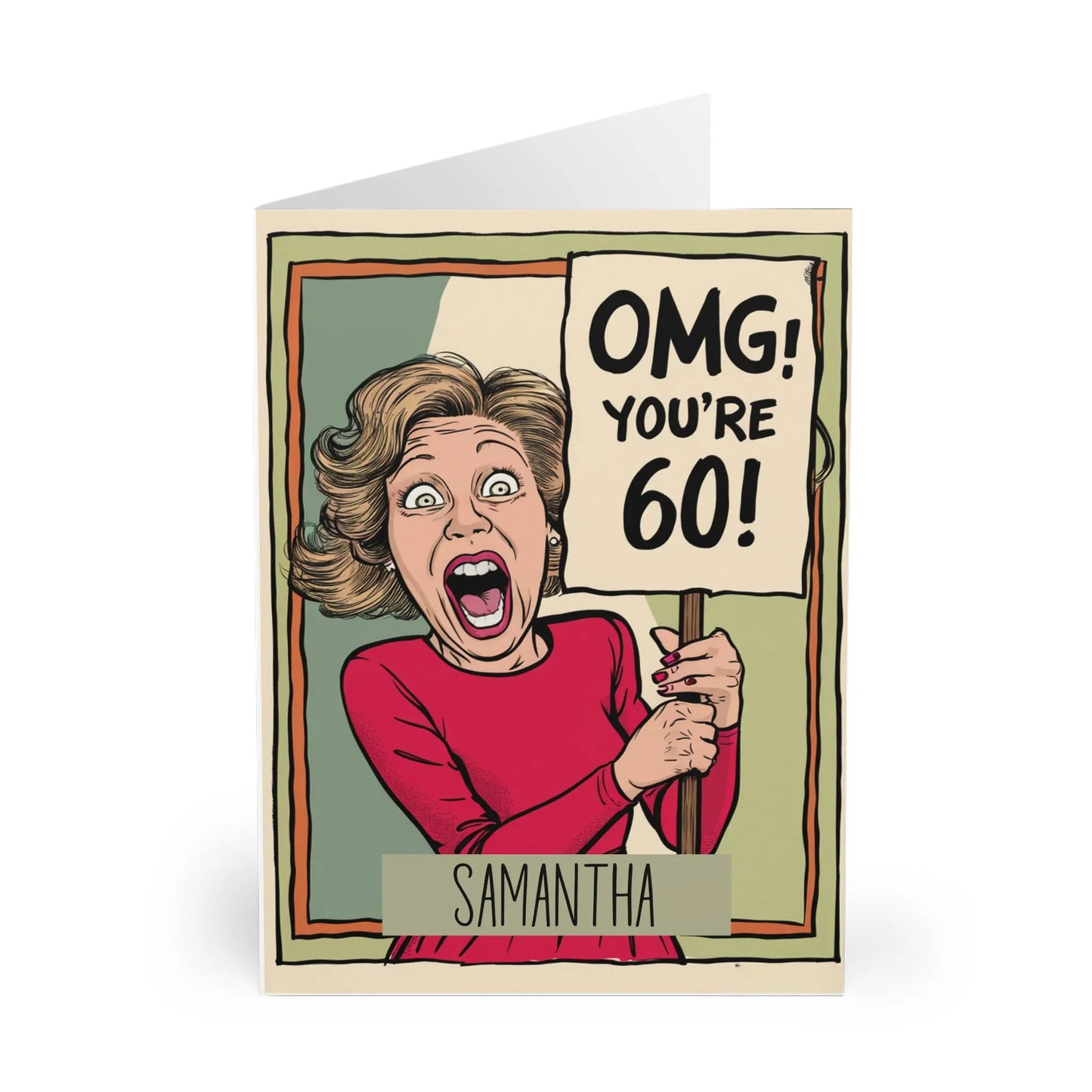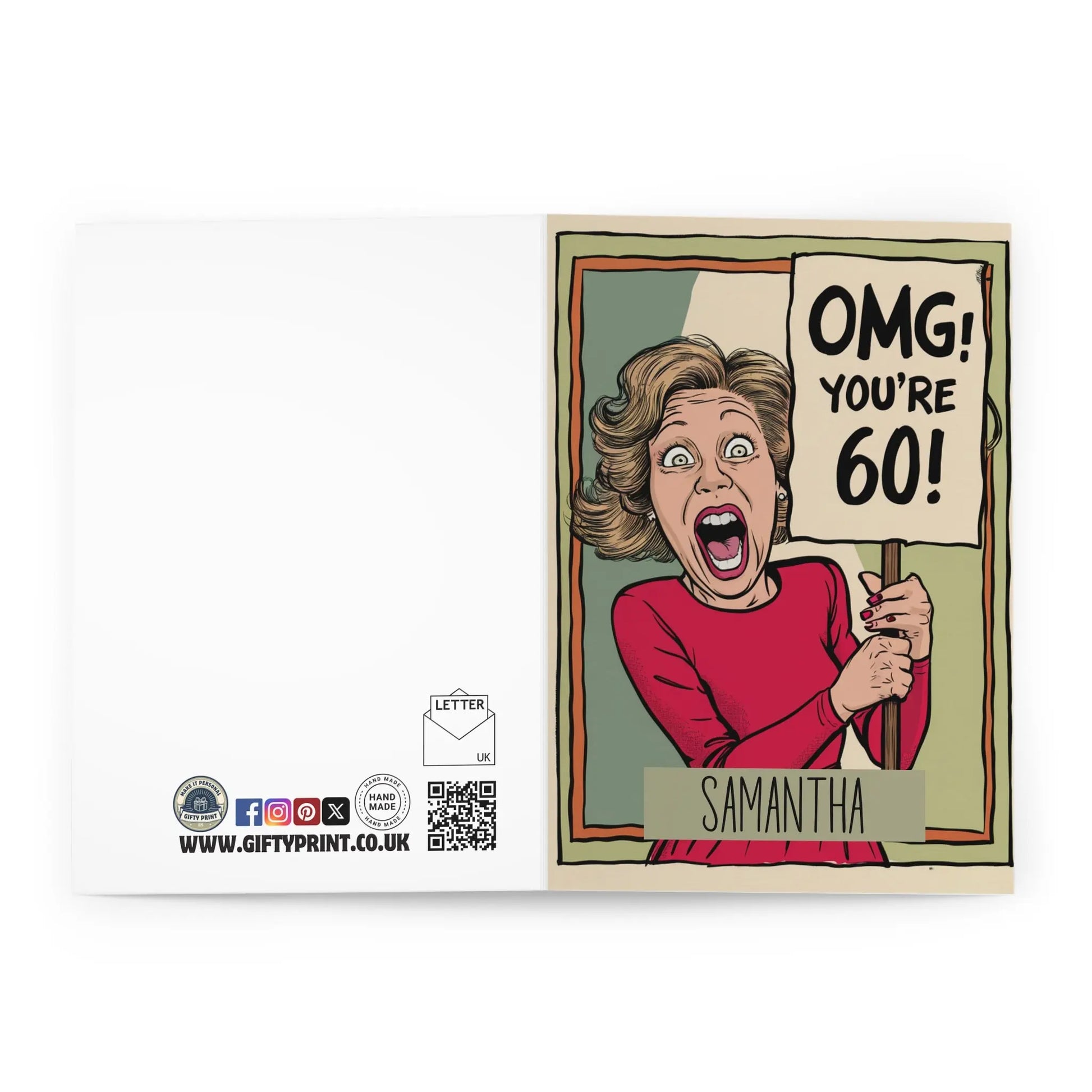 Funny Birthday Card Shake things up on their 60th birthday with this personalised card featuring a surprised lady exclaiming "OMG You're 60!" Guaranteed laughs and a memorable celebration.