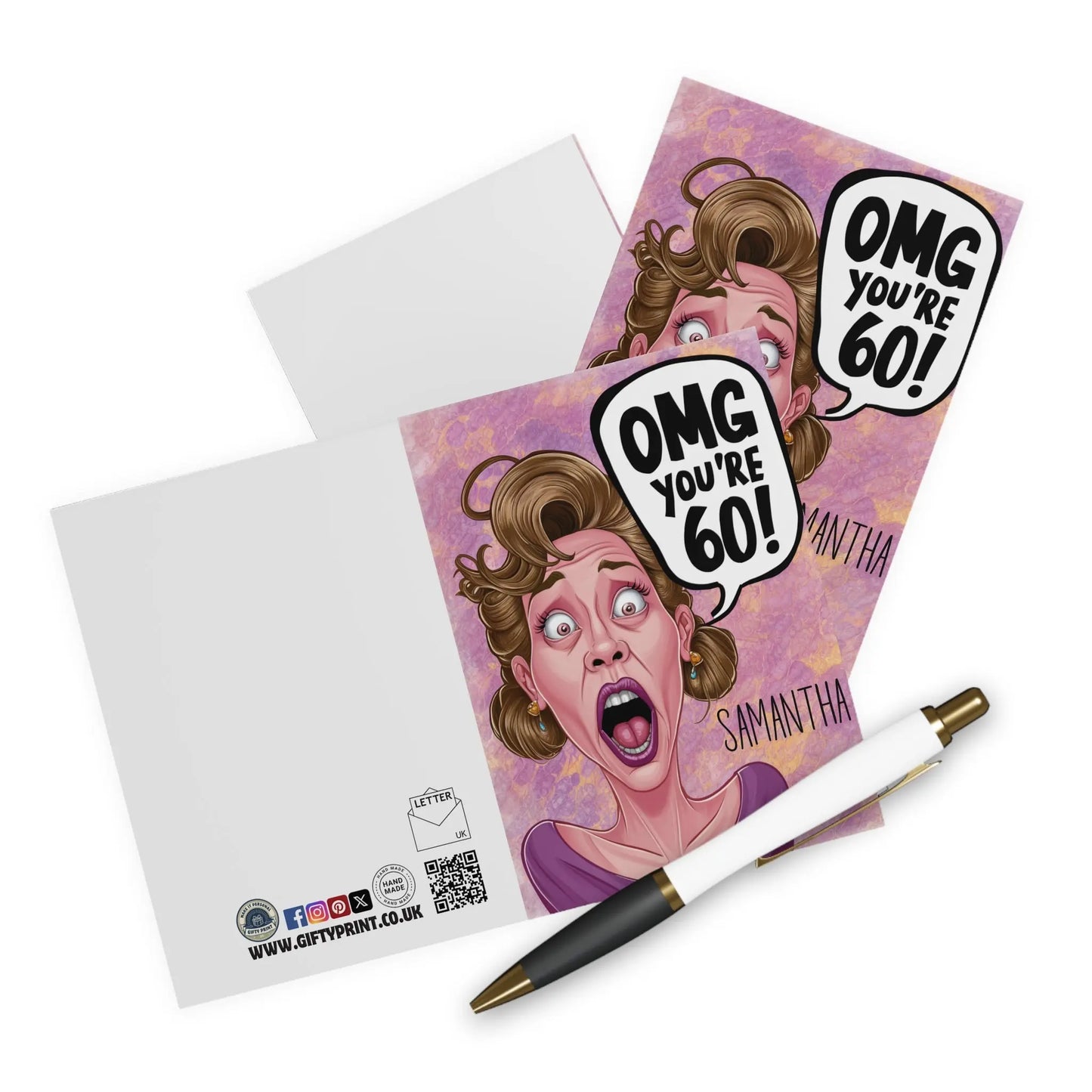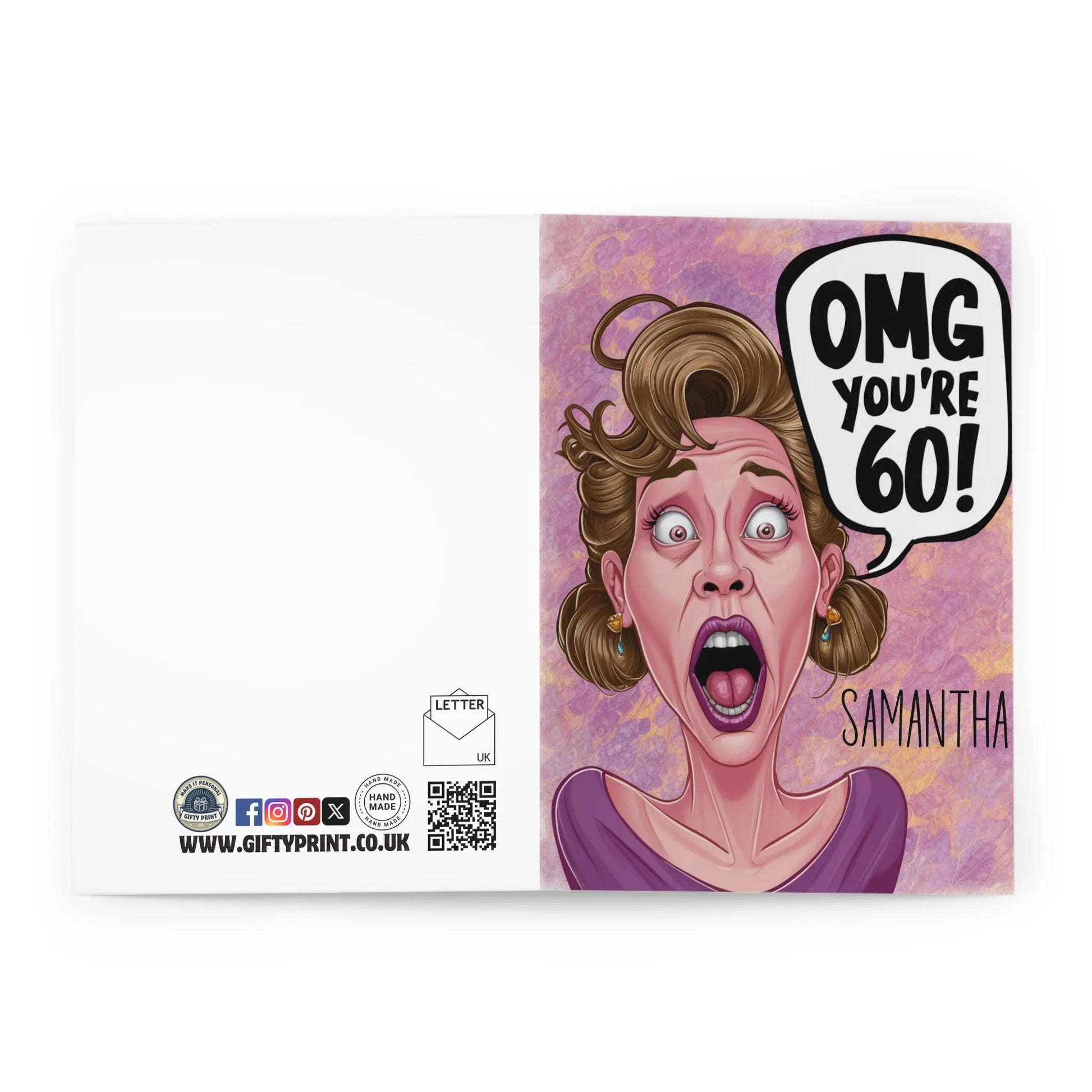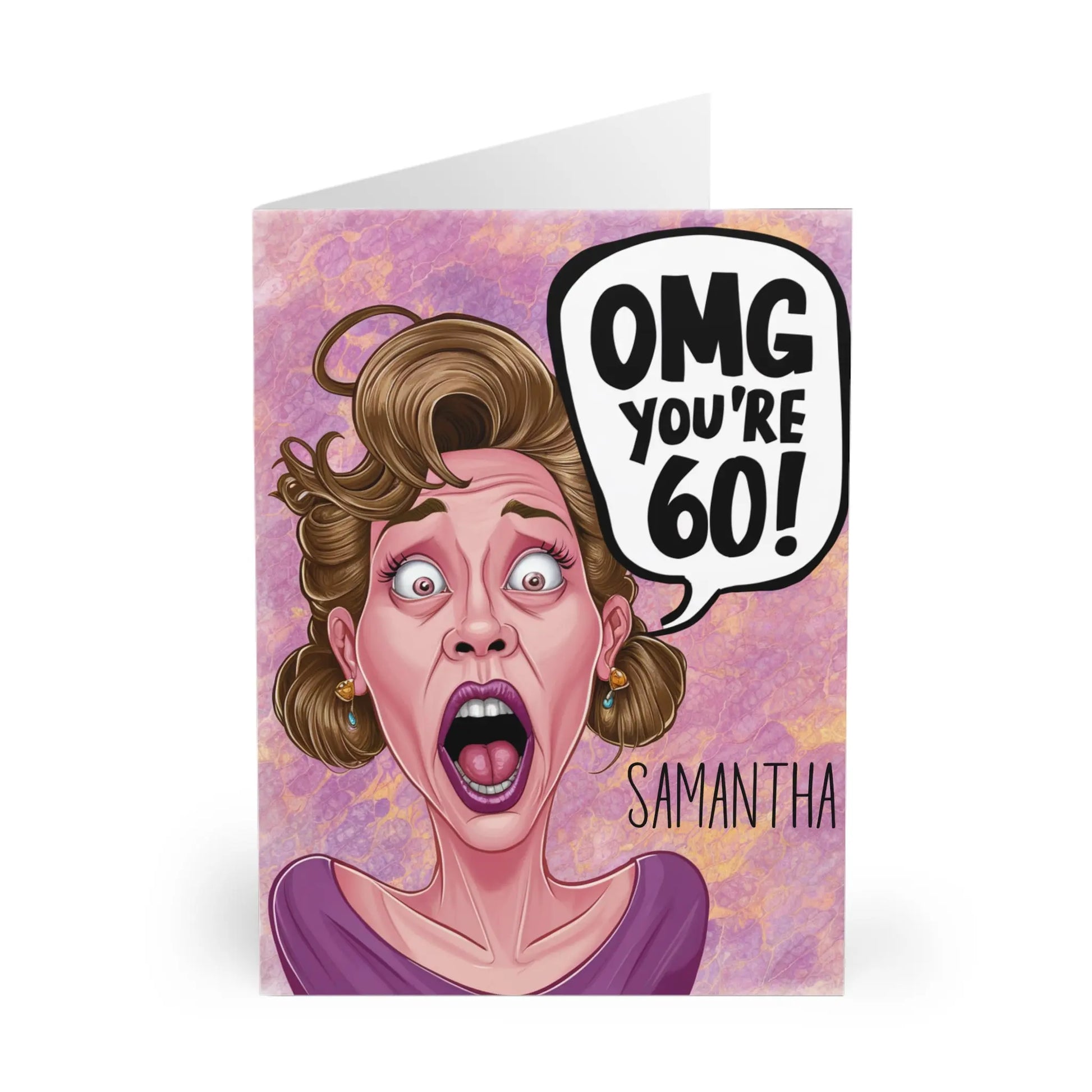 Funny Birthday Card Surprise the special lady in your life with our Personalised OMG You're 60 Shocked Lady! This quirky and playful Card celebrates their milestone birthday while showing off their unique personality. With a touch of humour and a dash of fun, this personalised card will surely make them smile!