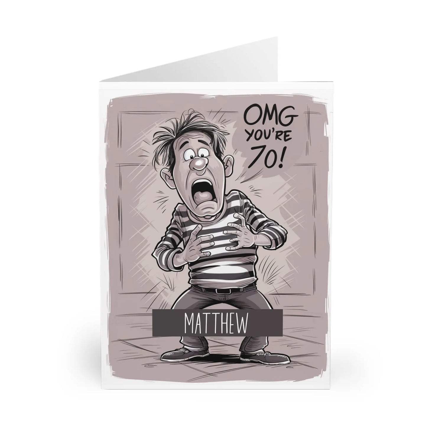 Funny Birthday Card Surprise your loved one with our Personalised OMG You're 70 Shocked Man 70th Birthday Card! This quirky card will bring a smile to their face while celebrating their special milestone. Add a personal touch with a custom name and make their day even more unforgettable!