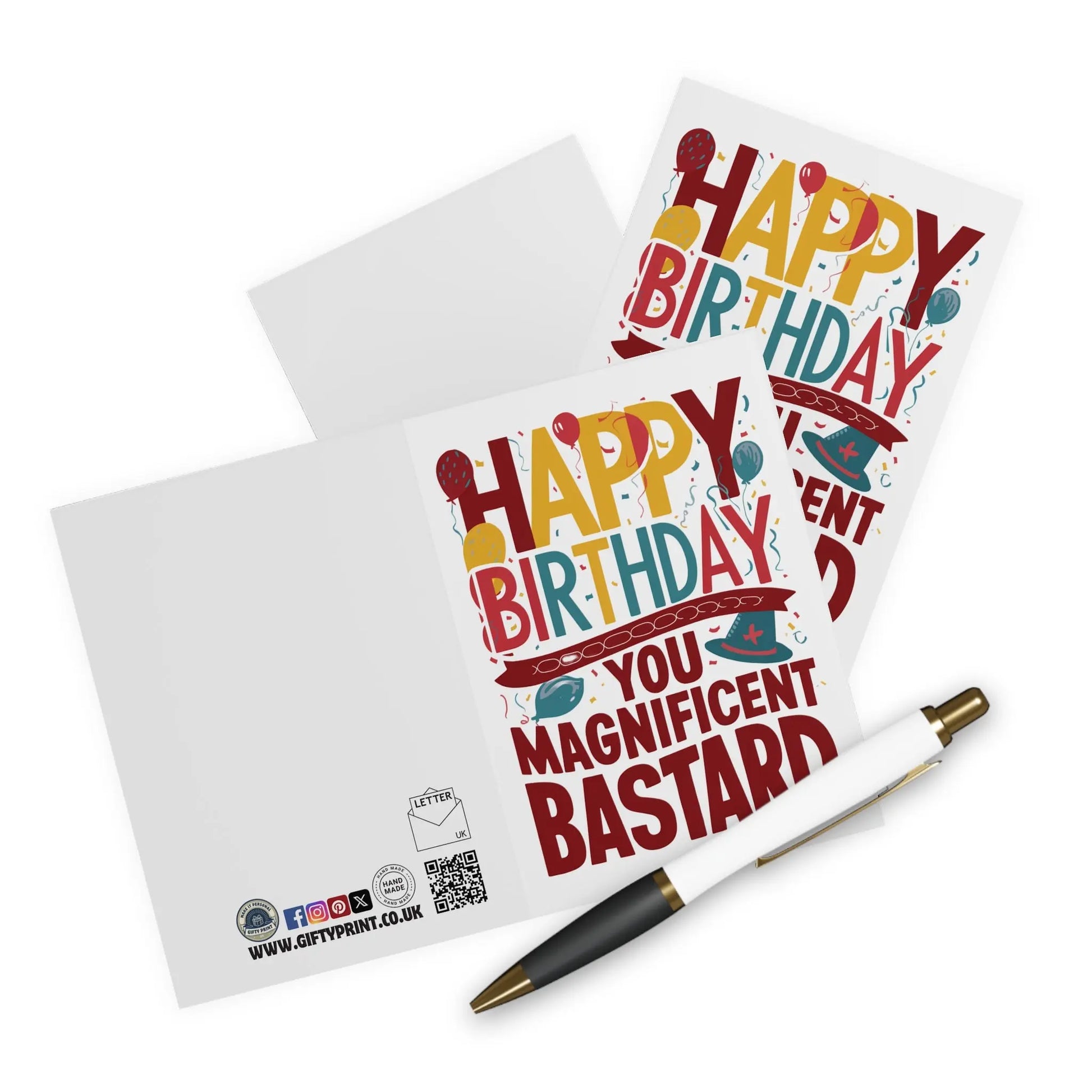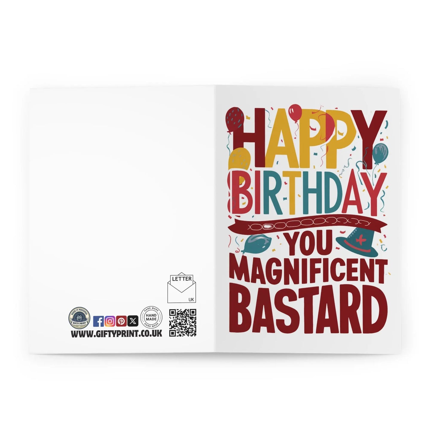 Funny Birthday Card, Celebrate the birthday of that special someone with this Rude Birthday Card! Wish them a happy birthday in a unique way with the words "Happy Birthday You Magnificent Bastard". Perfect for those who don't take themselves too seriously. Go ahead, spice up the celebration with some fun and humour!