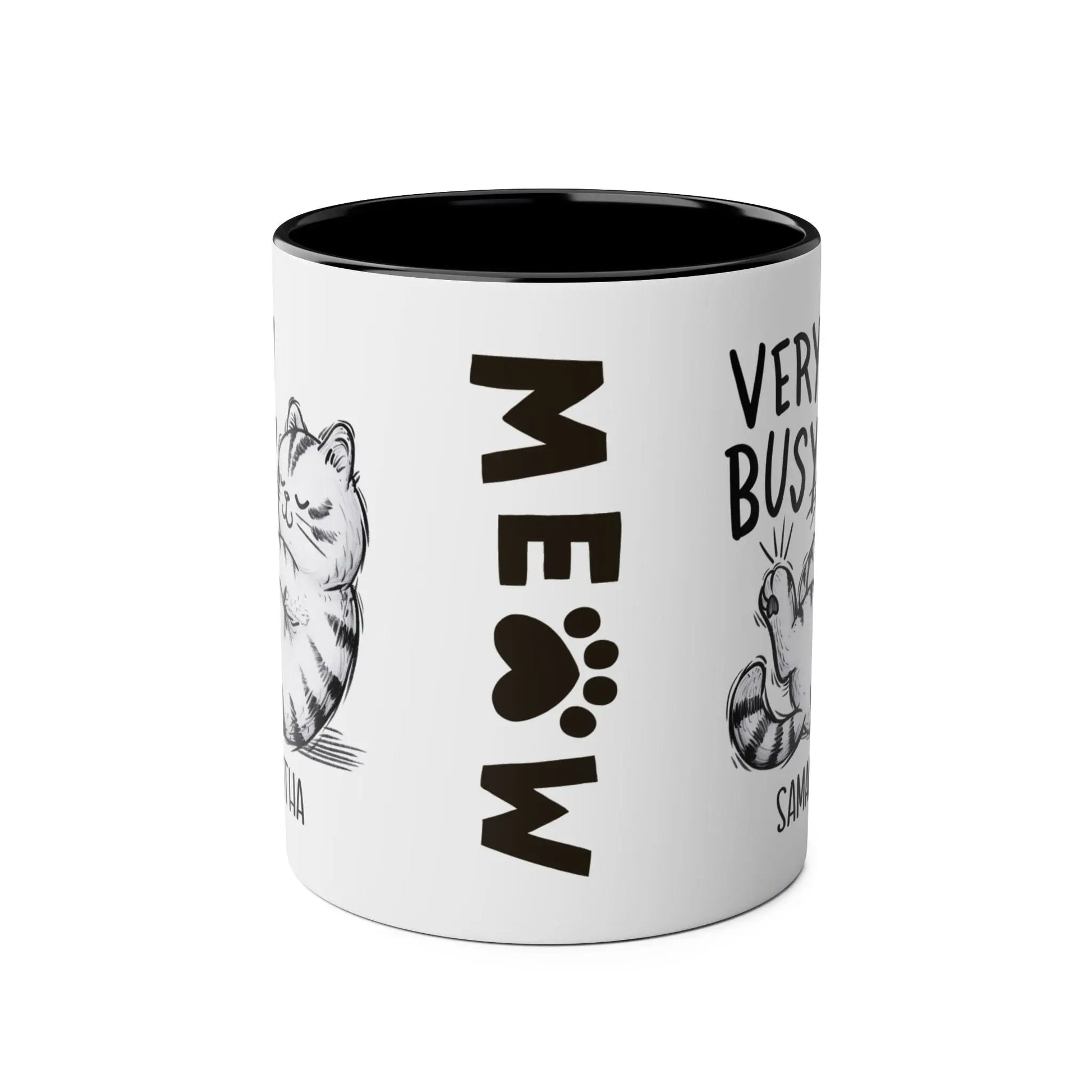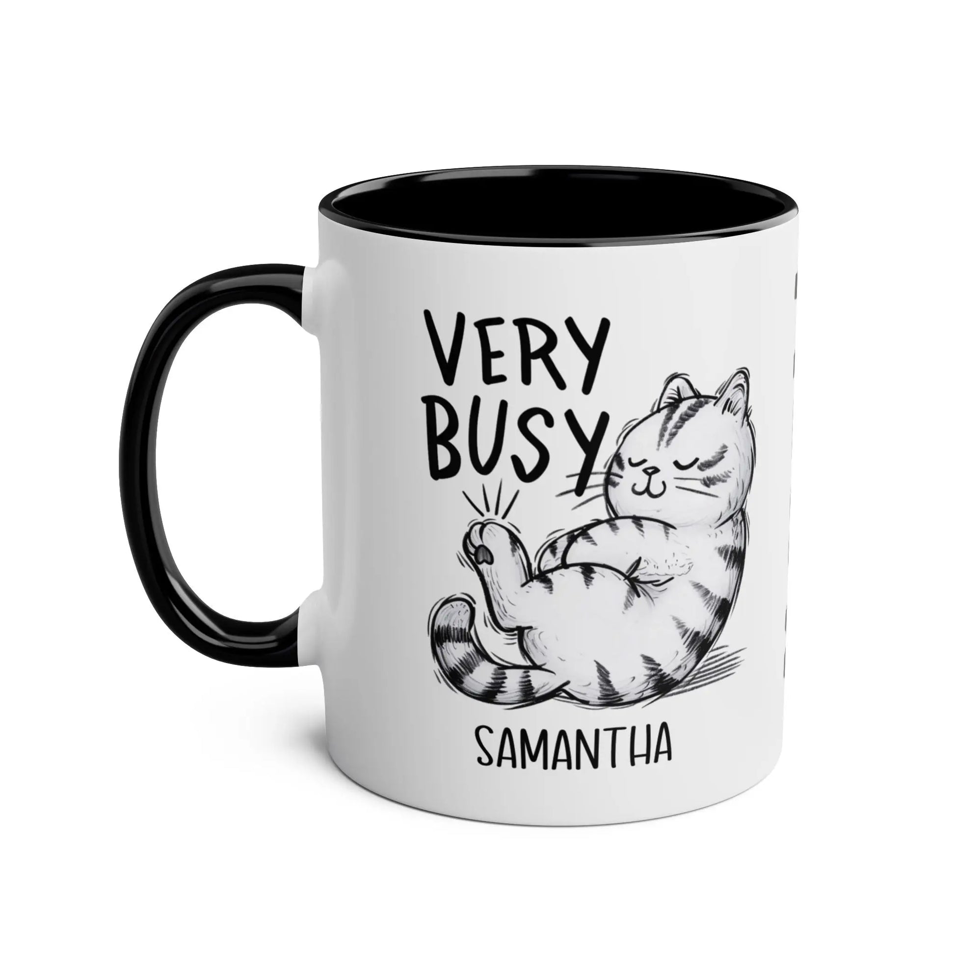 Funny Cat Mug. Need a dose of humour in your busy day? Look no further than our Personalised Very Busy Funny Cat Mug in Black! With a cat-tastic design and the option to personalise, this mug is sure to bring a smile to your face. Perfect for coffee, tea, or your favourite beverage. (Purr-fect gift for cat lovers!)