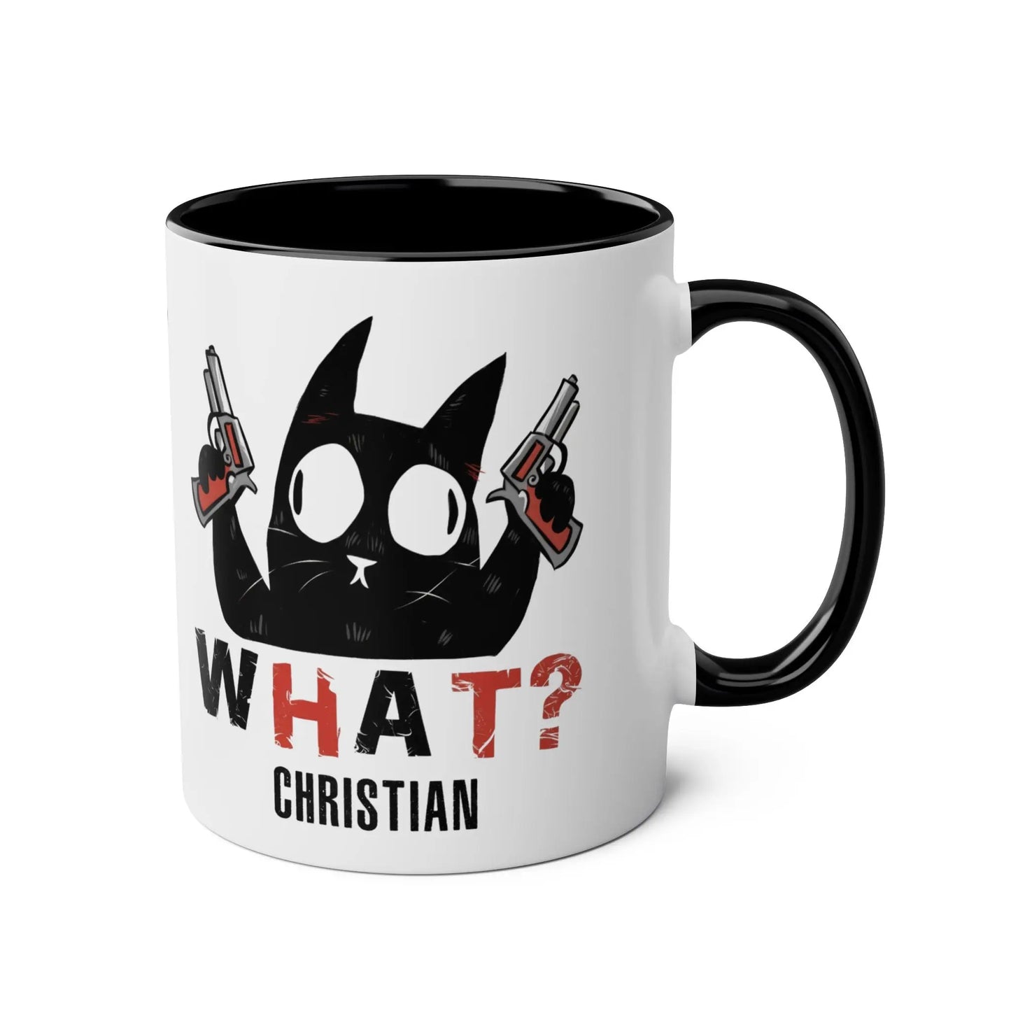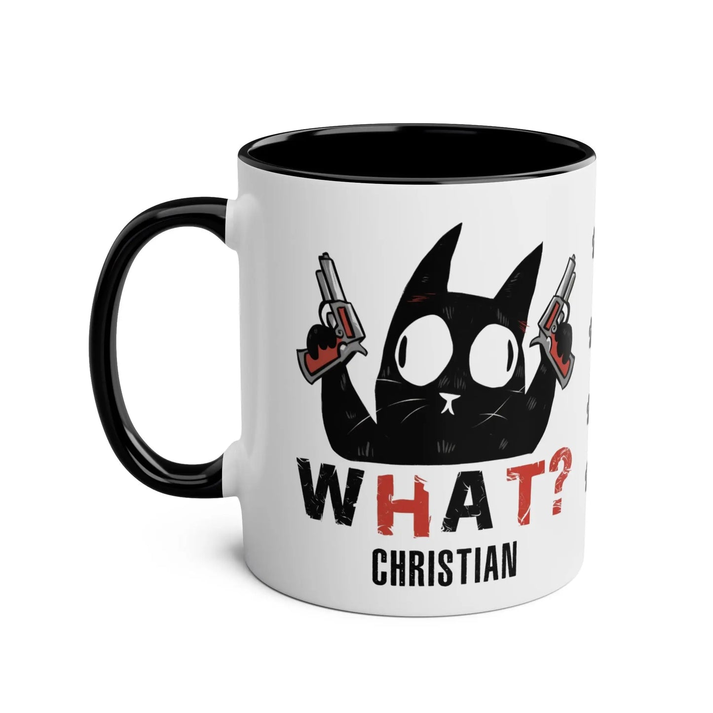 Funny Cat Mug, Unleash some laughs with our Personalised Cat With Guns Mug! This funny cat mug is the purrfect addition to your morning routine. Customise with your name for a unique touch (meow-mazing, right?). Because who needs a boring mug when you can have a cat with guns?!