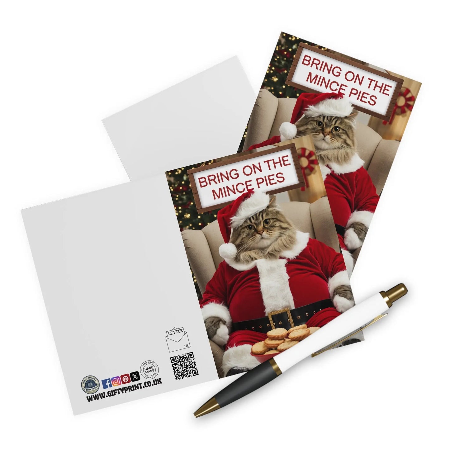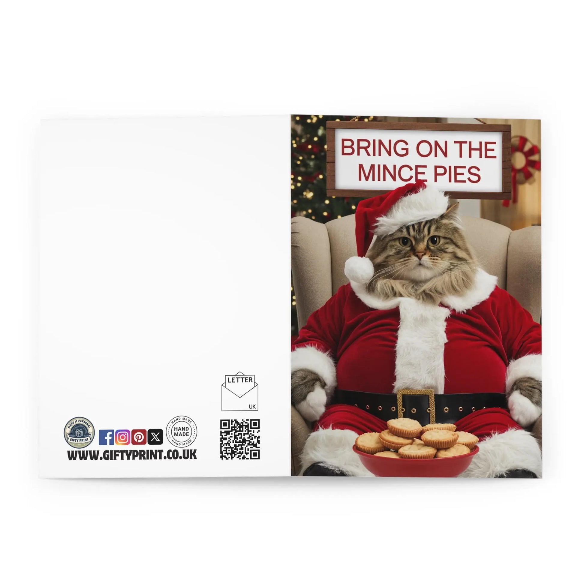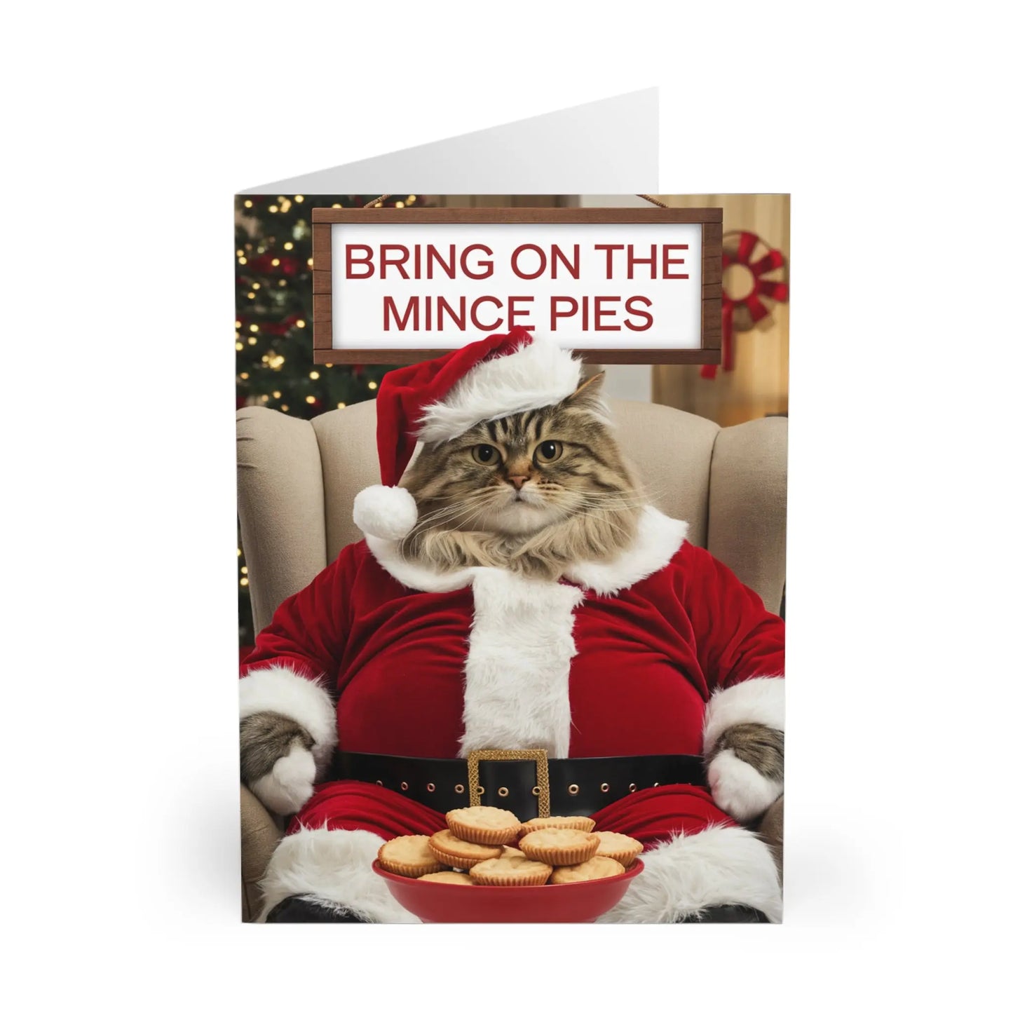 Funny Christmas Card Get ready to laugh with this Funny Cat Christmas Card! Featuring a hilarious feline and a festive message of "Bring On The Mince Pies," this card is purr-fect for spreading holiday cheer. Send some laughs to your loved ones this Christmas season!