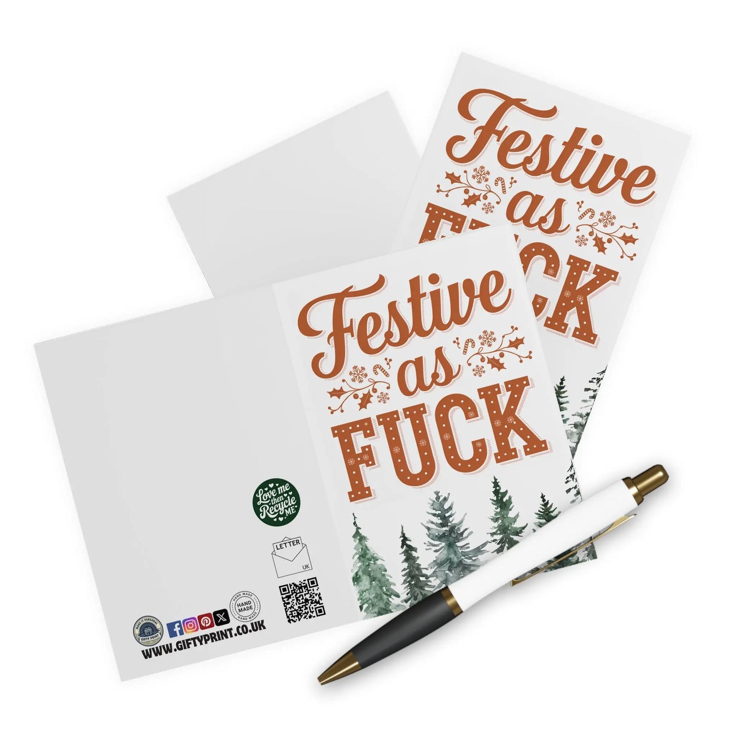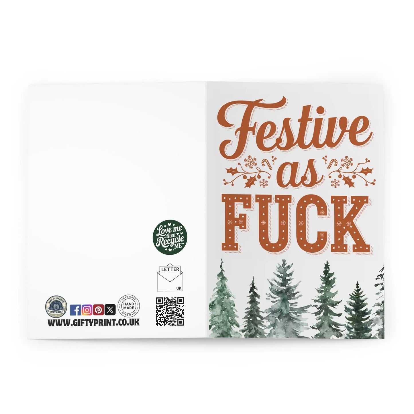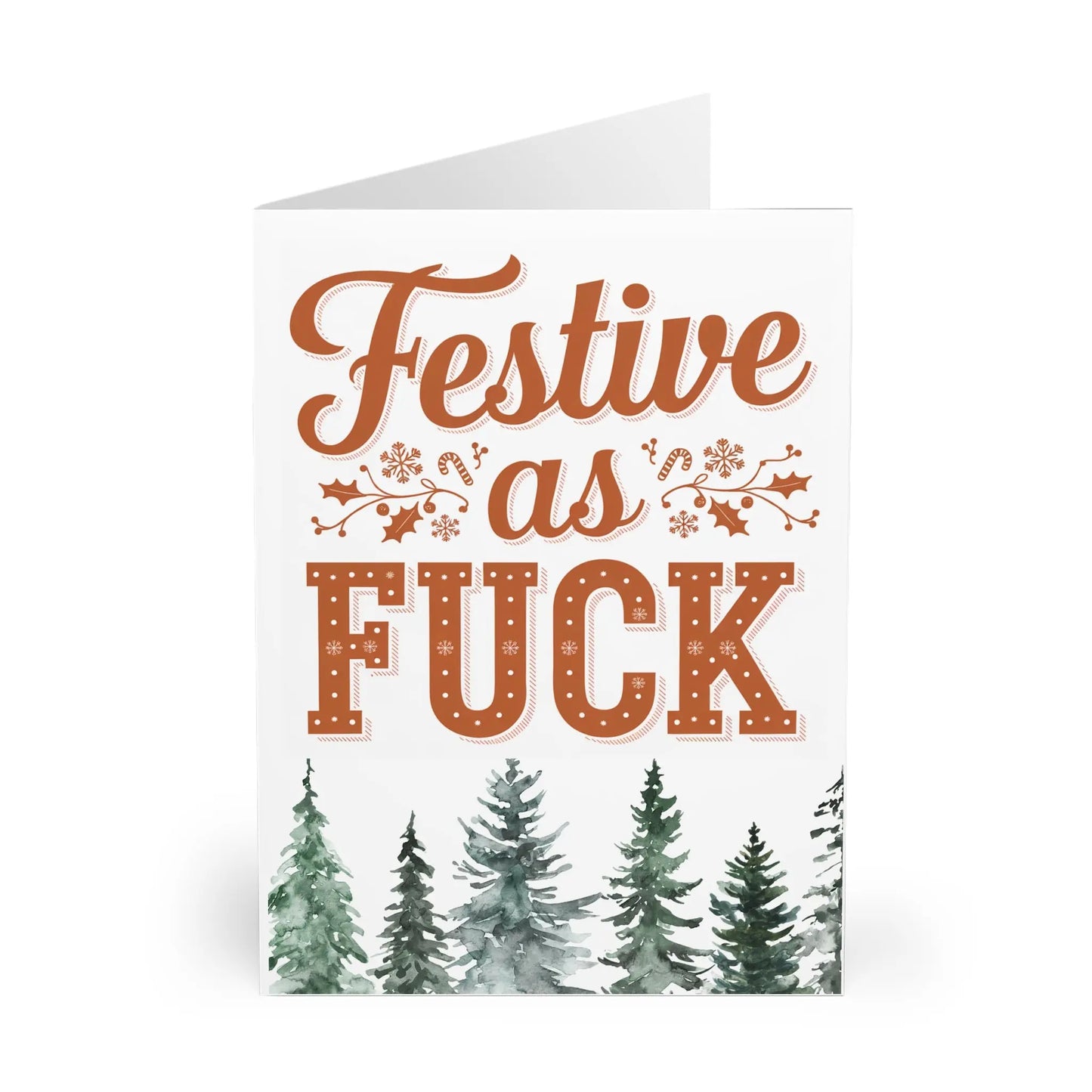 Funny Christmas Card, Get in the holiday spirit with this hilarious Christmas card! Featuring the phrase "Festive As Fuck", this card will make anyone laugh and add some fun to the festivities. Say goodbye to boring holiday cards, and send this one-of-a-kind card to your loved ones. Spread some cheer and humour this Christmas!