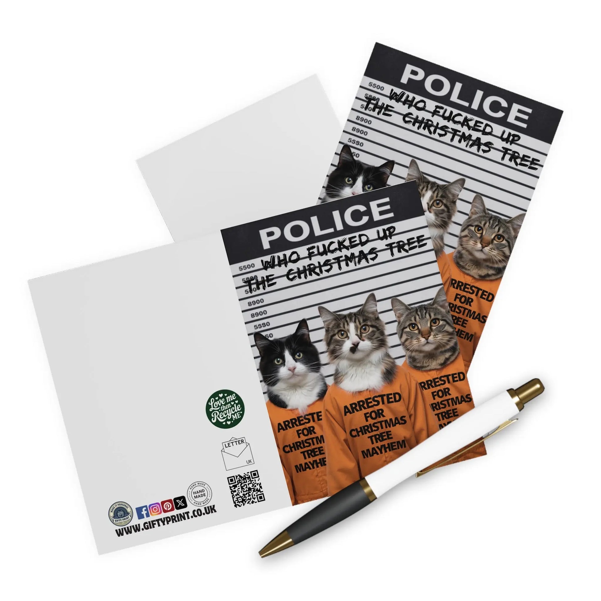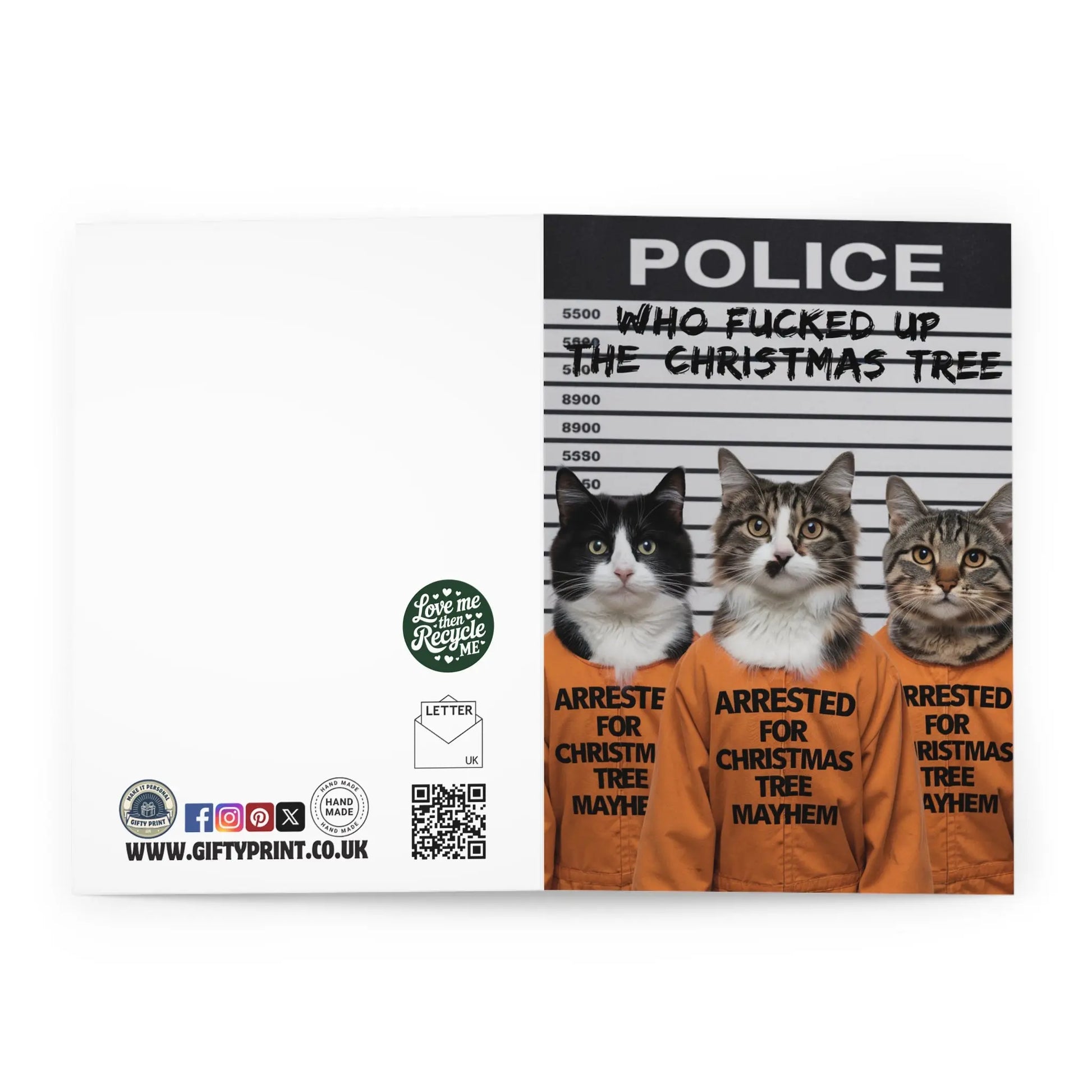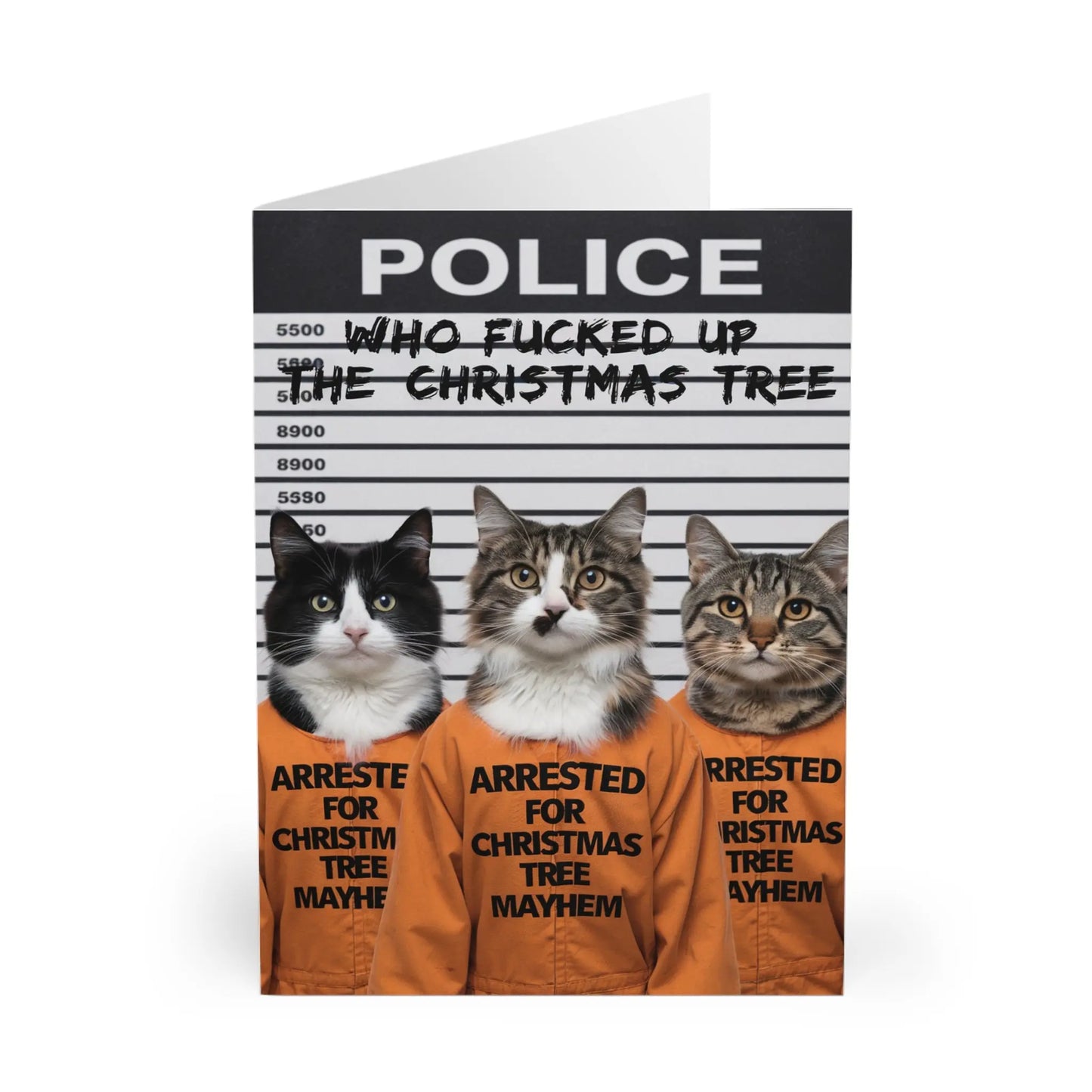 Funny Christmas Card, Get ready to spread some holiday cheer with our Funny Cat Christmas Card "Line Up Who Fucked The Tree Up"! This humorous and quirky card is perfect for anyone who loves cats and a good laugh. Let these mischievous felines bring a smile to your loved ones' faces this holiday season