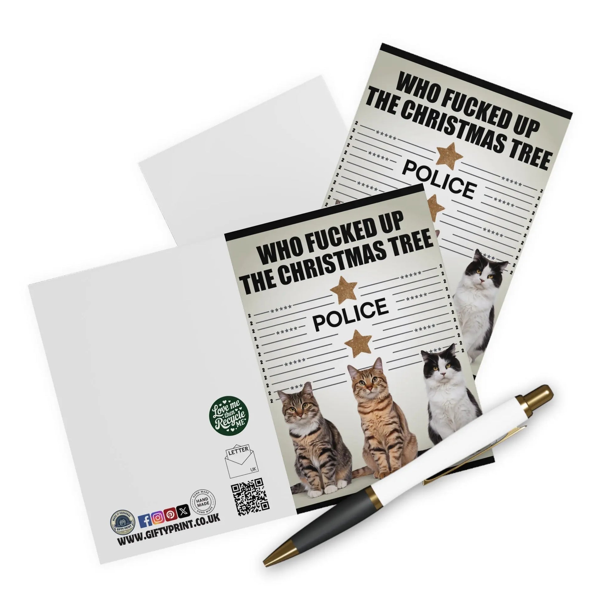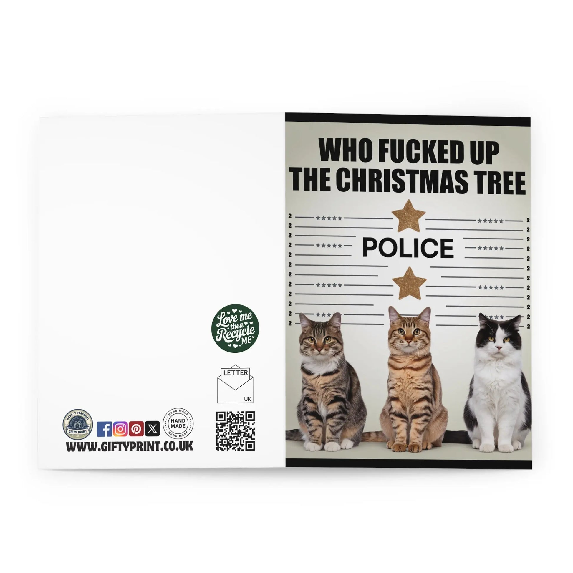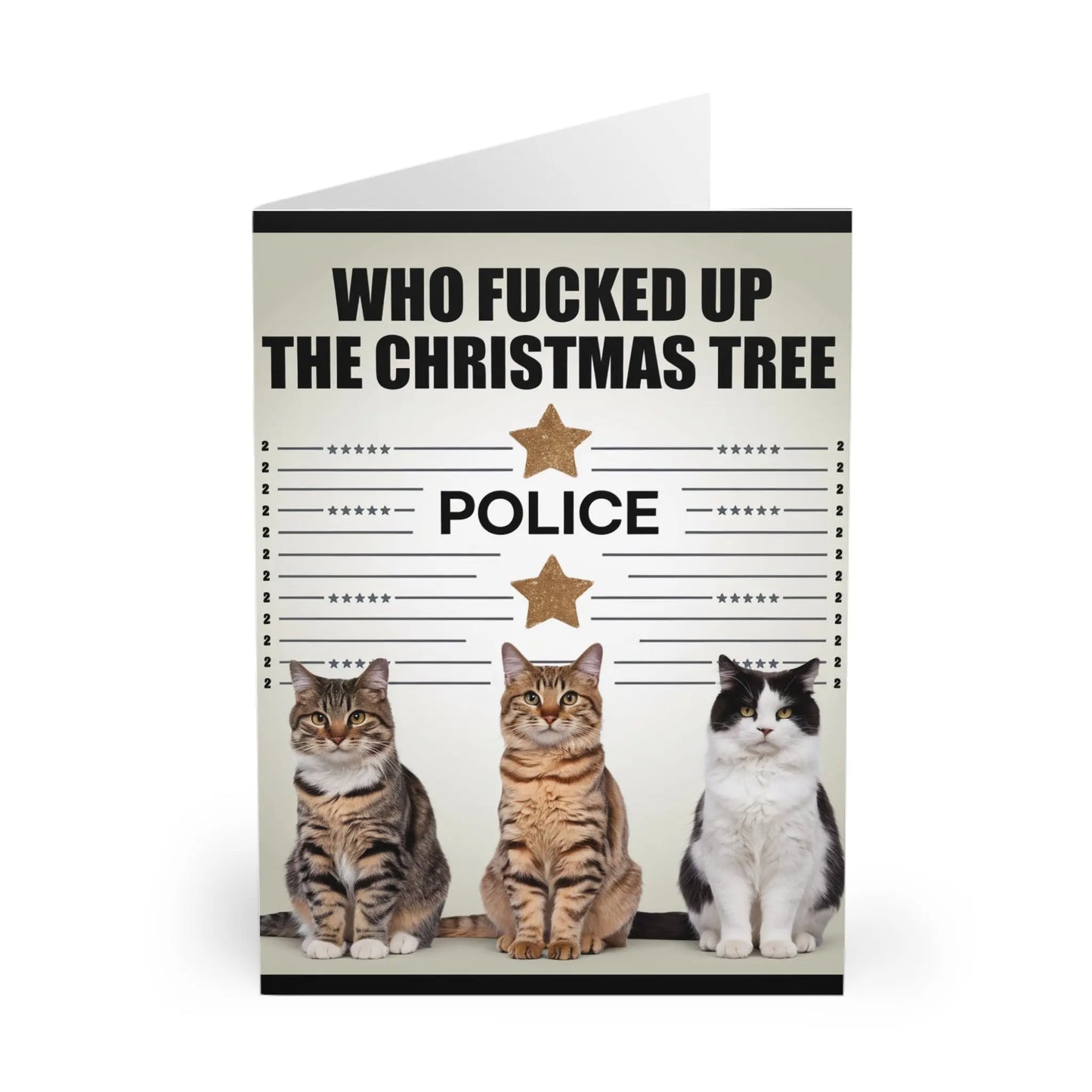Funny Christmas Card, Get your paws on this hilarious Christmas card featuring a cat police line up asking "Who Fucked The Tree Up?" Perfect for cat lovers and those with a playful sense of humour. Spread some holiday cheer with this quirky card. (No cats were harmed in the making of this product.)