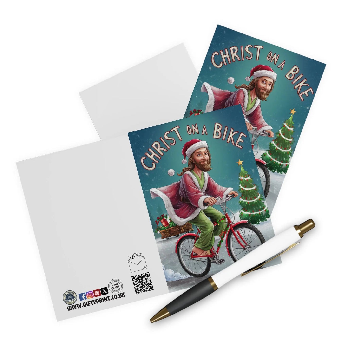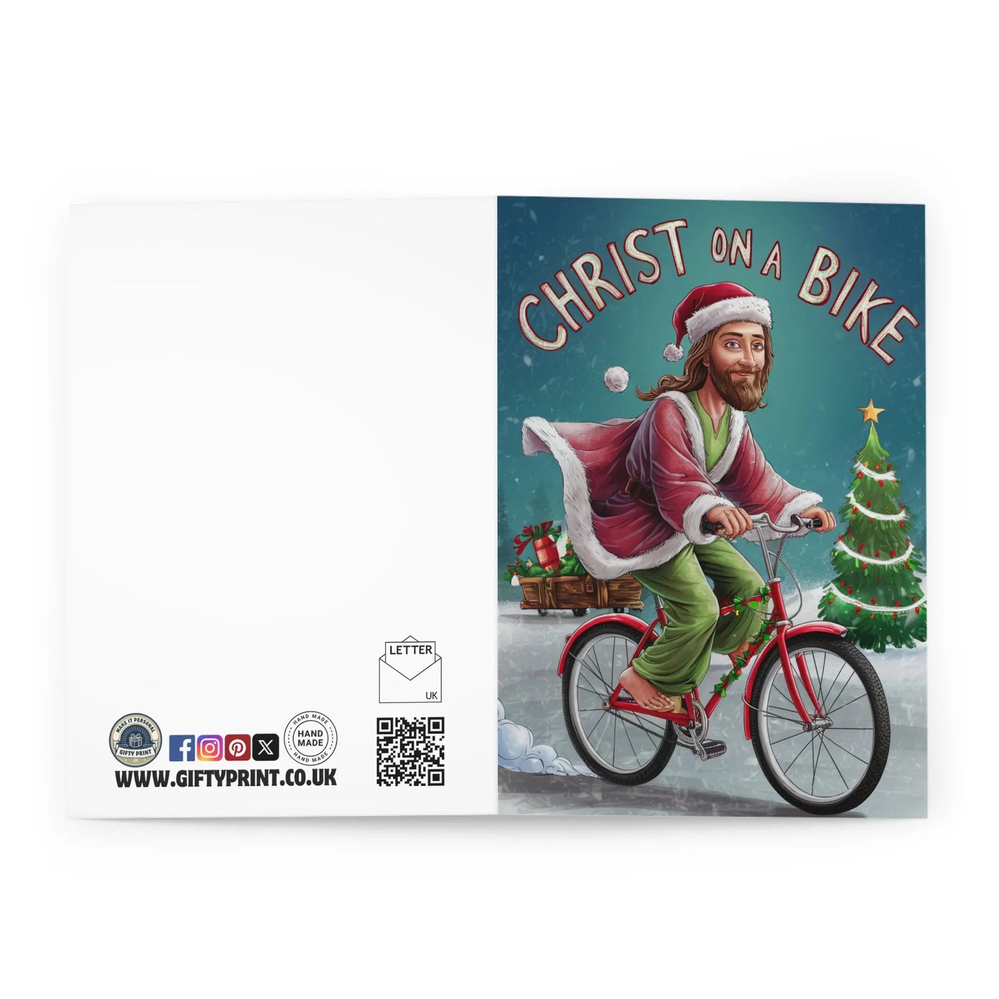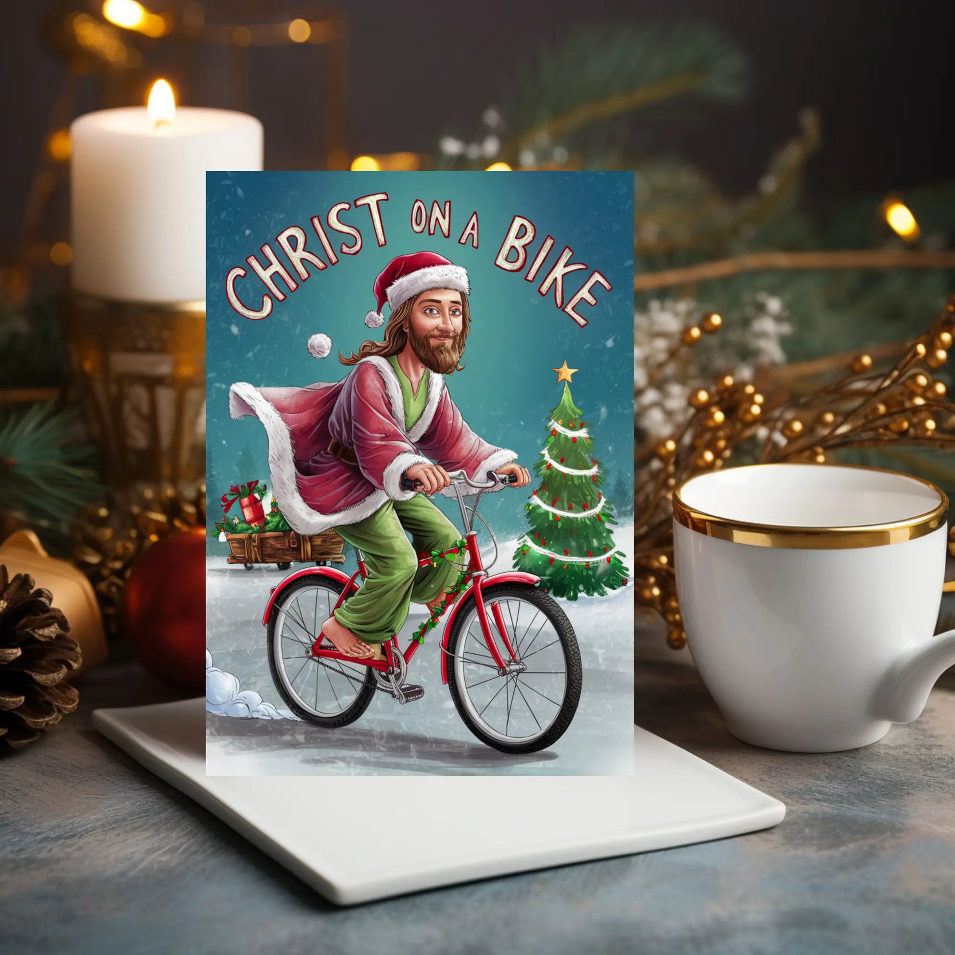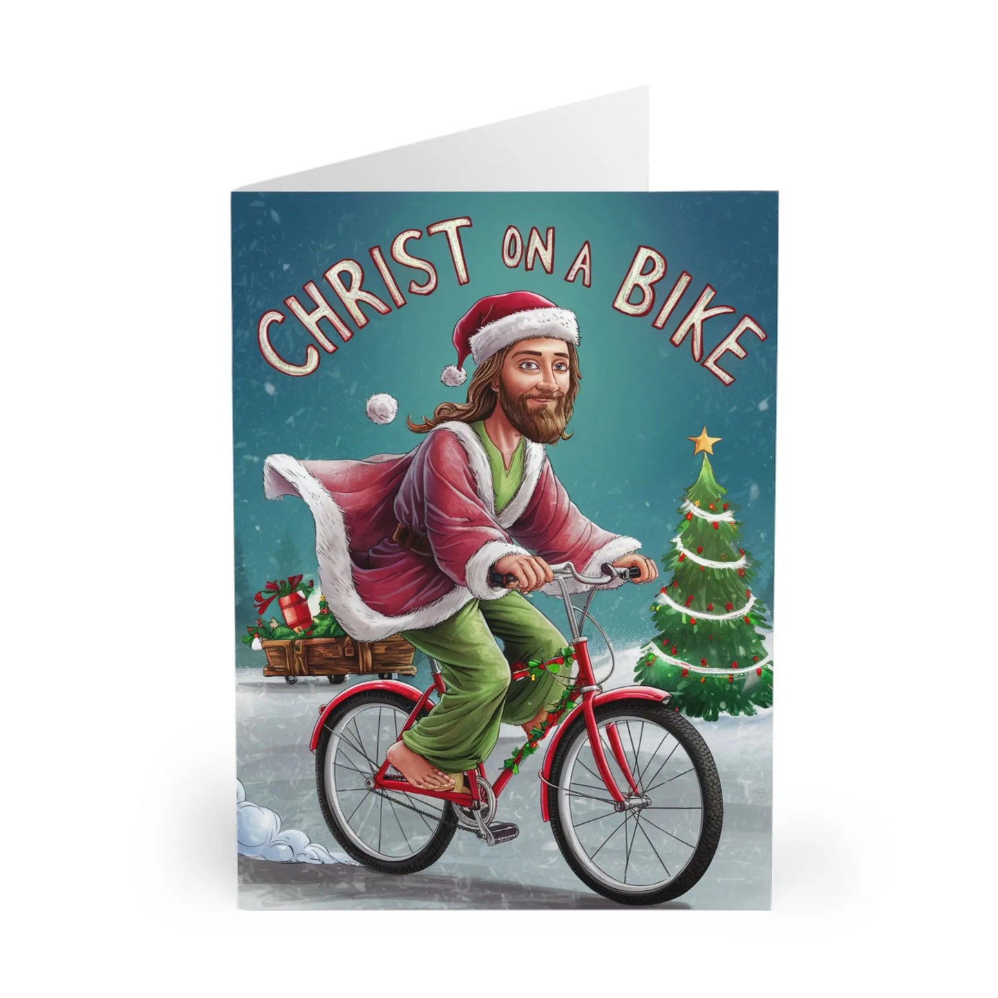 Funny Christmas Card, Get ready to spread some holiday cheer with our Funny Jesus Christmas Card featuring Christ on a Bike! This playful and quirky card will have your friends and family laughing out loud. Perfect for those who don't take themselves too seriously.