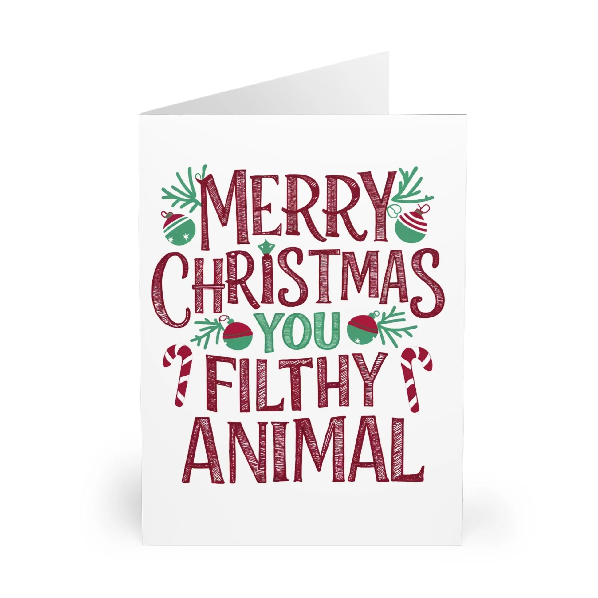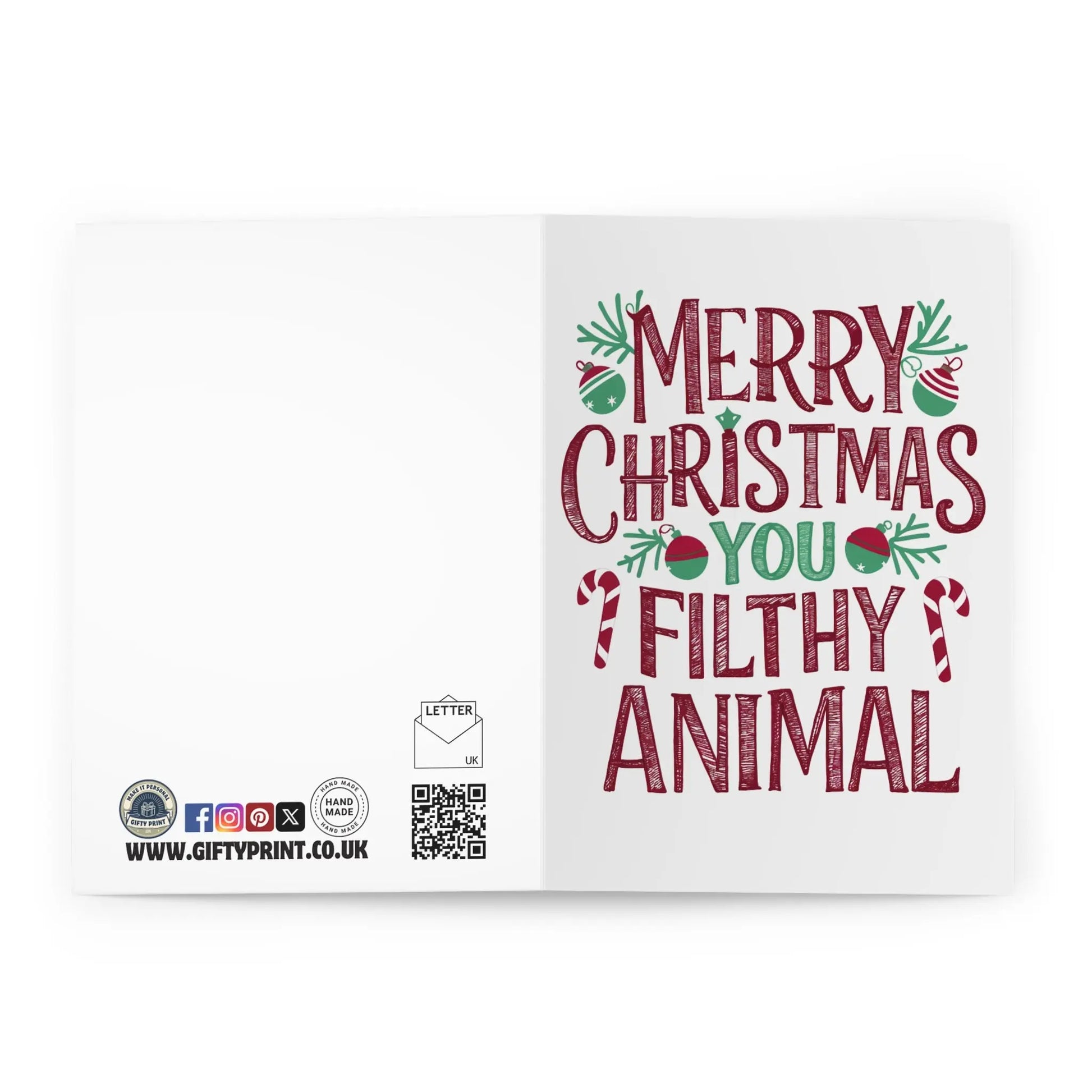 Funny Christmas Card, Get into the holiday spirit and spread some laughs with our Christmas Card that reads "Merry Christmas You Filthy Animal"! Perfect for those with a sense of humour, this card adds a playful touch to your holiday wishes. Order now and make someone's day merry and bright!