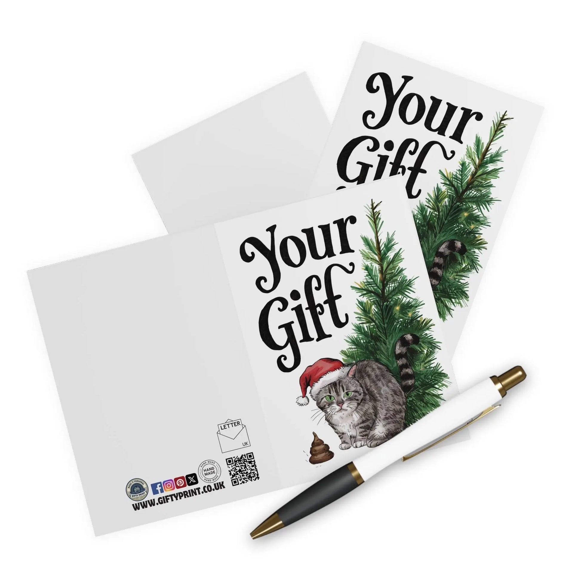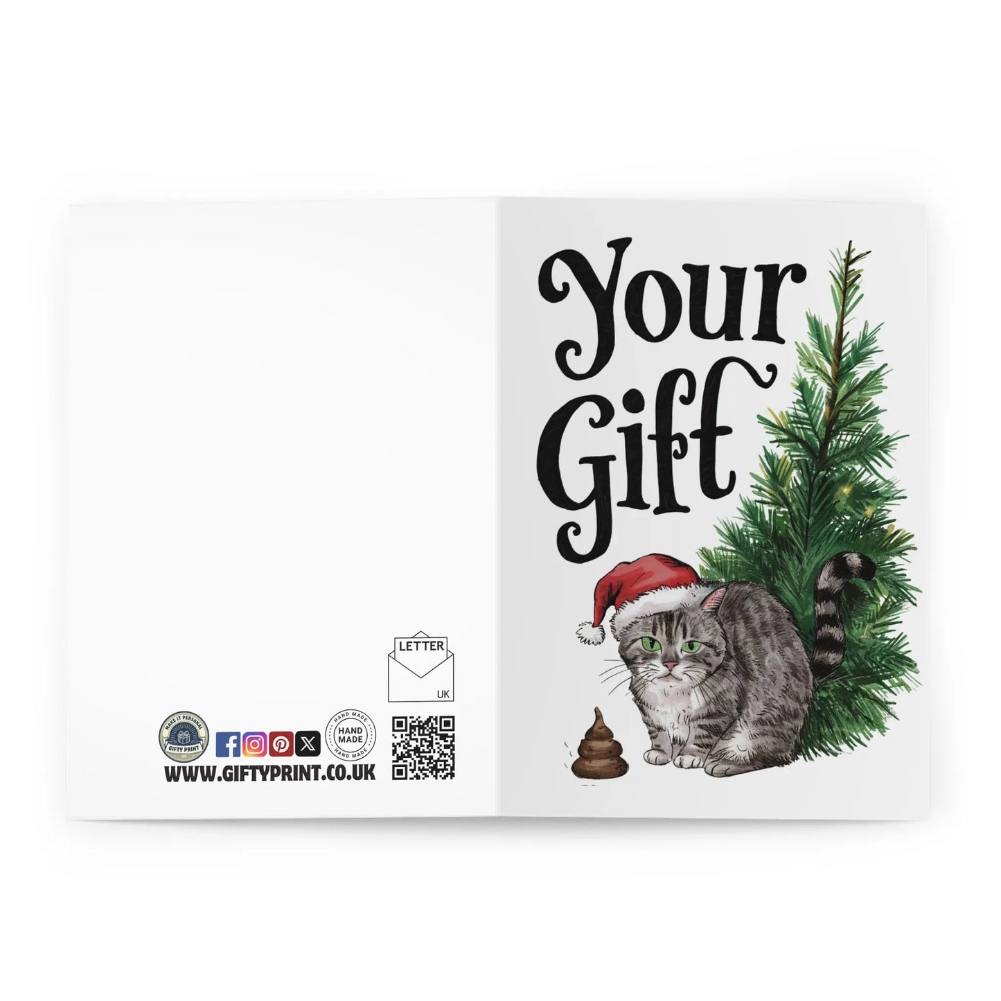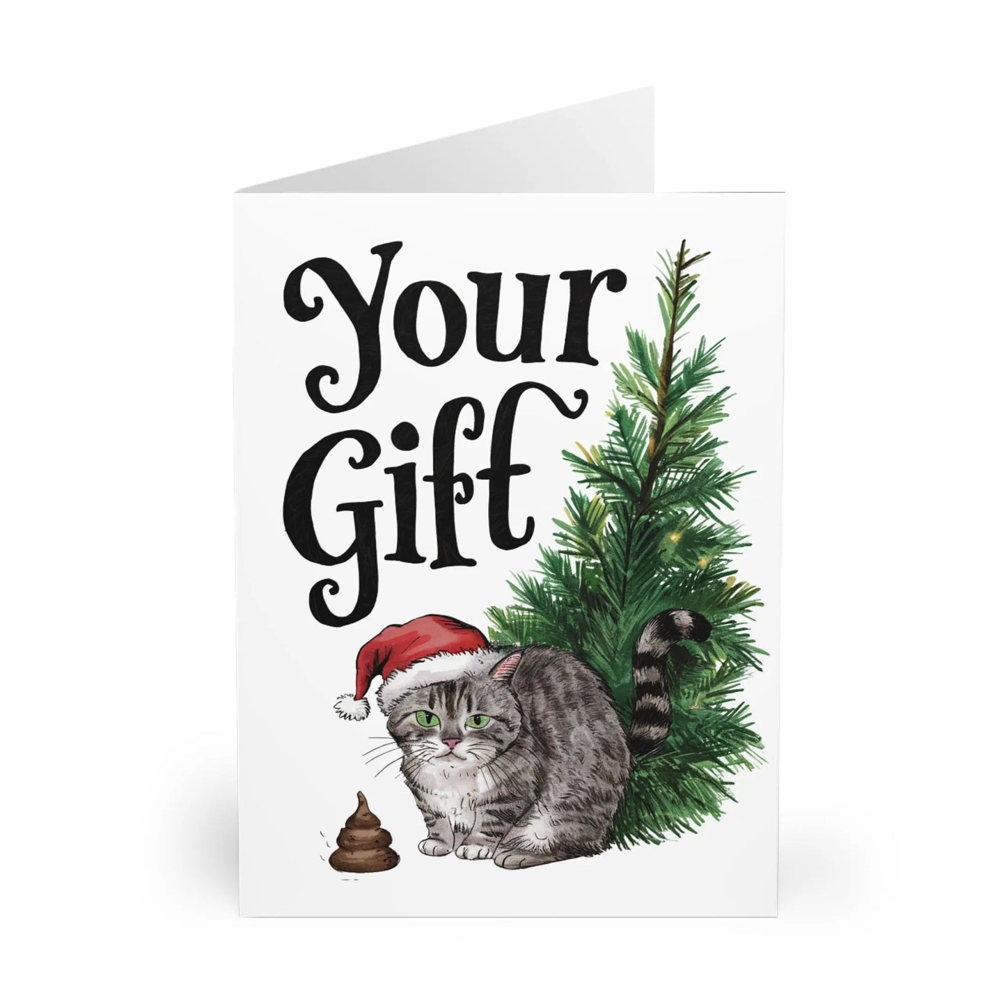 Funny Christmas Card, Send a cheeky holiday greeting with our Christmas Card featuring a naughty cat, poop under the tree, and the message 'Your Gift'! Get a good laugh from your loved ones as they open this playful and playful (yes, we said playful twice) card. So much fun, it's purrfect!