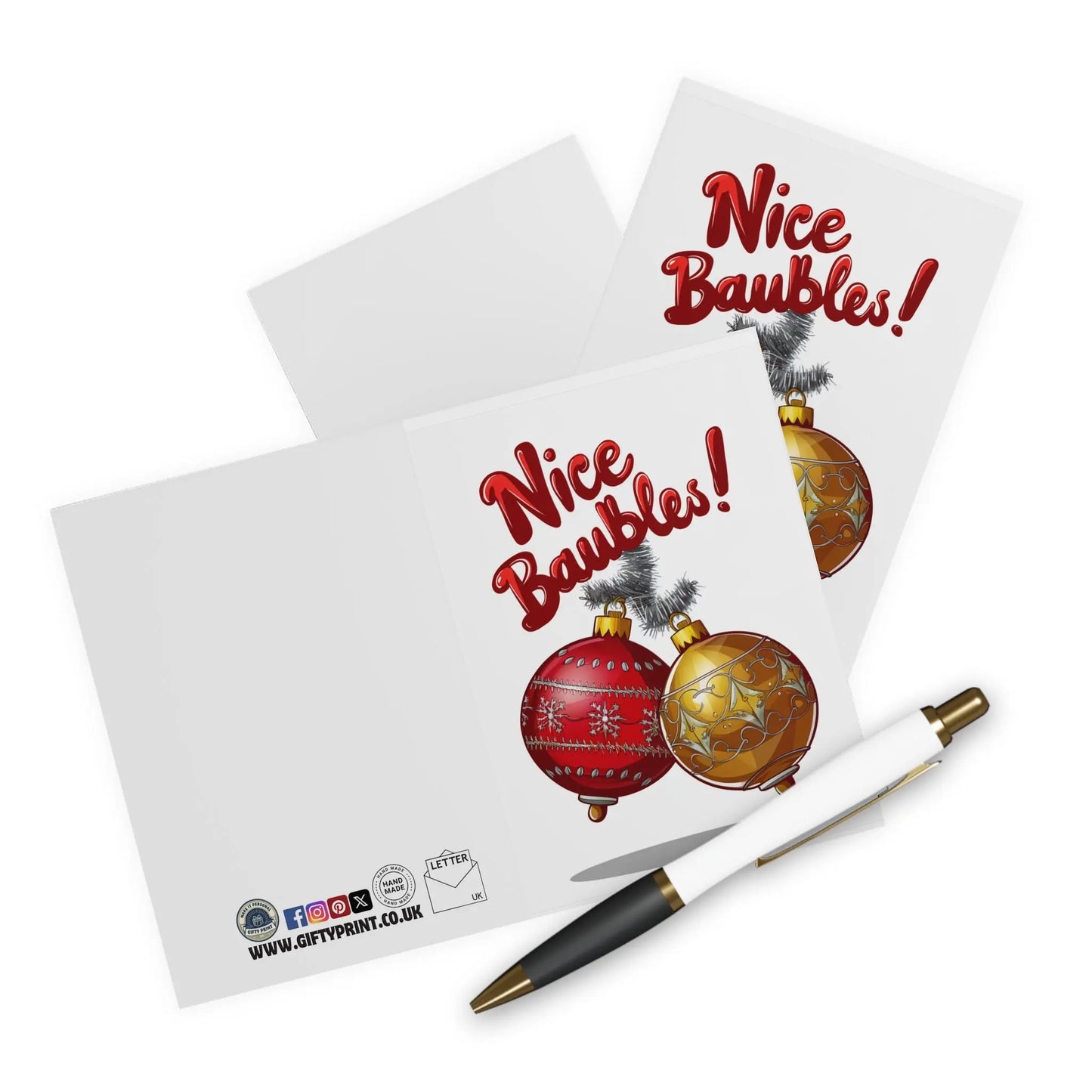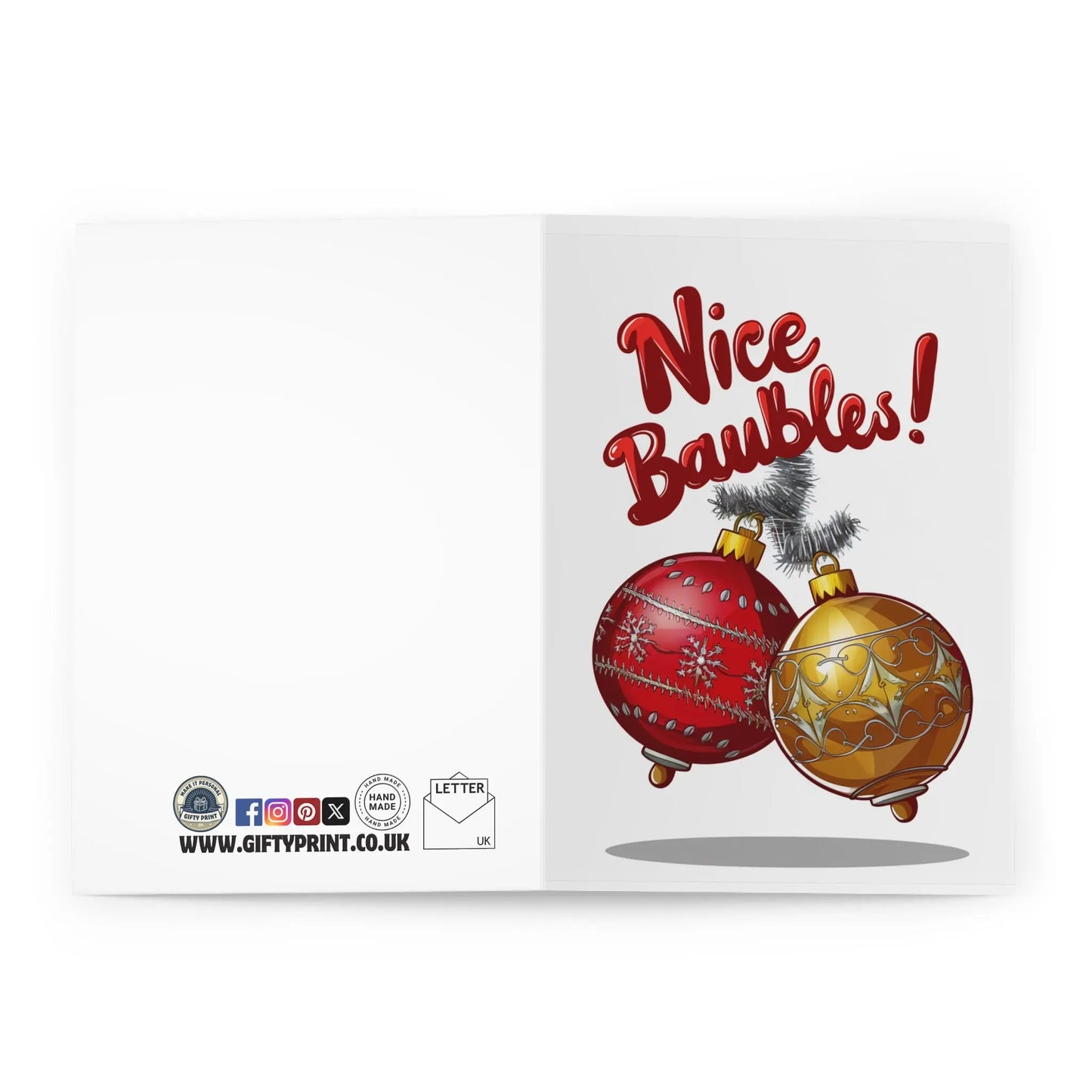 Funny Christmas Card, Spread cheer and laughter with our Christmas Card Nice Baubles! A playful pun to send some holiday joy, this card features a fun and quirky design that will bring a smile to anyone's face. Share the love and laughter this holiday season with our Christmas card.