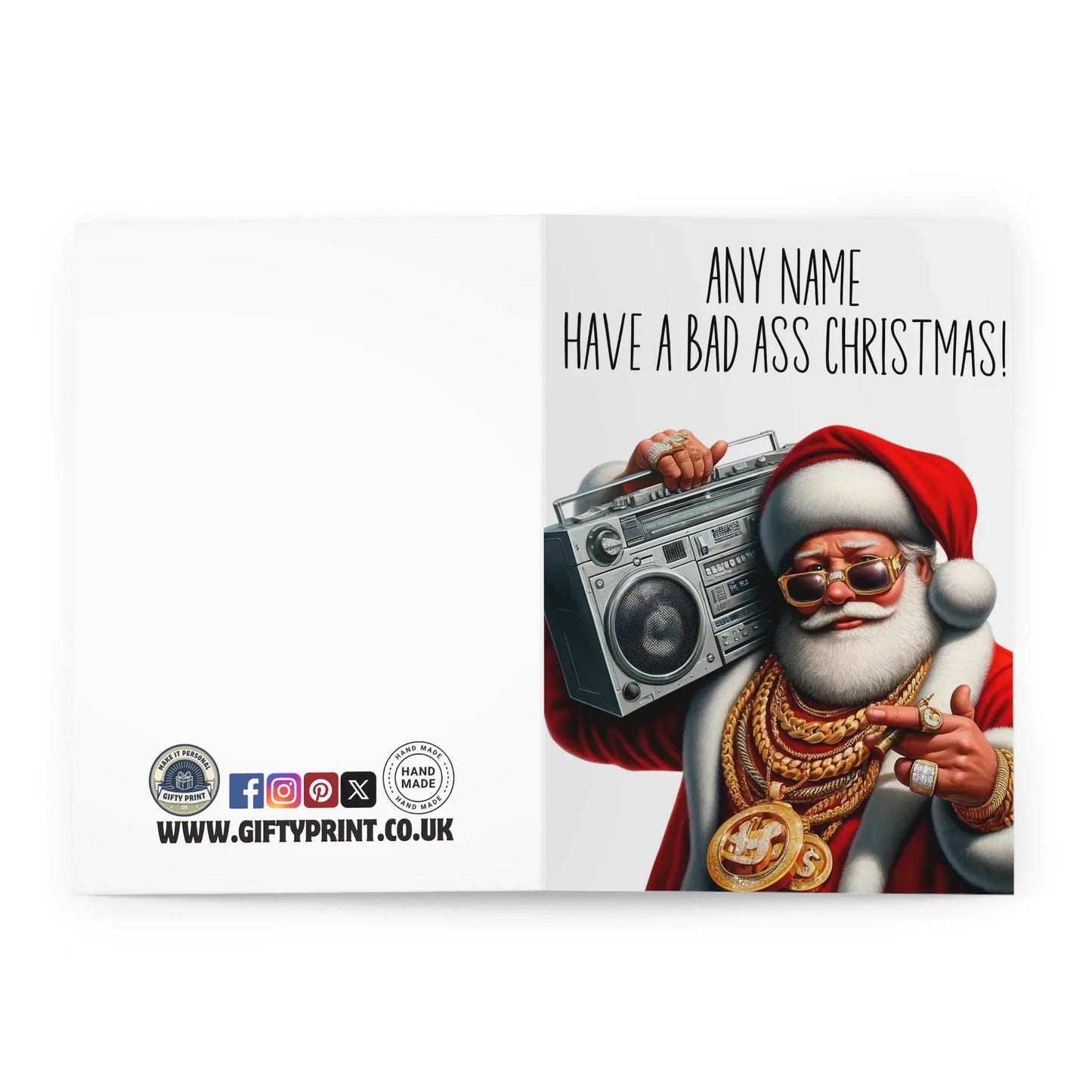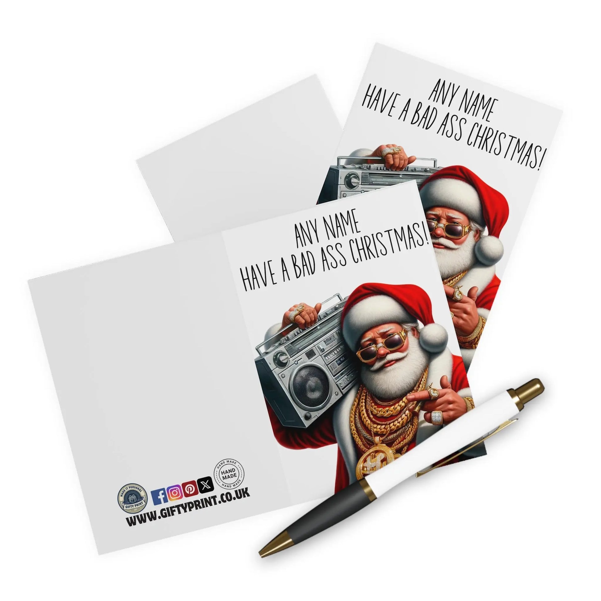 Funny Christmas Card, Get ready to sleigh Christmas with this personalised Have A Bad Ass Christmas Gangsta Santa! With a touch of swagger and personalized name, your holiday will turn into a gangsta paradise. Don't miss out on this unique and fun twist on the classic Santa.