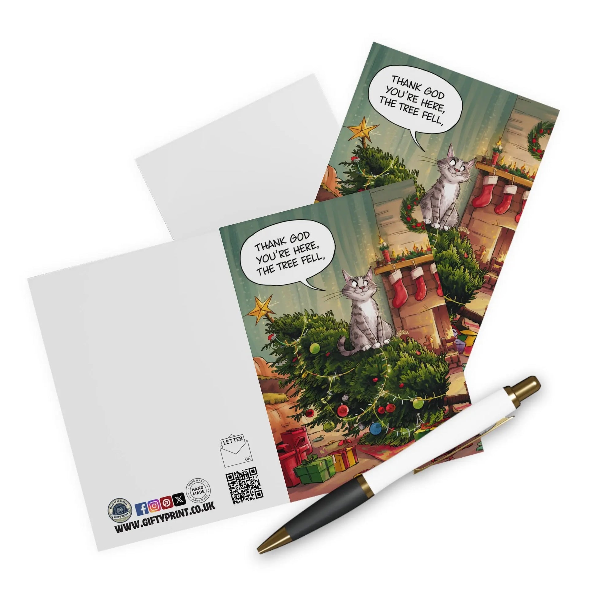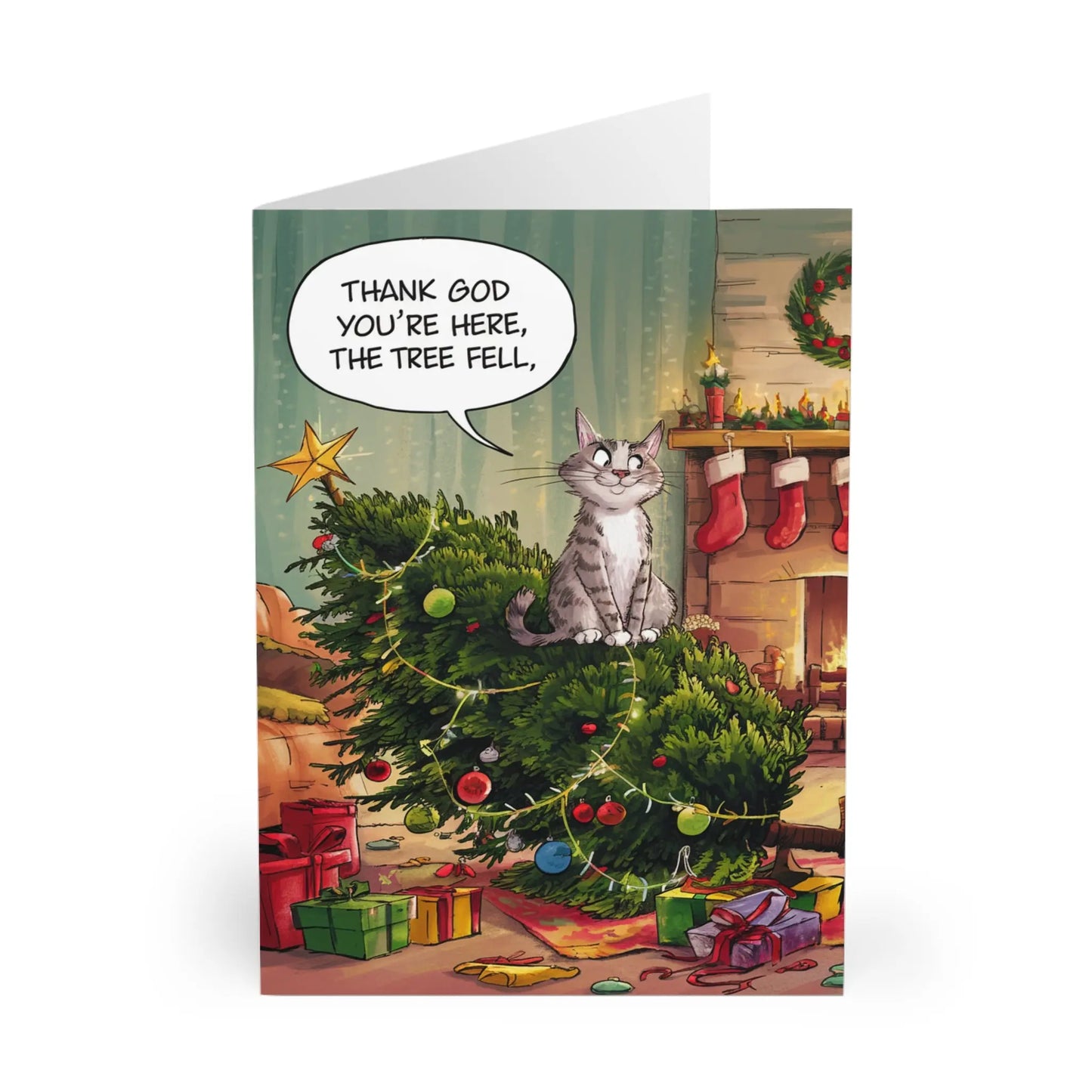 Funny Christmas Card Thank God You're Here The Tree Fell Funny Cat