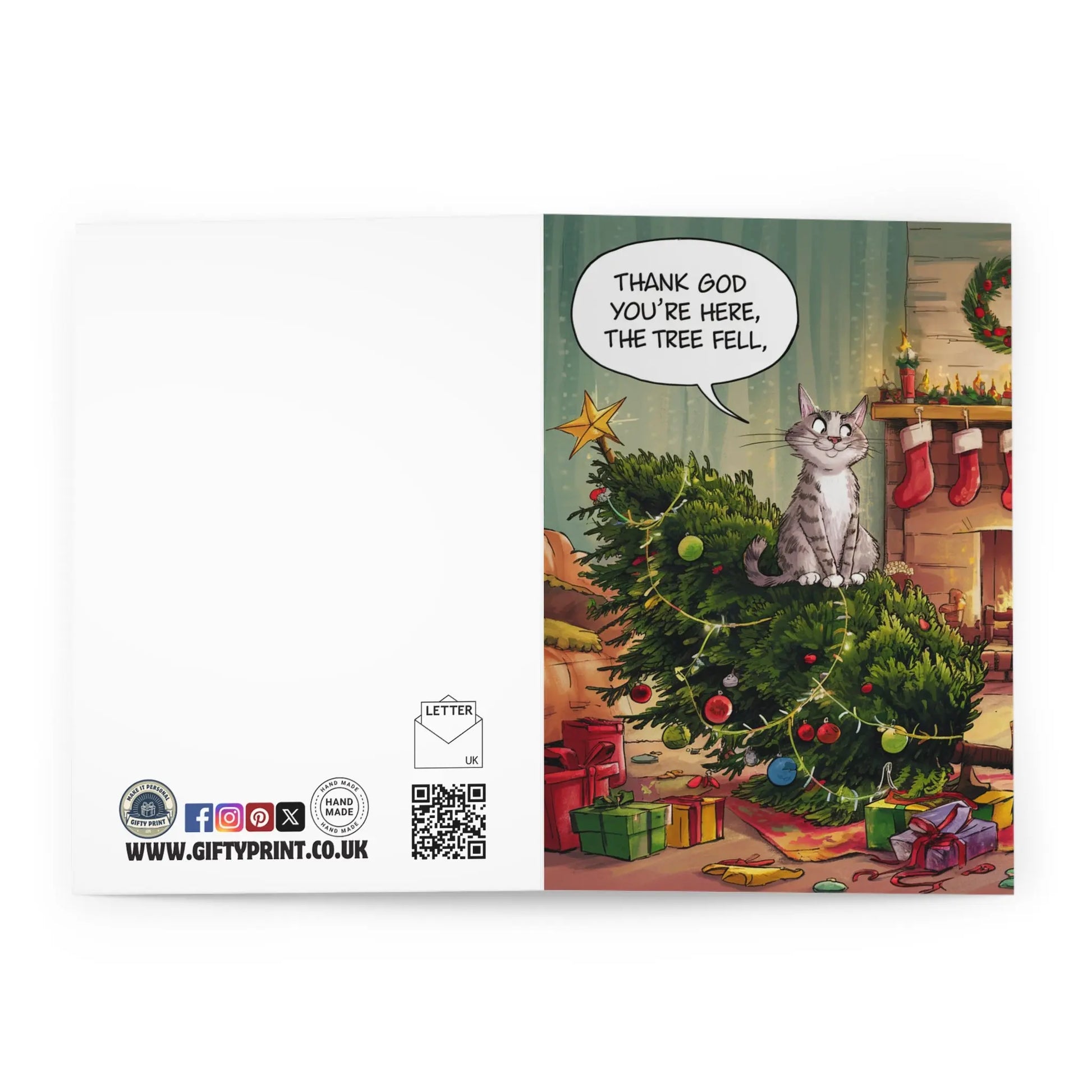 Product Details For Funny Christmas Card Thank God You're Here The Tree Fell Funny Cat
