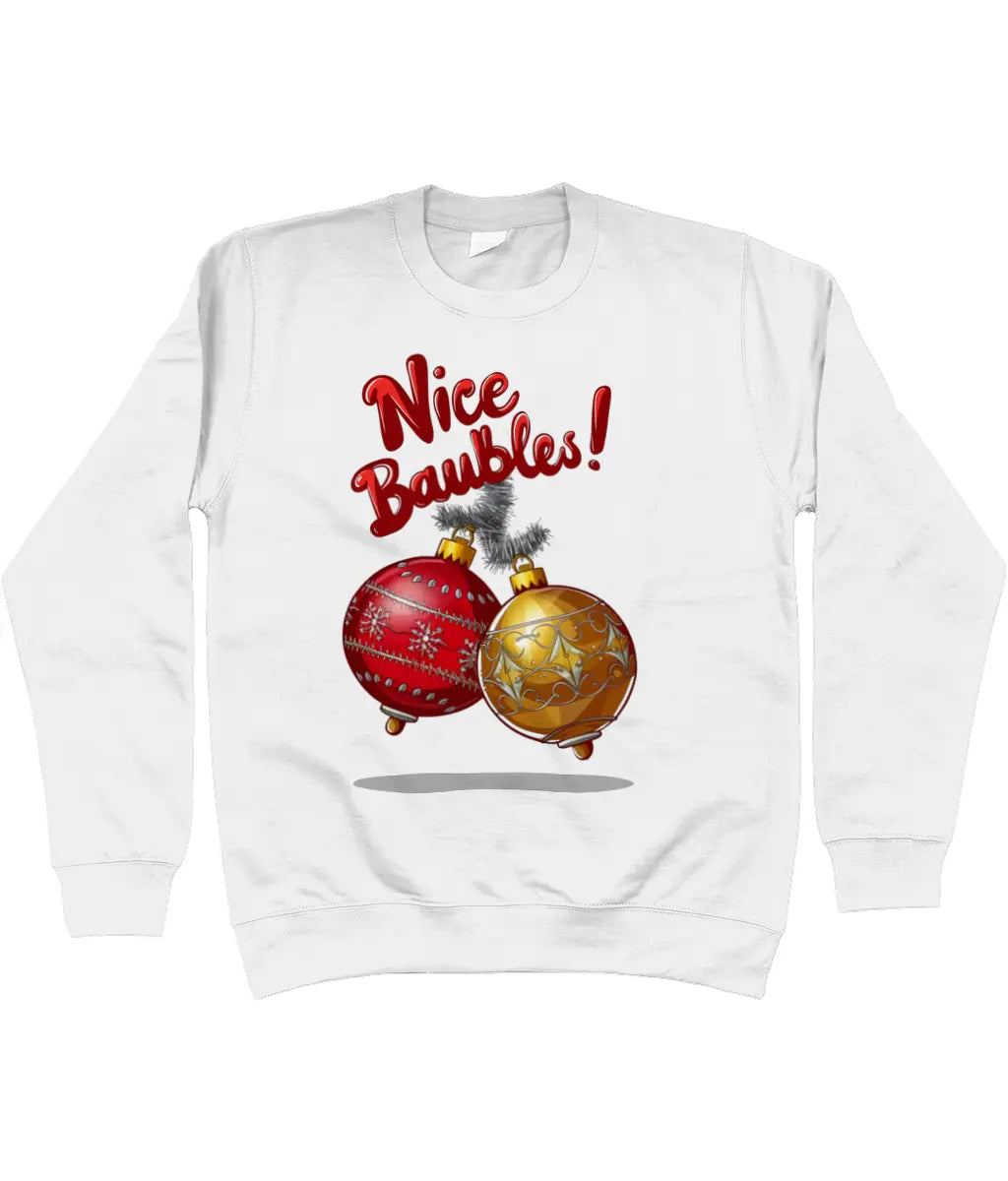 Funny Christmas Jumper, Get ready to sleigh this holiday season with our Christmas Jumper Sweatshirt! Featuring a festive "Nice Baubles" design, this sweatshirt is sure to bring some laughter to your holiday gatherings. Stay cosy and stylish while showing off your holiday spirit! Don't be a cotton-headed ninny muggins, get yours today!