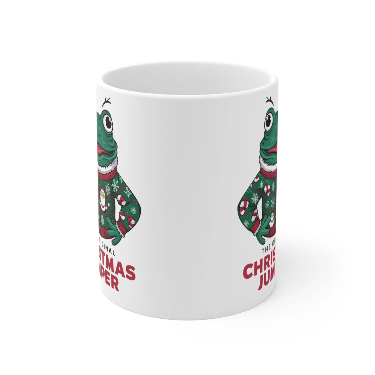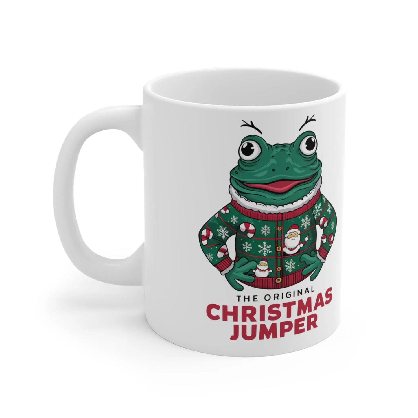 Funny Christmas Mug, Add some festive humour to your morning coffee routine with this Funny Christmas Mug featuring The Original Christmas Jumper Frog. Leap into the holiday spirit and get a laugh every time you take a sip. Perfect for gifting to friends and family or for using as a quirky addition to your mug collection!