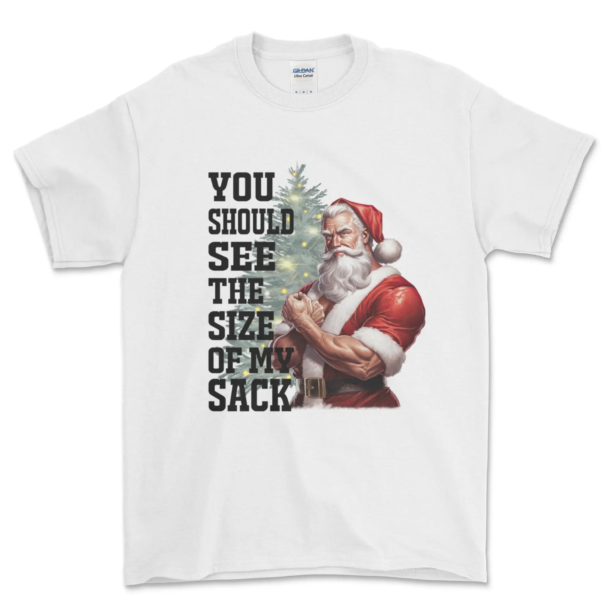 Funny Christmas T Shirt, Get ready for some holiday laughs with the White Christmas T Shirt - You Should See The Size Of My Sack! This playful shirt features a clever play on words and is sure to bring a smile to everyone's face. Spread some Christmas cheer with this quirky and fun t-shirt.