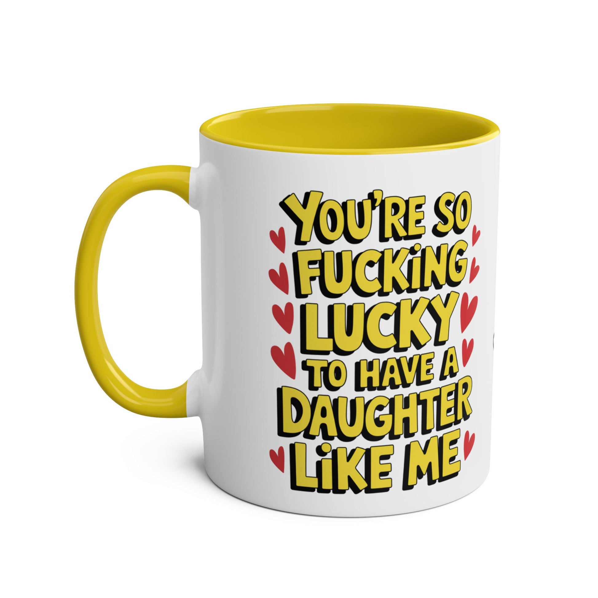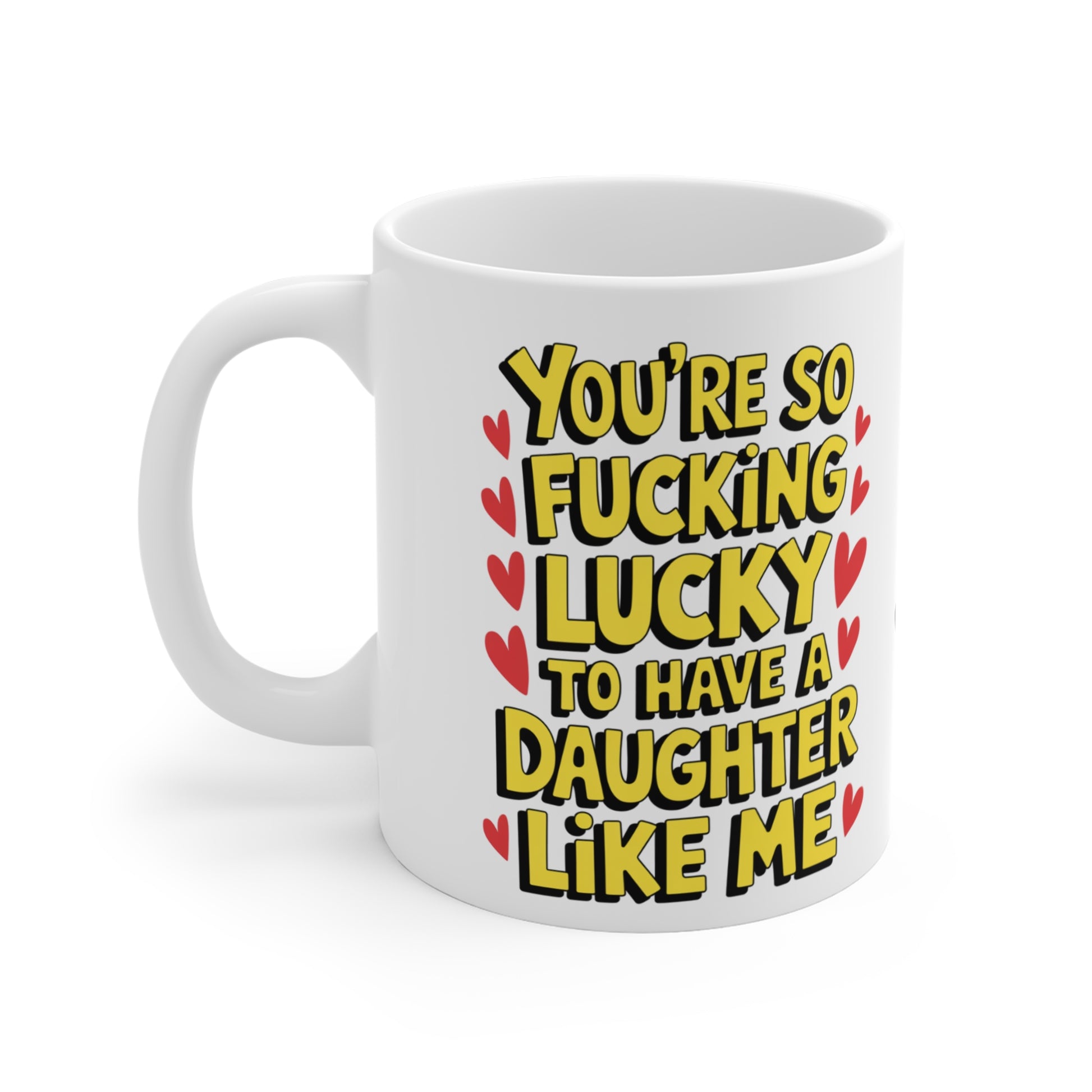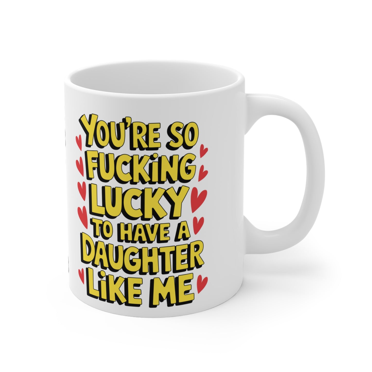 Funny Fathers Day Mug, Make Dad's day with this hilarious mug! Perfect for Father's Day, it features the phrase "Your Fucking Lucky To Have A Daughter Like Me" in bold letters, reminding him just how lucky he is to have you. Guaranteed to bring a smile to his face every morning!