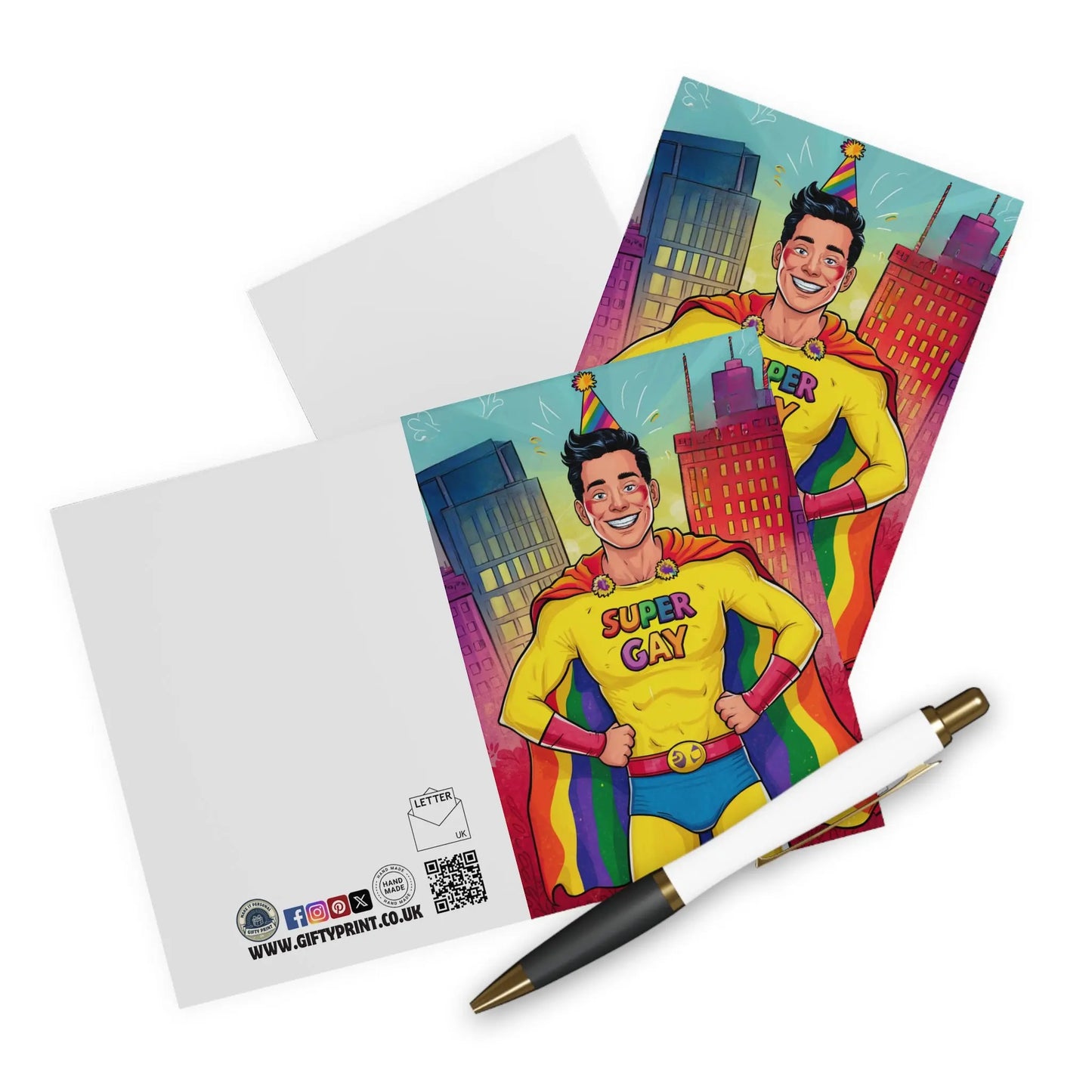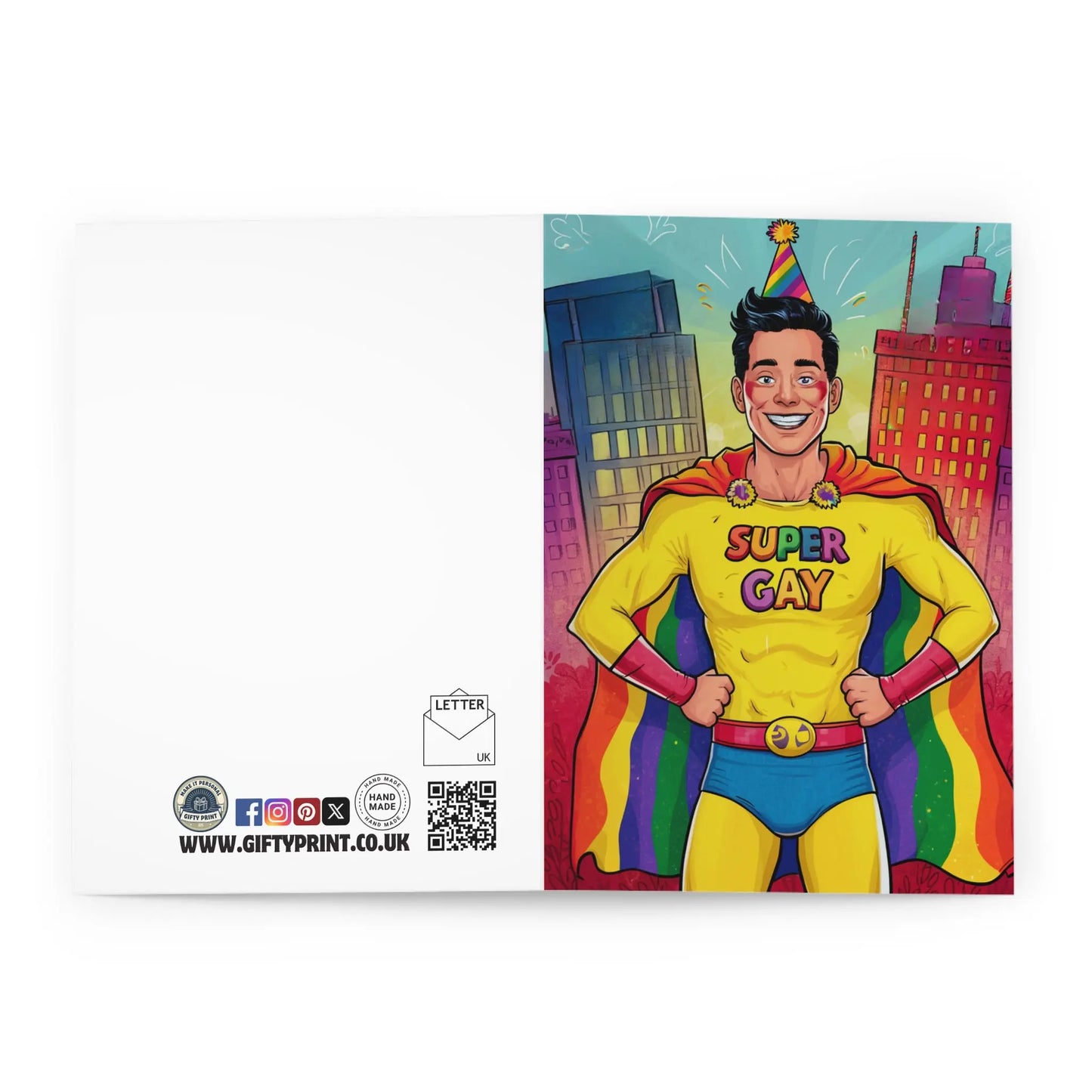 Funny Gay Birthday Card, Don't settle for a boring birthday card. Celebrate in style with our Gay Birthday Card featuring a super gay design and the message "Happy Birthday Super Gay!" Perfect for showing your pride and making someone smile on their special day. No more basic birthday wishes here.