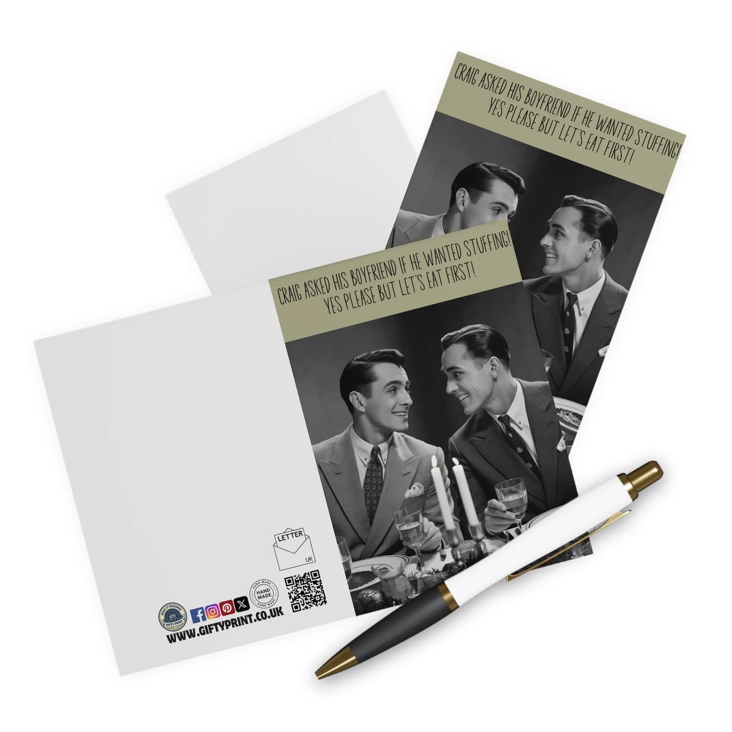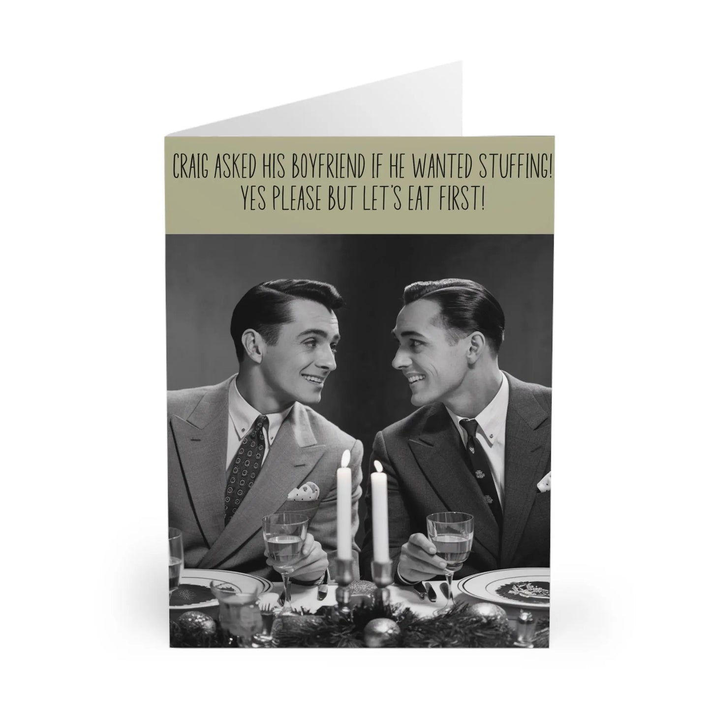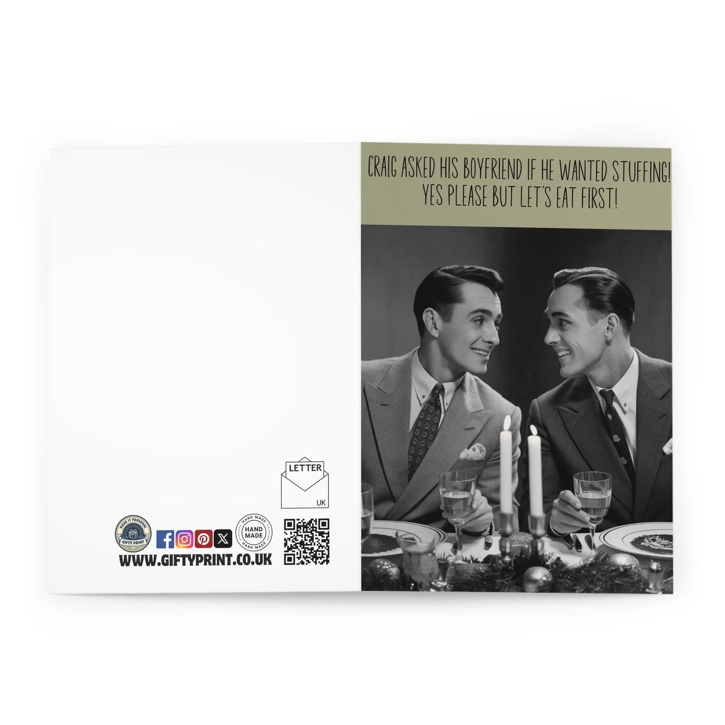 Funny Gay Christmas Card, Spread some cheer with our Personalised Gay Christmas Card, featuring the playful phrase "Do You Want Stuffing" (wink wink). Perfect for couples who love to have a good laugh! Personalise it with your own names for an even more special touch. Get ready for a holly, jolly holiday!