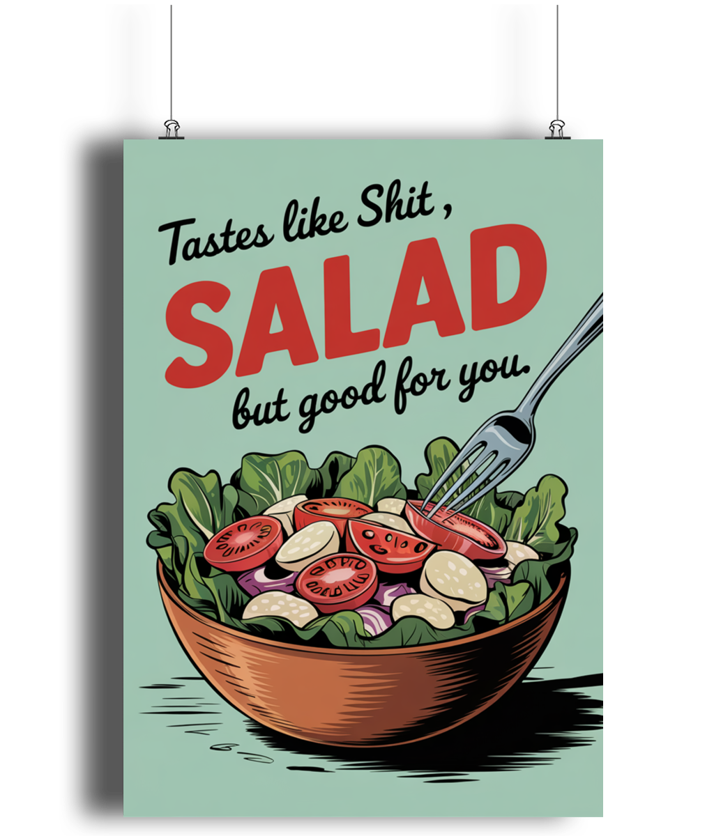 Funny Kitchen Wall Art , Elevate your kitchen decor with this hilarious wall art piece! Featuring the phrase "Salad Tastes Like Shit But Good For You," this unique art adds a touch of humour to your everyday routine. Made with high-quality materials, this art is not only funny but also durable. Perfect for any kitchen, it's a fun reminder of the benefits of healthy eating.