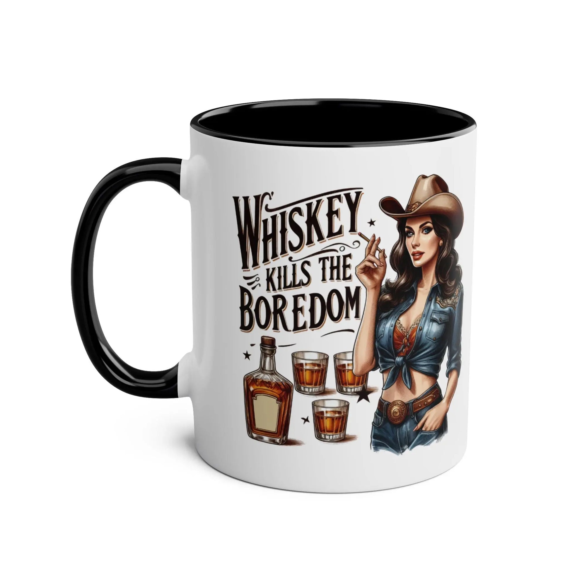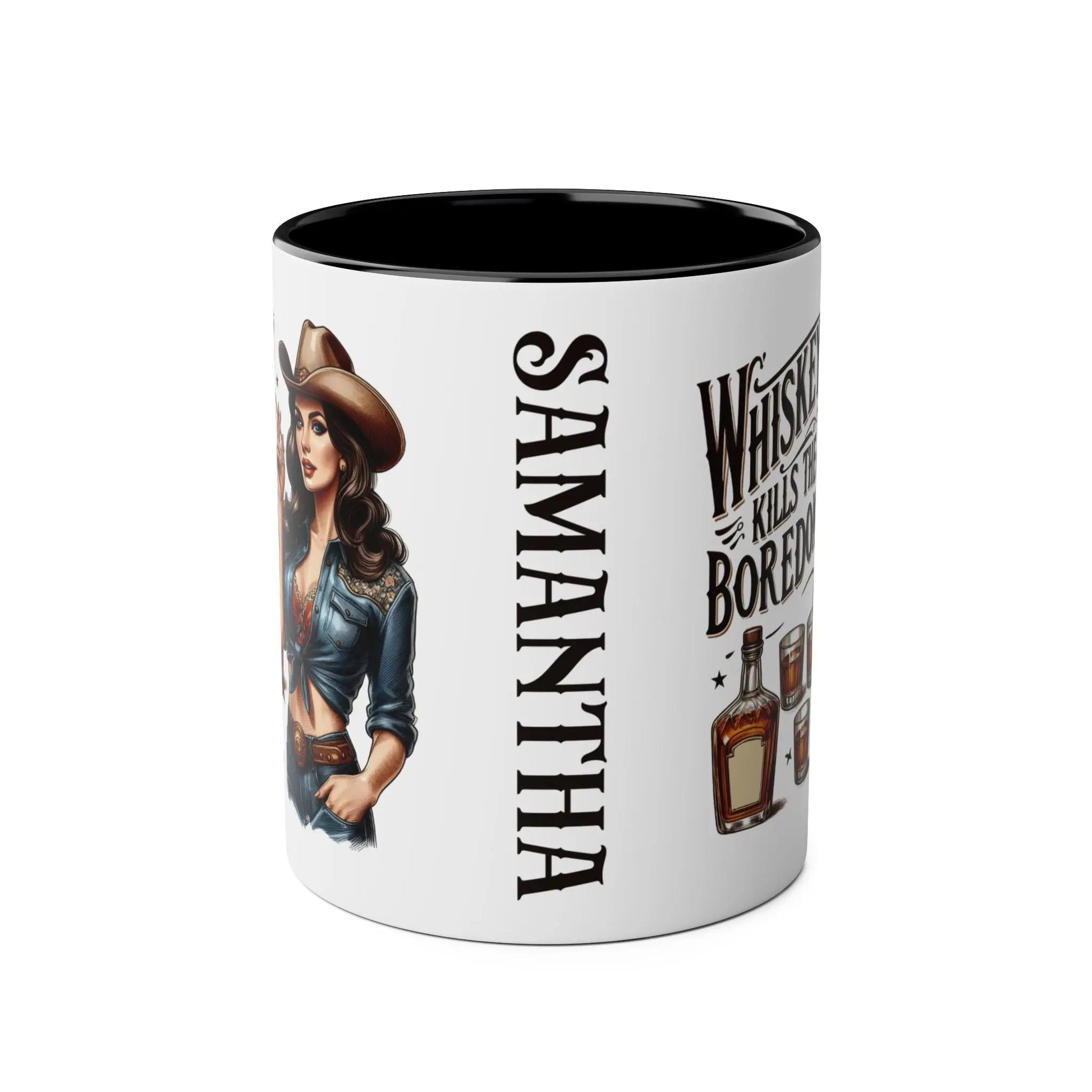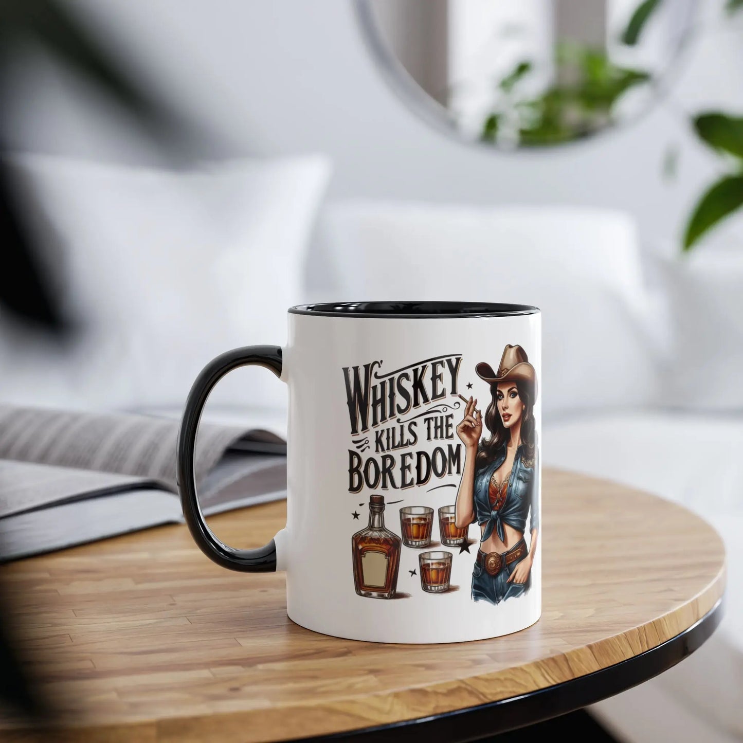 Funny Quote Mug, Say goodbye to boring mornings with our Personalised Whiskey kills Boredom Black Mug! Featuring a unique design and your own personalisation, this mug is the perfect addition to your morning routine. Sip in style and bring some fun to your day!