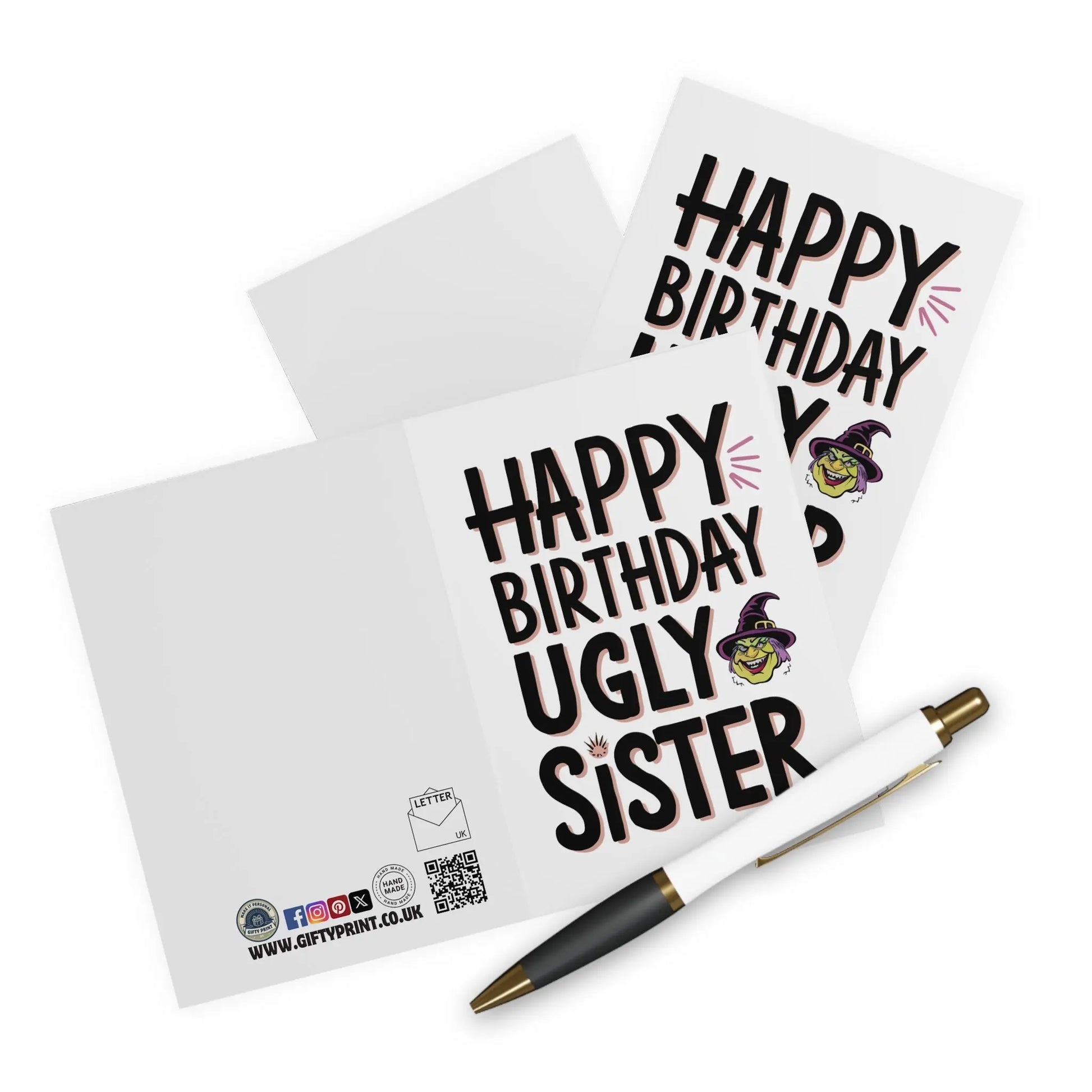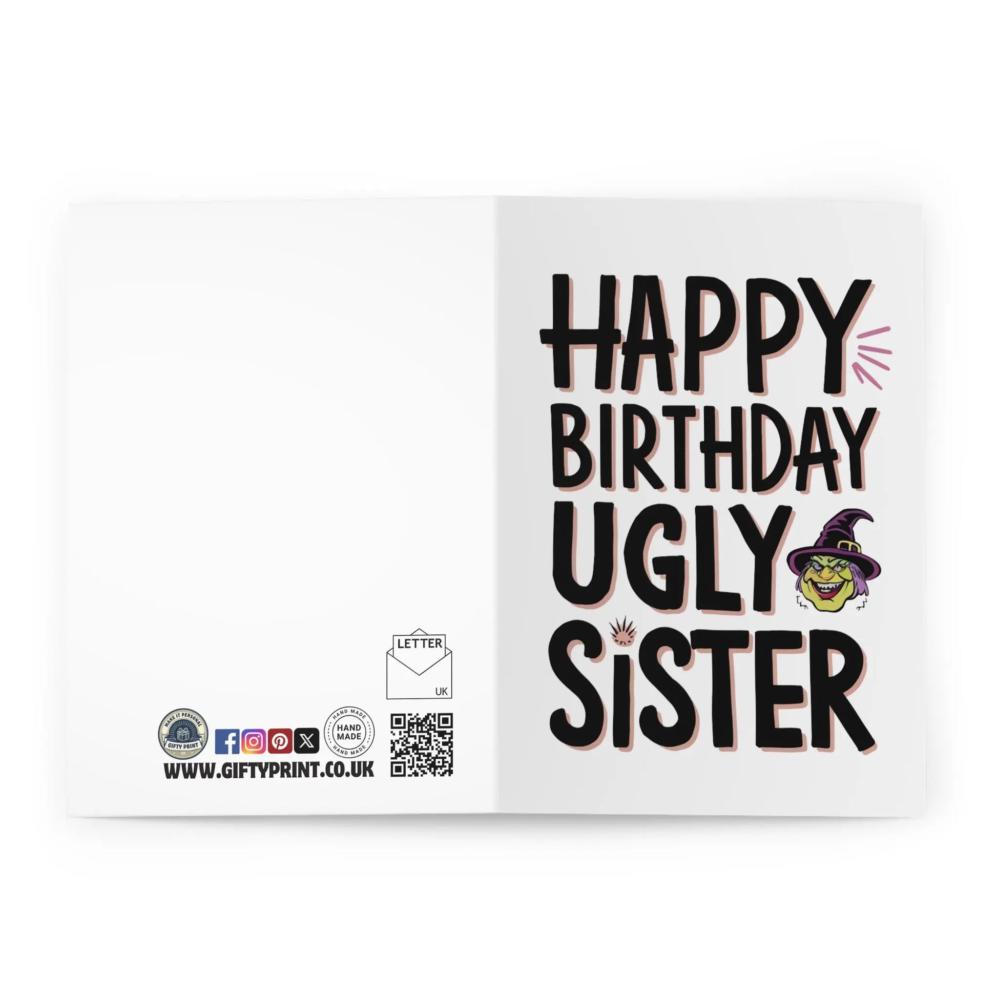 Funny Sister Birthday Card, Make your sister laugh (and cringe) with this Happy Birthday Ugly Sister Birthday Card. Perfect for the sibling who doesn't take themselves too seriously, this card is sure to bring a smile to their face. No need for a serious sentiment here, just a quirky and playful message to celebrate your sister's special day!