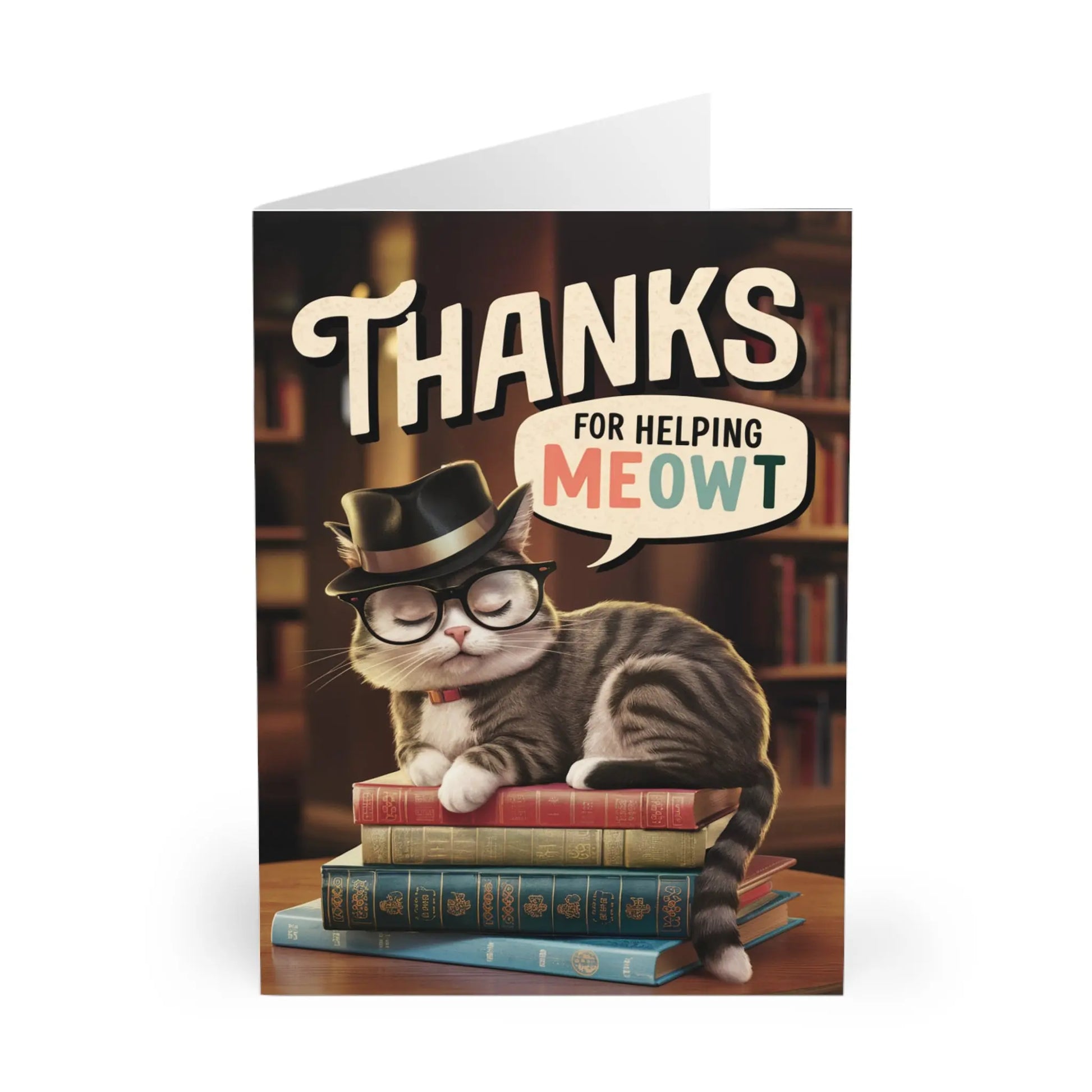 Funny Thank You Card, Show your appreciation with our Thank You Card Cat! This quirky card features a feline friend thanking you for your help ("meowt") in a playful way. Perfect for any occasion, spread some smiles and gratitude with this punny card.