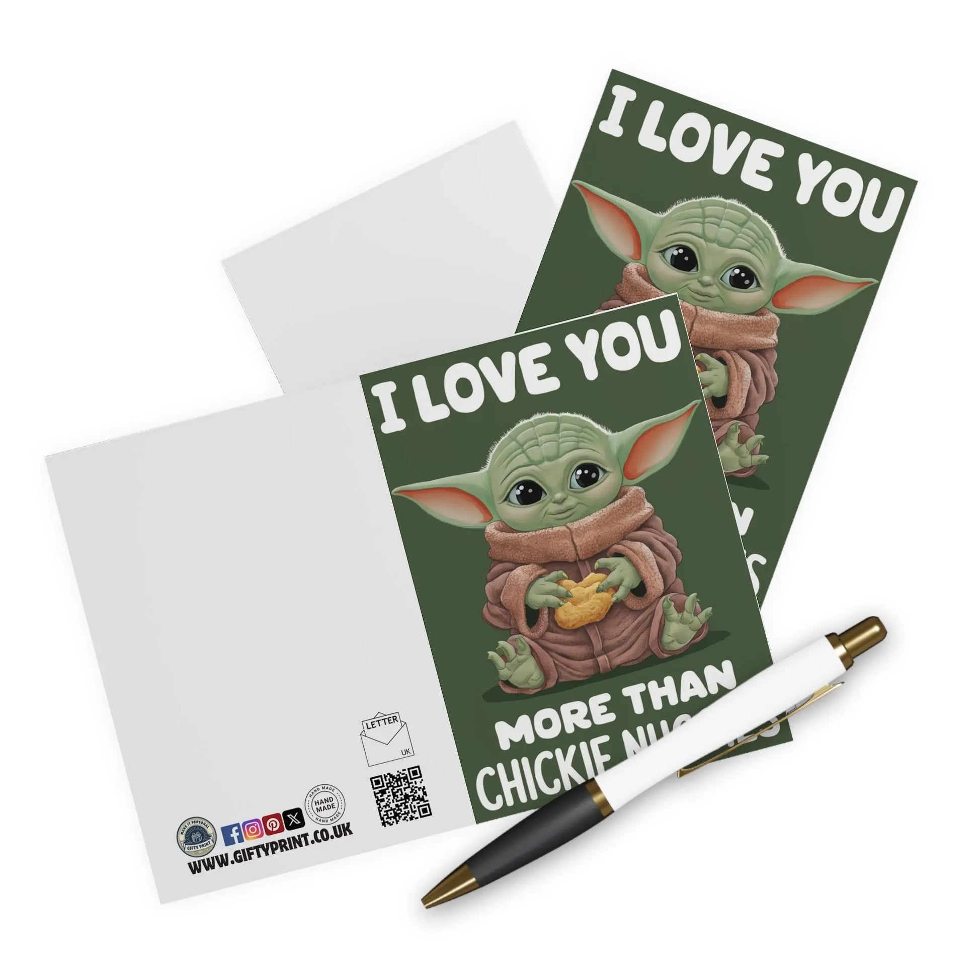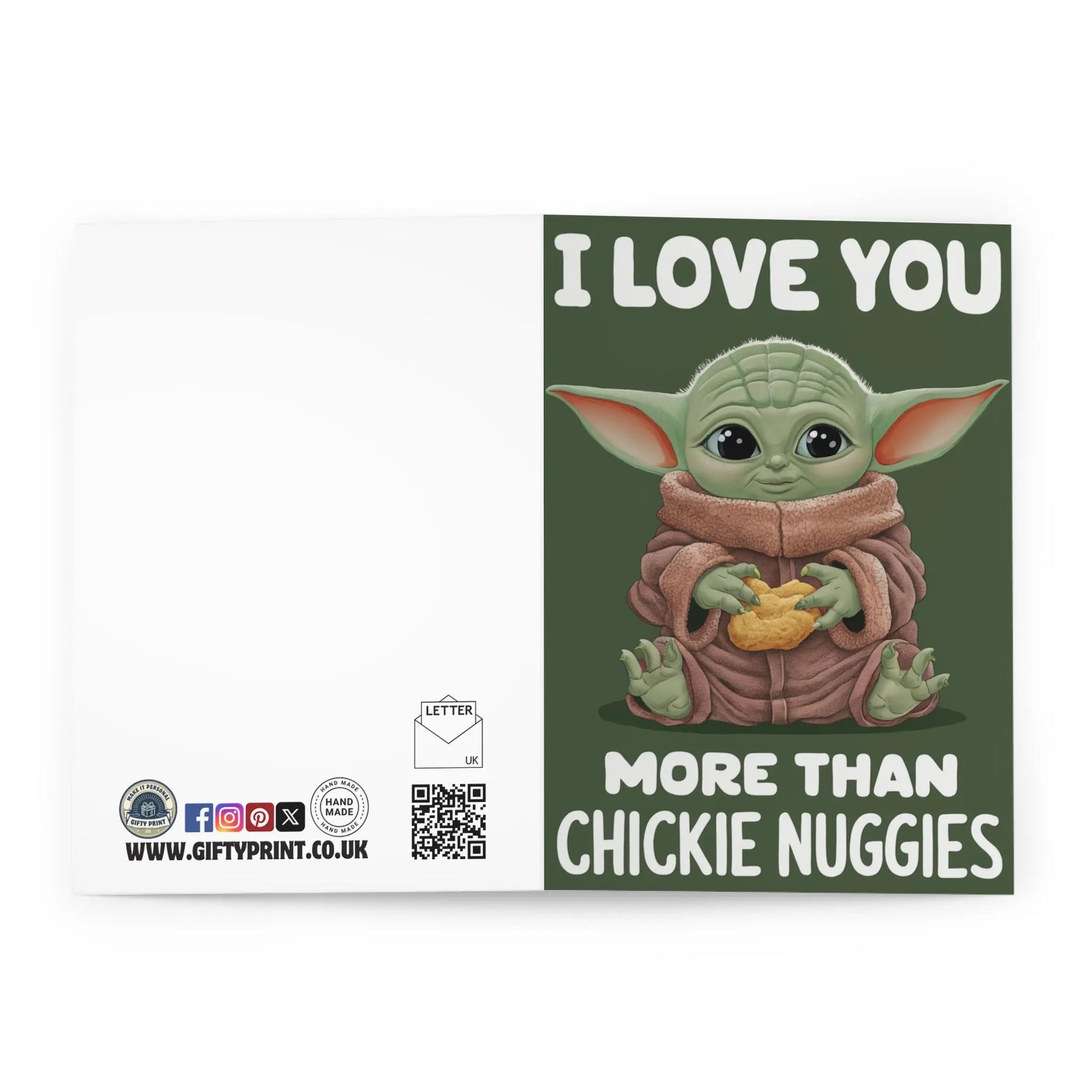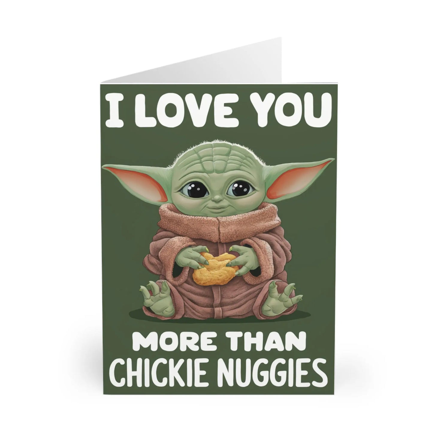 Funny Valentines Day Card, Show your love this Valentine's Day with our Baby Yoda themed card that declares "I Love You More Than Chickie Nuggies". A perfect way to show your significant other how much they mean to you, with a playful and quirky touch. Give them a heartfelt laugh and sentiment that will surely make them feel special.
